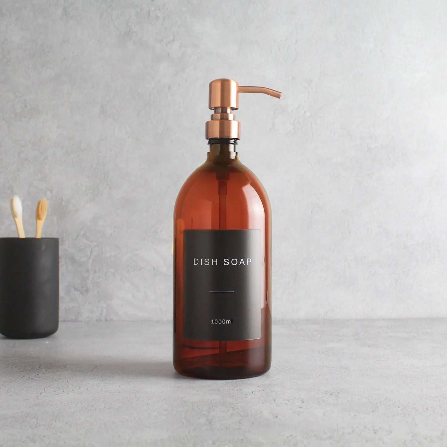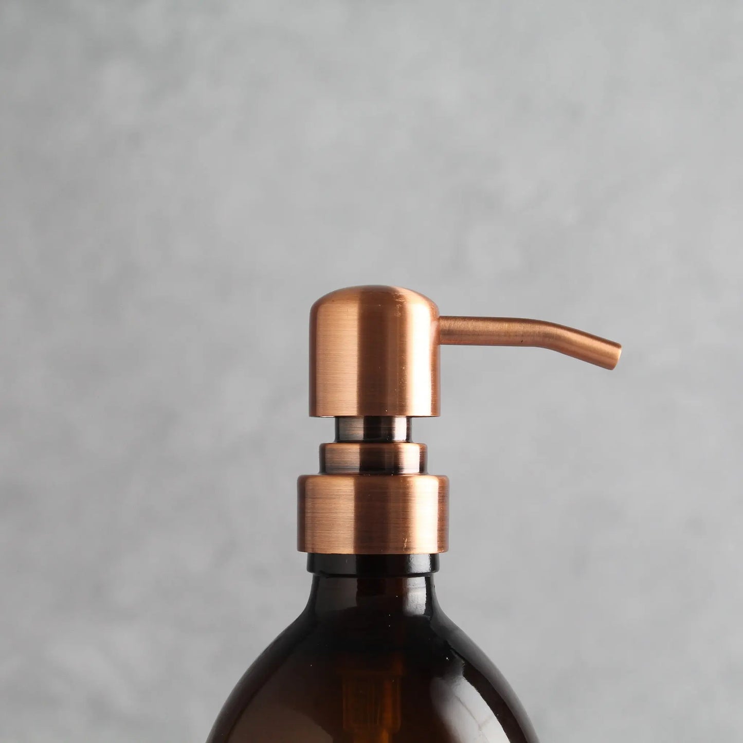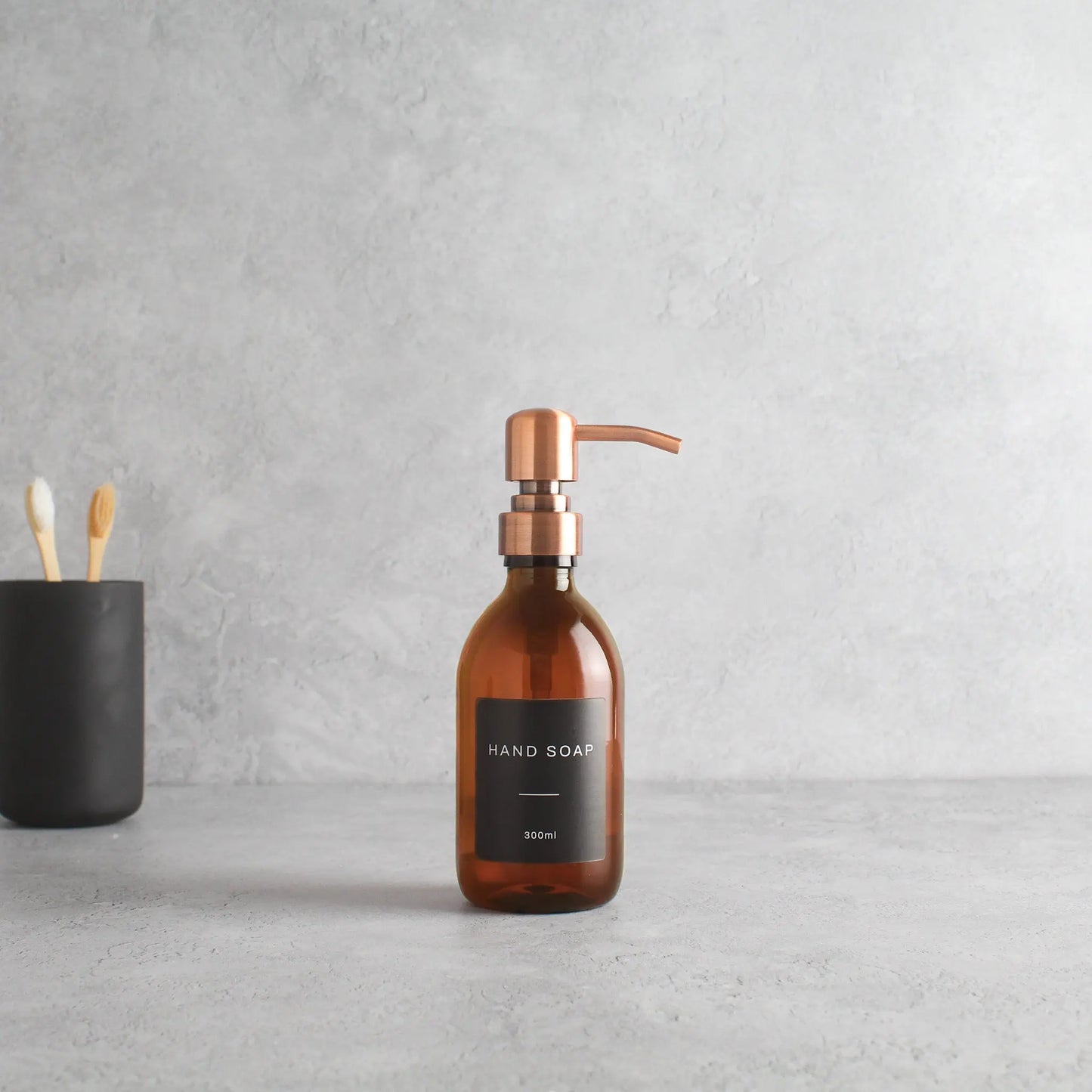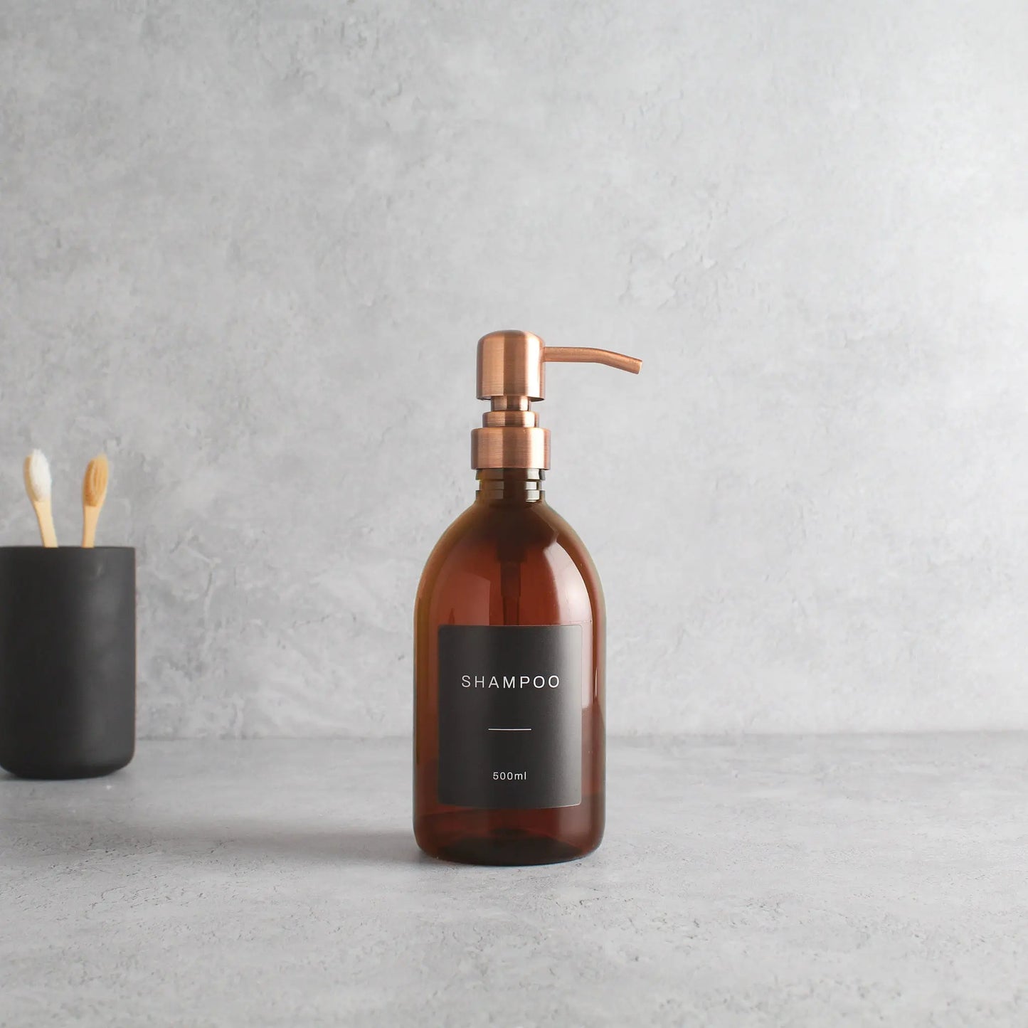 Labelled Amber Plastic Dispenser Bottle With Rose Gold Pump