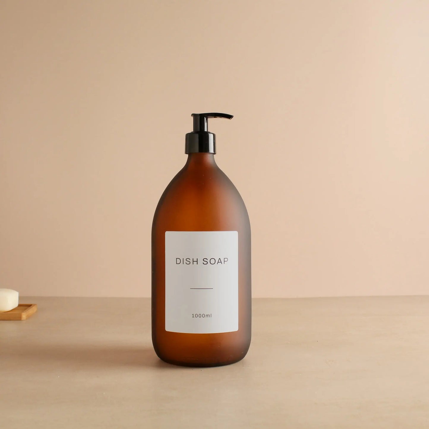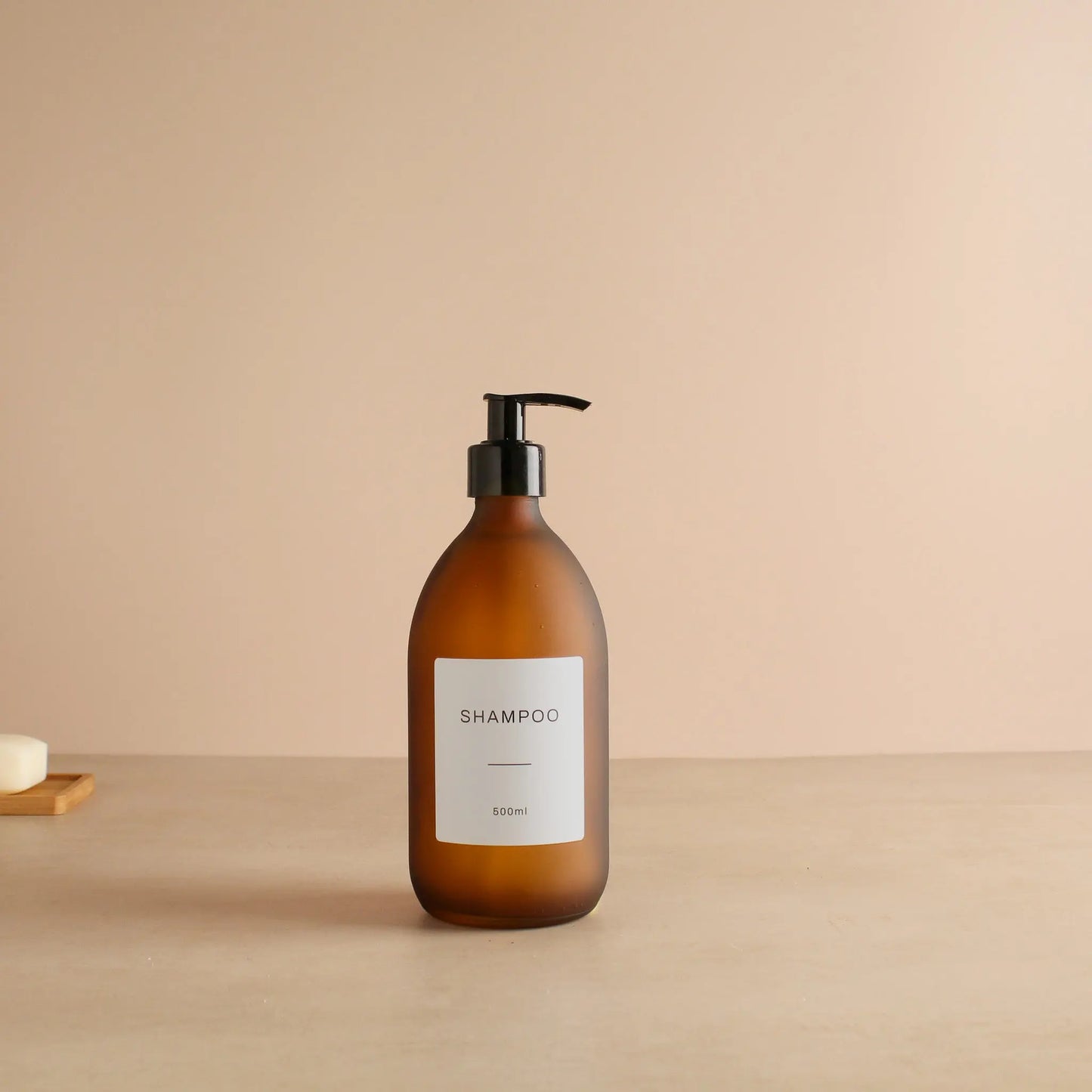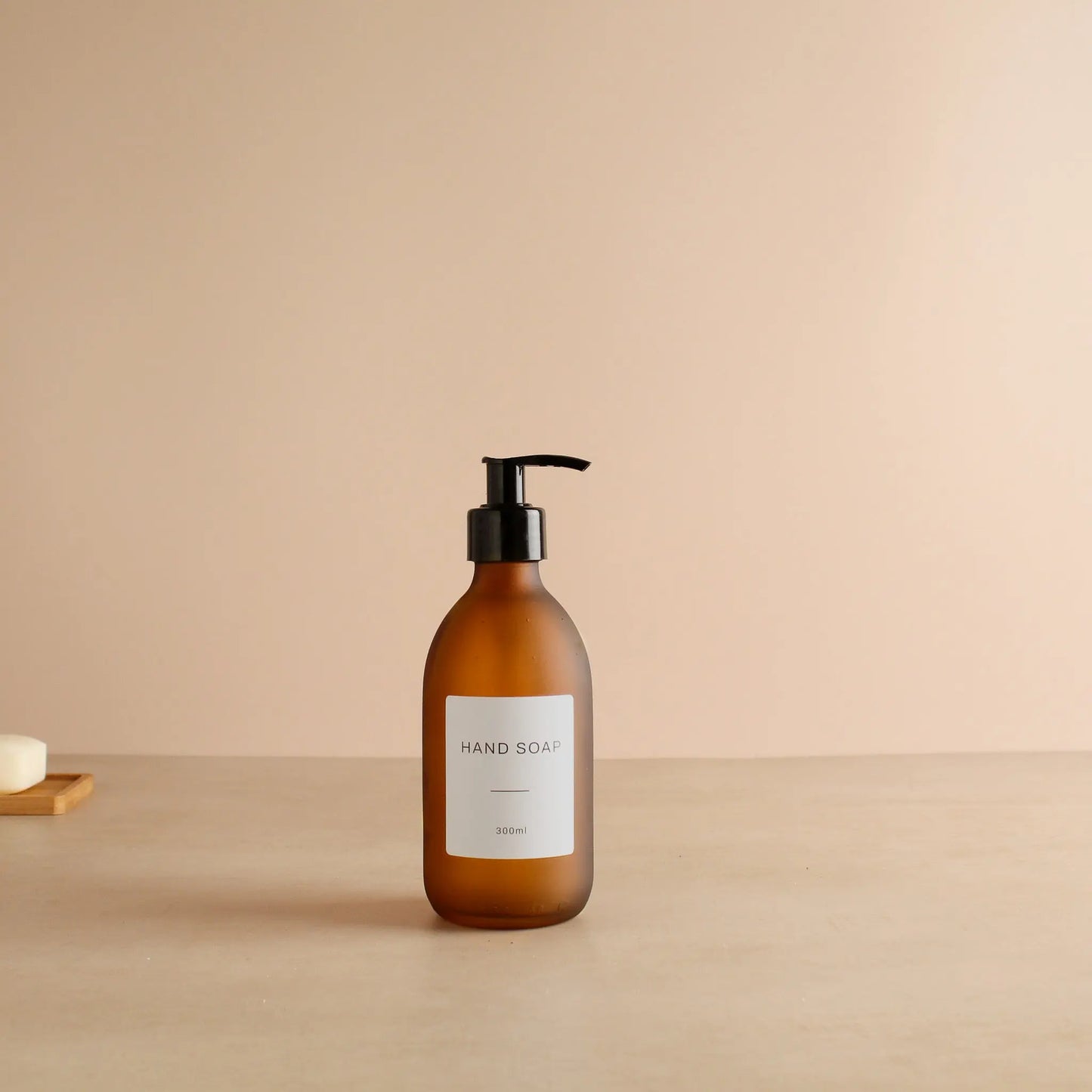 Labelled Frosted Amber Glass Dispenser Bottle With Black Pump