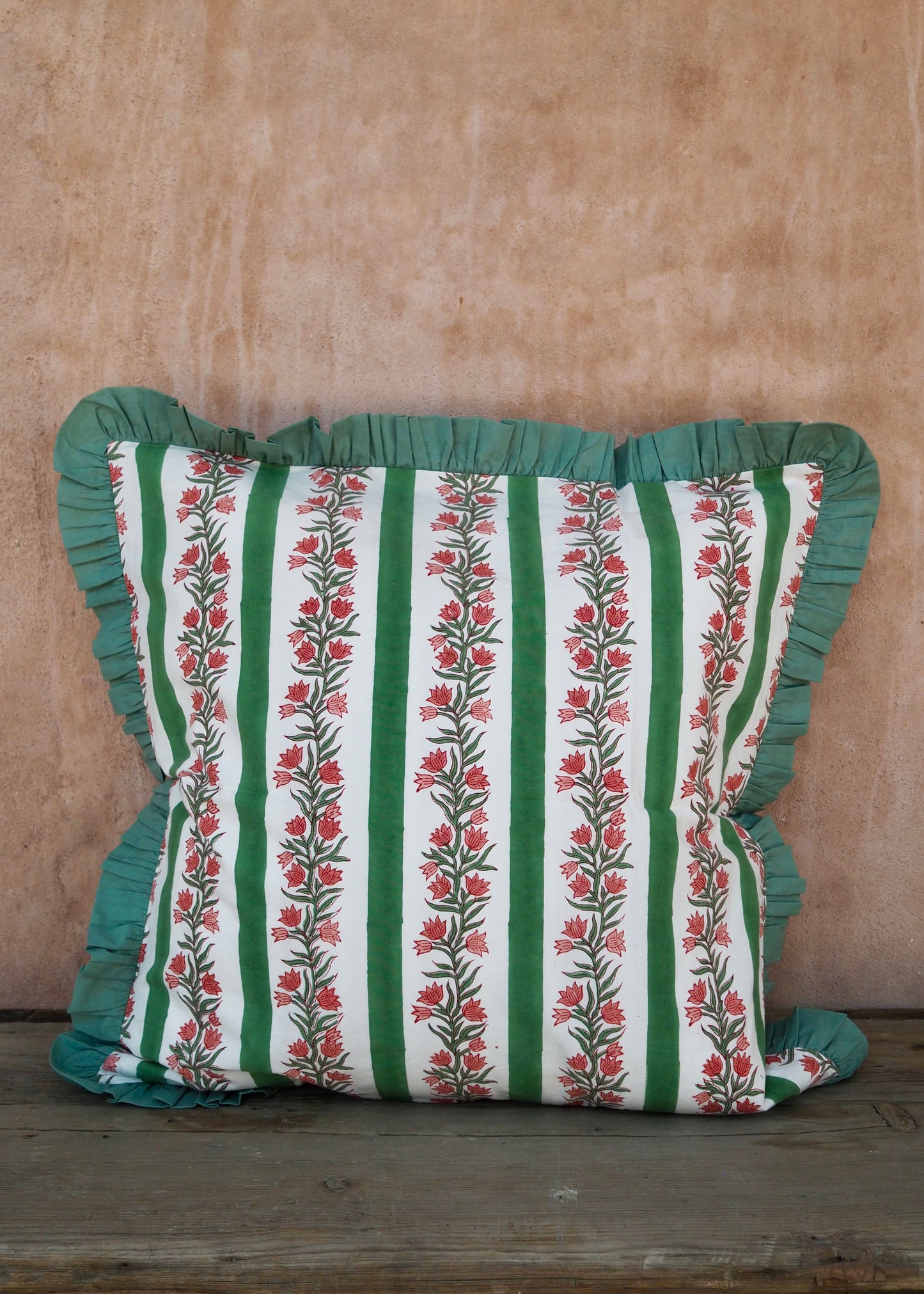 Add a touch of timeless elegance to your space with this beautifully handcrafted cushion cover. Measuring 65 x 65 cm, it features a stunning hand-block printed design, complemented by a solid-colour frill for an extra touch of charm.