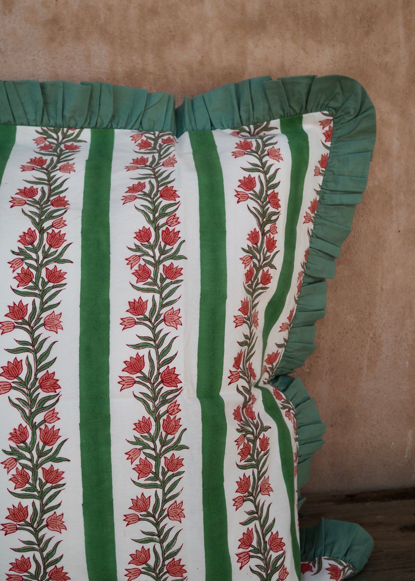 Regular price £45.50Add a touch of timeless elegance to your space with this beautifully handcrafted cushion cover. Measuring 65 x 65 cm, it features a stunning hand-block printed design, complemented by a solid-colour frill for an extra touch of charm.
