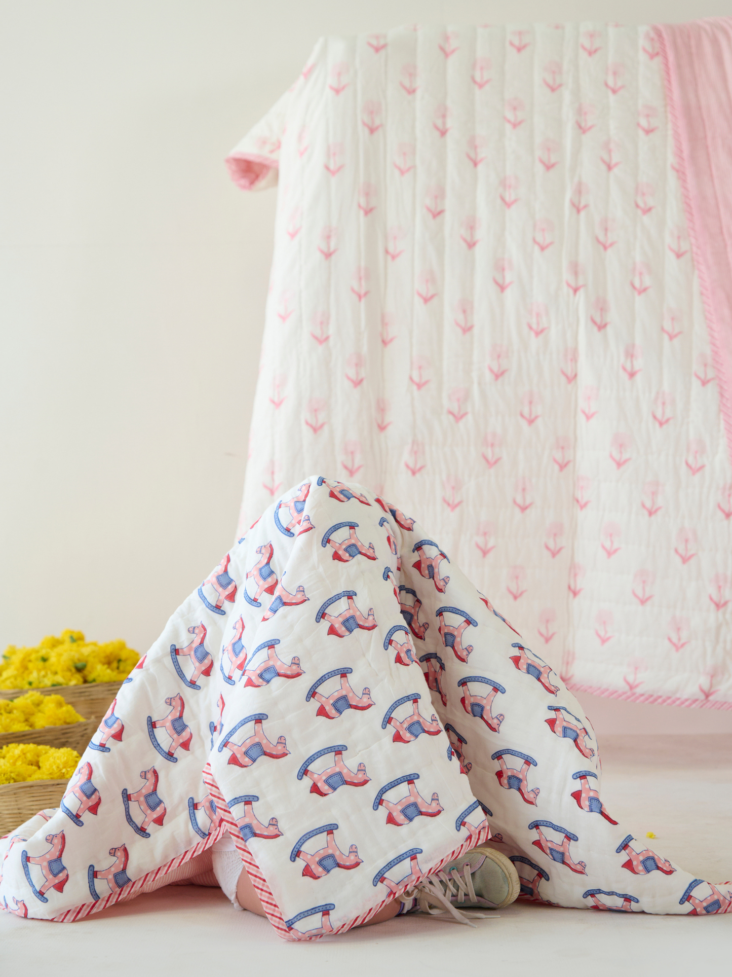 A large organic cotton cot / toddler quilt. The toddler quilt size can be used in a variety of ways including as a cot quilt, bed quilt, play mat and pram blanket. The are a super lovely addition to a bedroom or nursery.