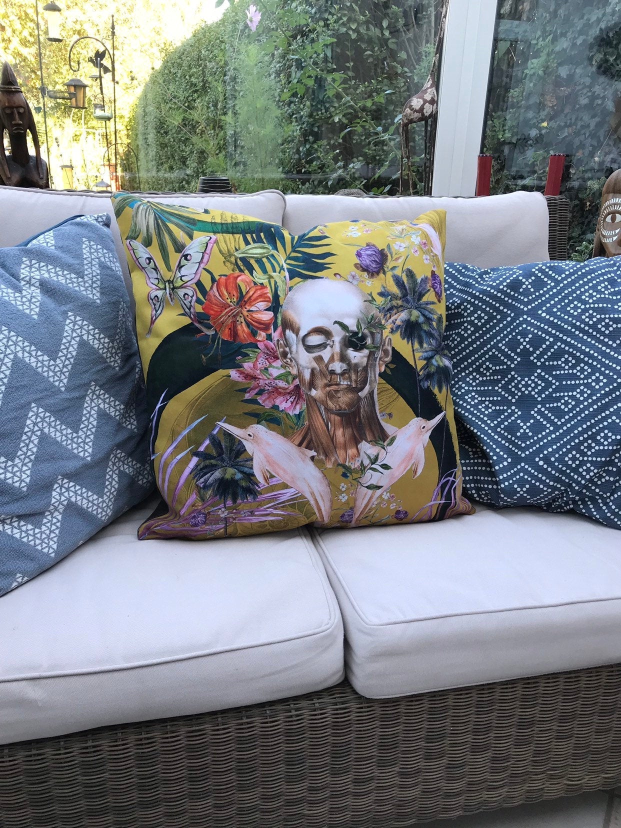 Large Yellow Cushion Watercolour skull design 'Boto Cushion' in Vegan friendly Suede