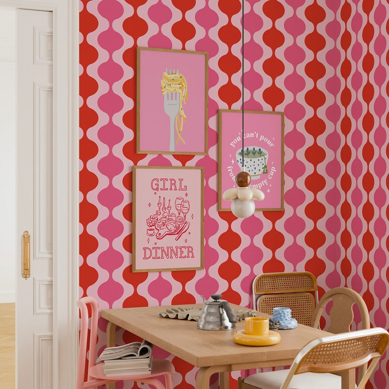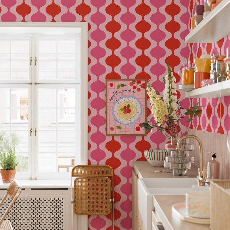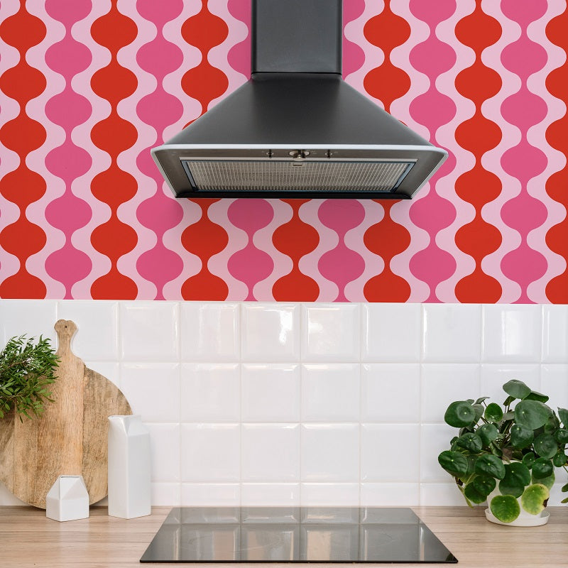 Bring a touch of retro charm into your home with our “Lava Lamp” wallpaper – a playful take on mid-century style. Featuring bold wiggle stripes that flow like liquid light, this design is the perfect mix of vintage and modern. The red and pink colourway adds personality and character, making it ideal for kitchens, living rooms, or feature walls.