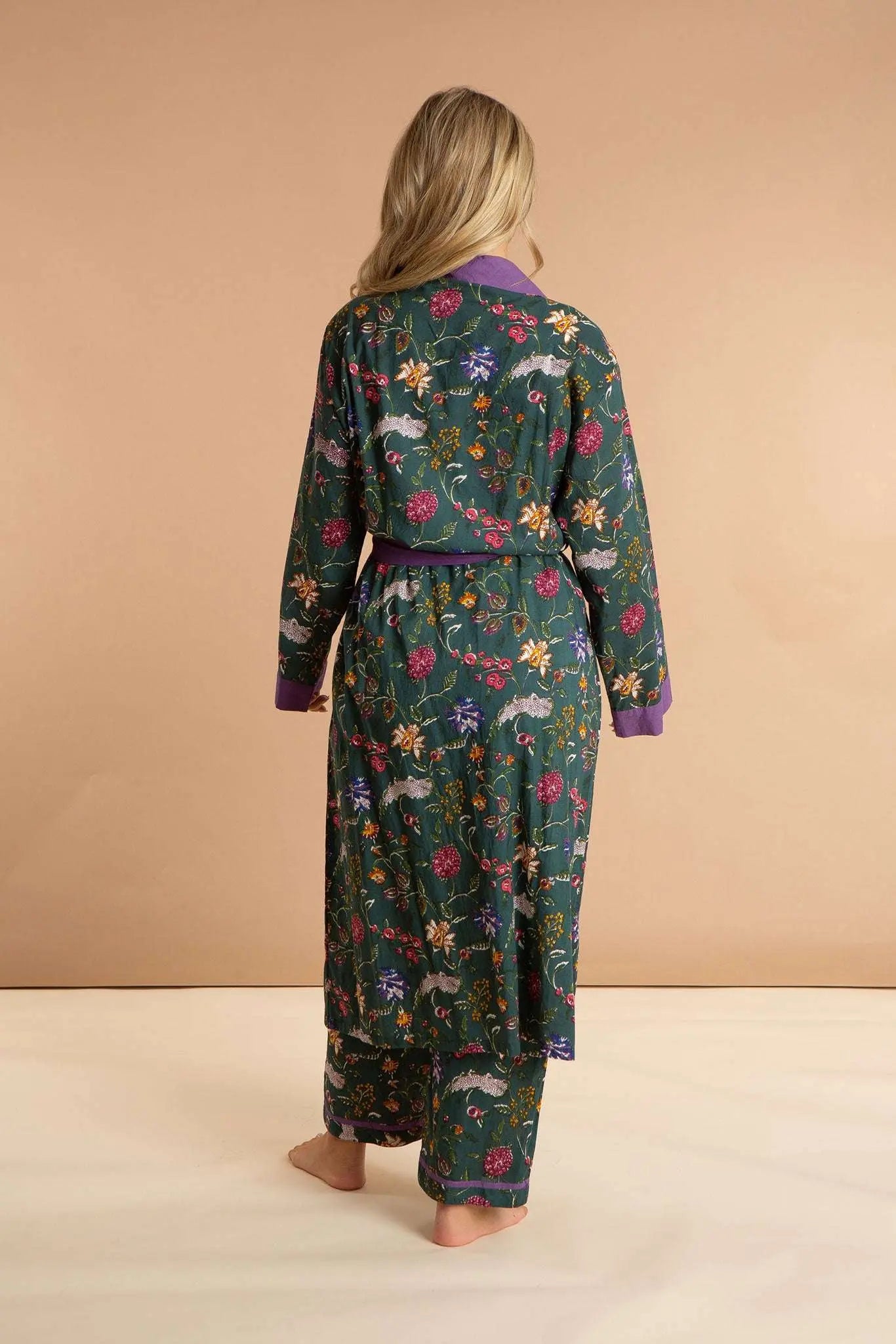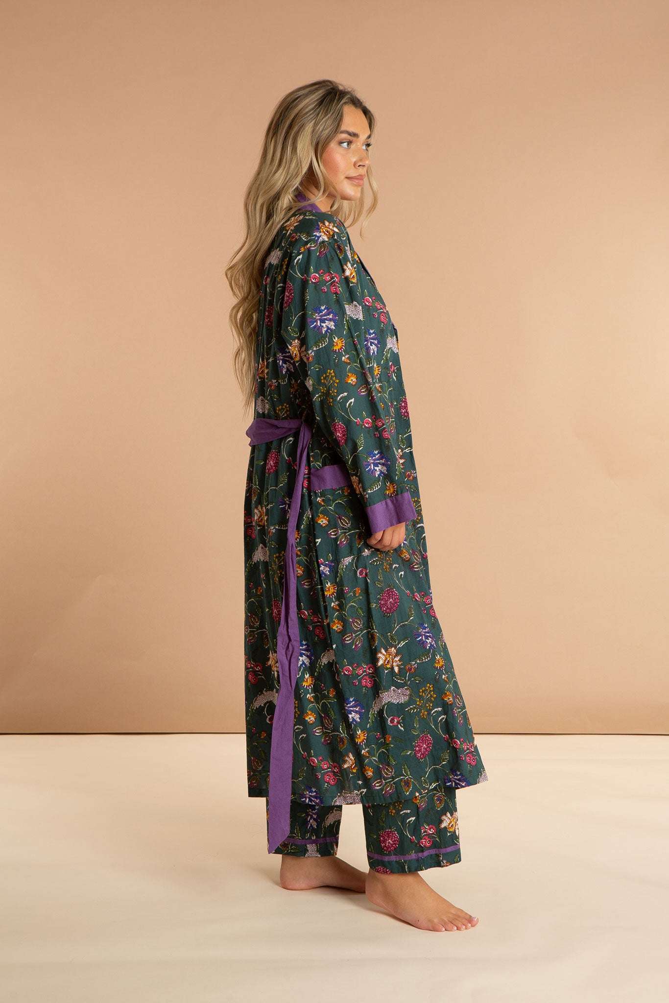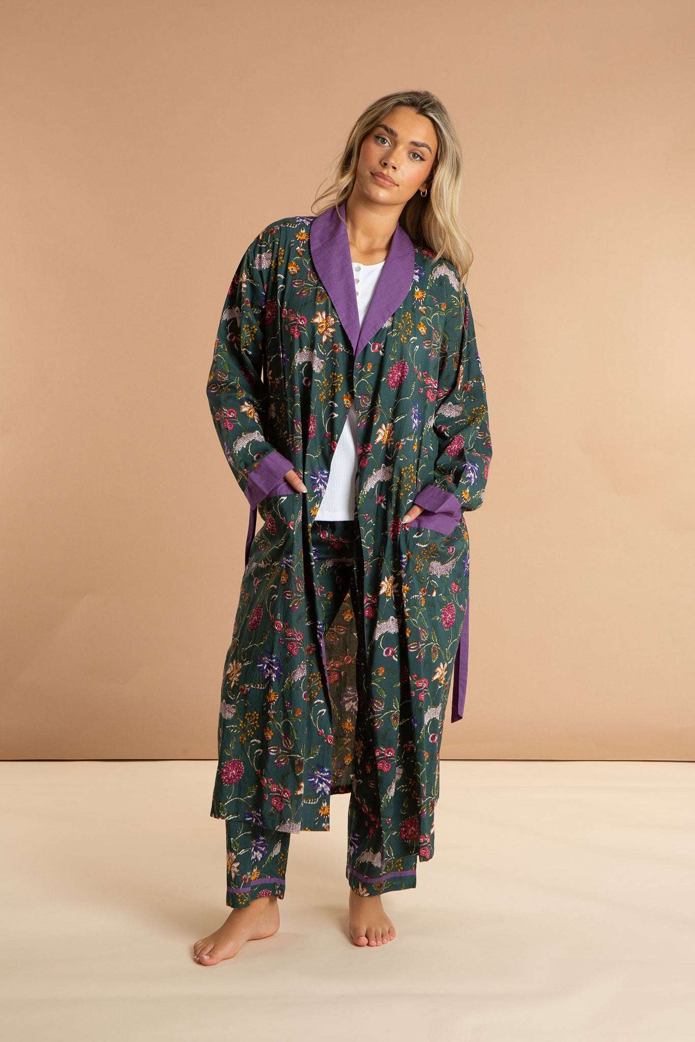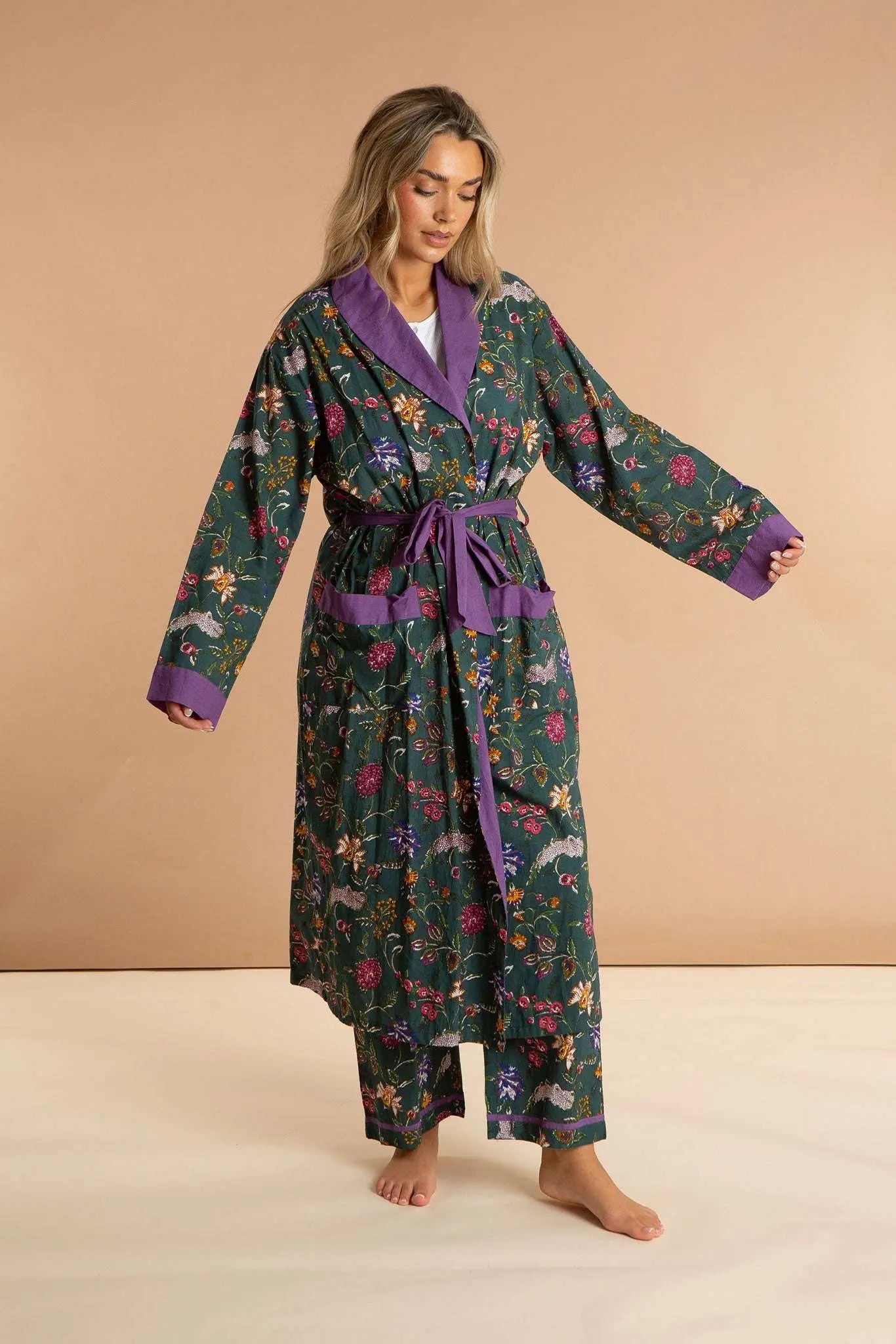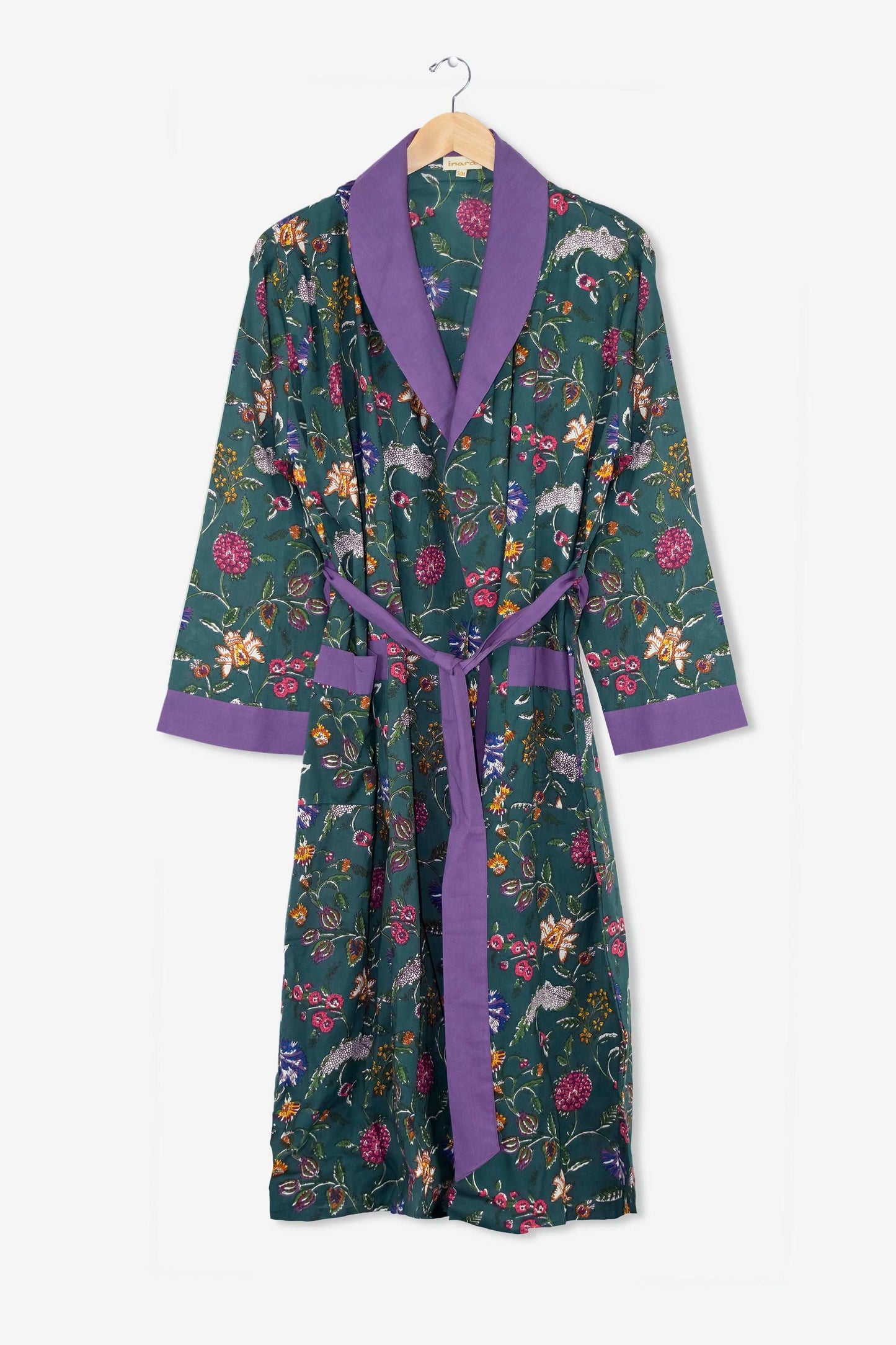 Our Lavender Fields women's cotton robe has a pattern inspired by the UK's lavender bloom. Featuring deep pockets, a bold purple contrast collars, and an inner drawstring for security, this luxury dressing gown is made from soft and breathable 100% Indian cotton. The multicoloured floral print pattern has a deep forest green background paired perfectly with rich purple detailing, making a full length robe that is too fabulous to only wear at home.