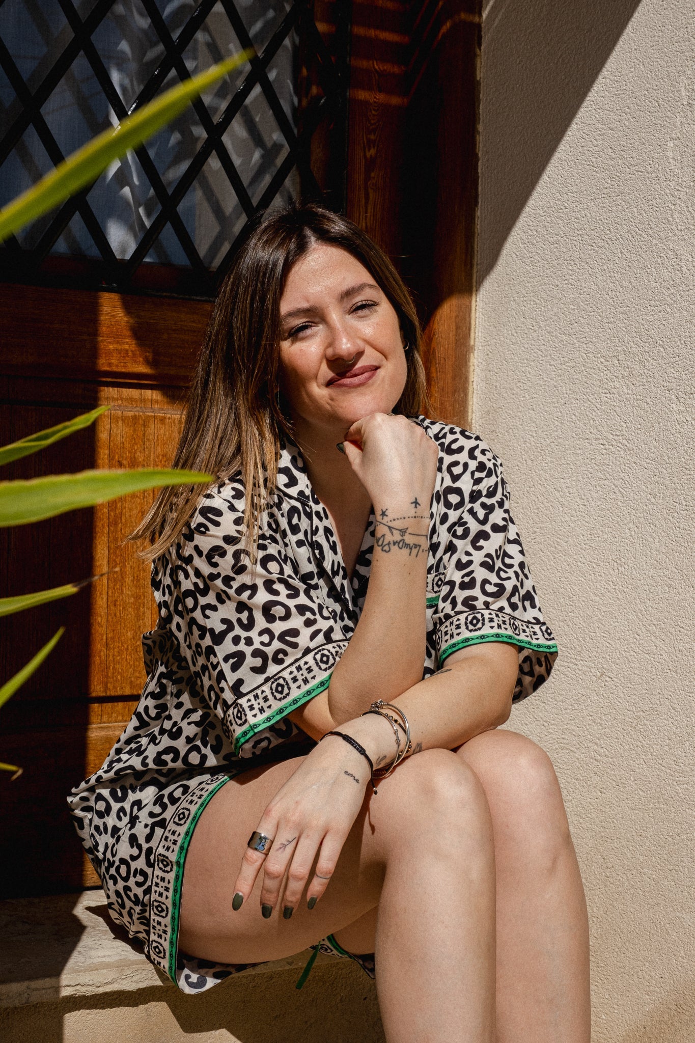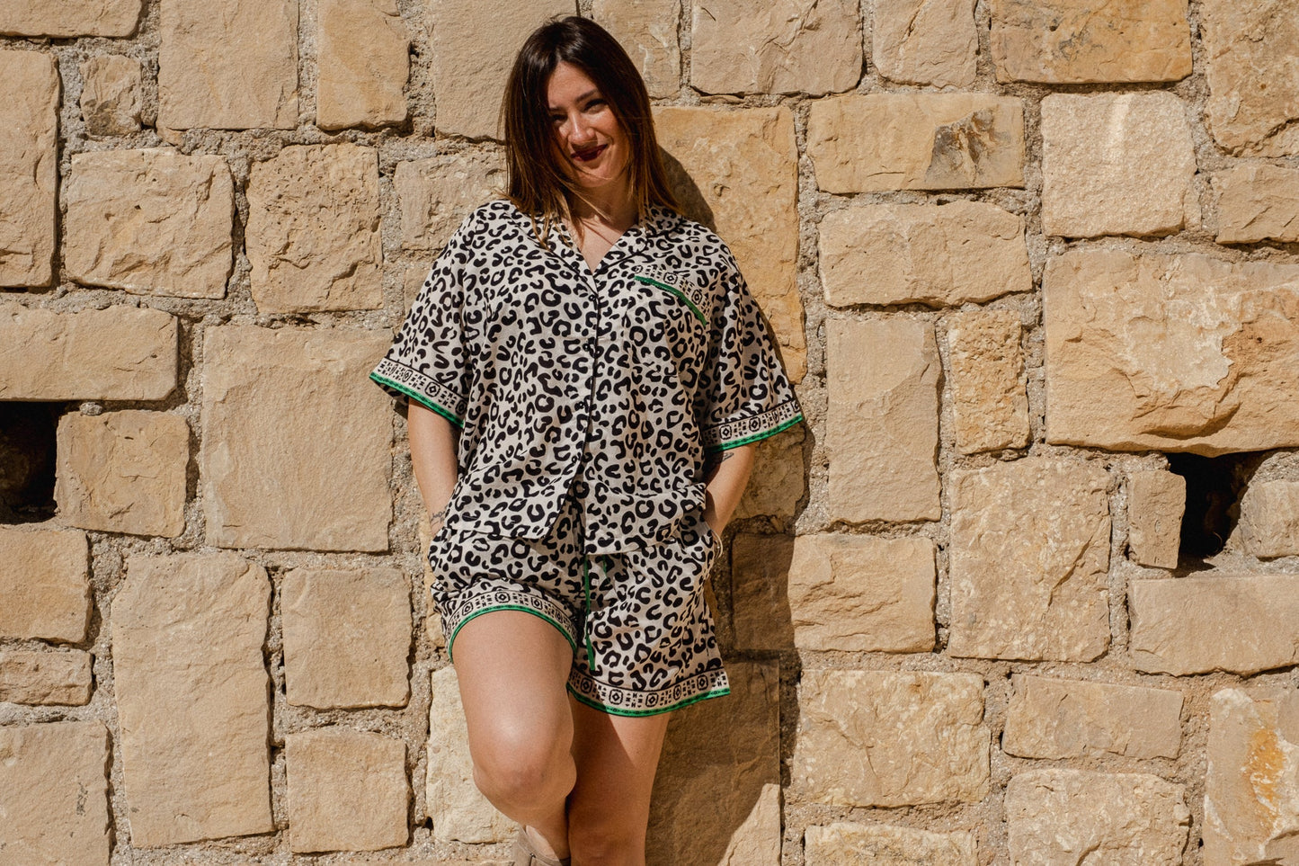 - Chic leopard print with contrast green accents on pockets and sleeves.