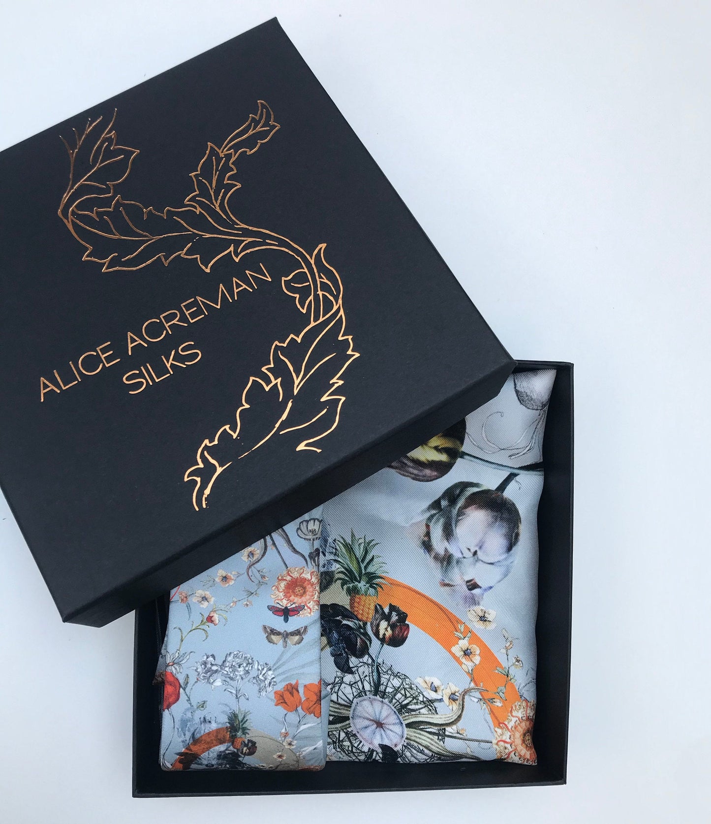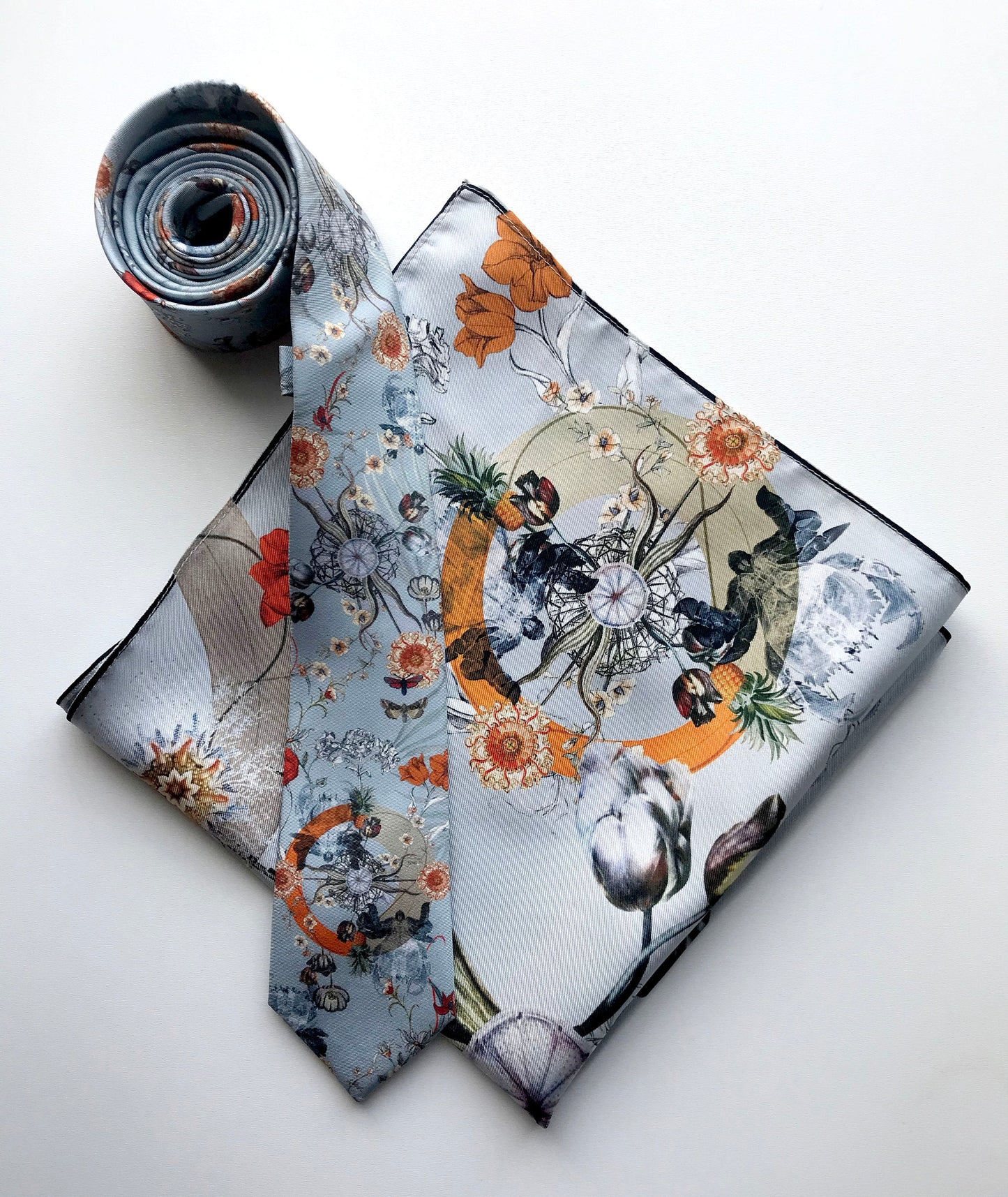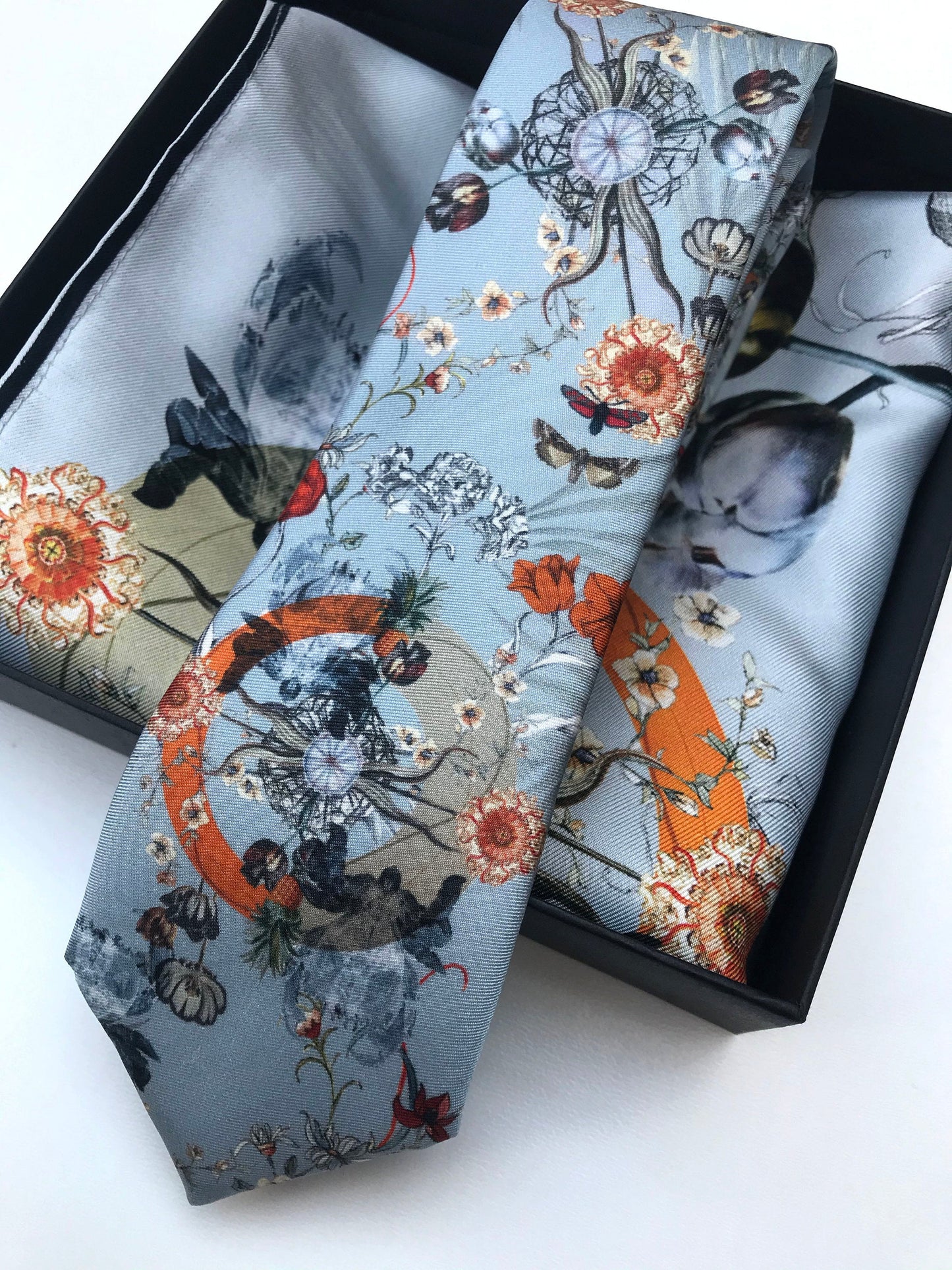 The unique design was inspired by the infinite complexities of nature and the fascinating theory of evolution with details including scientific illustration style tulips and x-ray image of a crab, moths and pineapples. The colour palette of pale blue, orange and grey are an usual but complimentary combination of colours and work very well when worn with a Navy or grey suit.