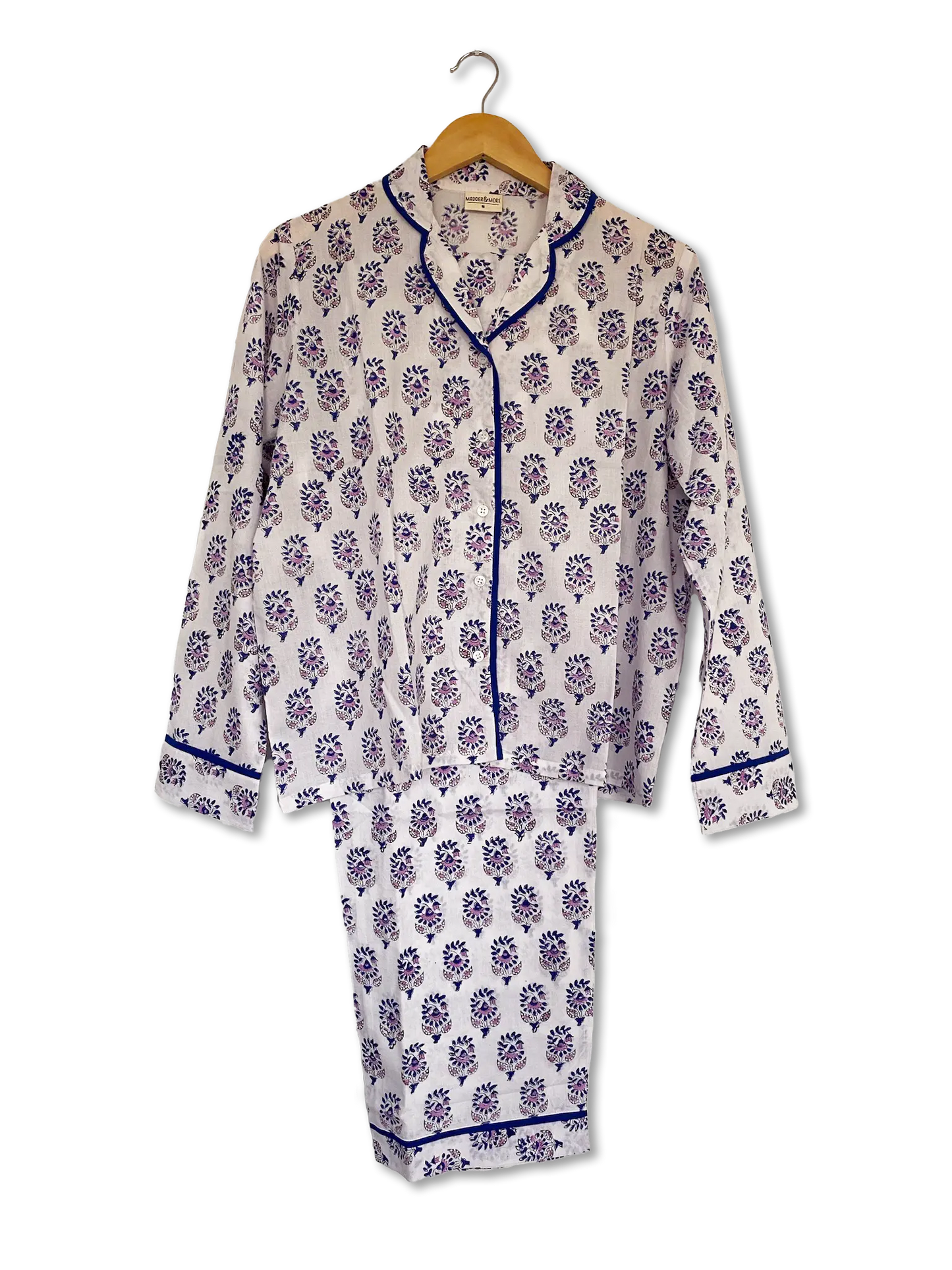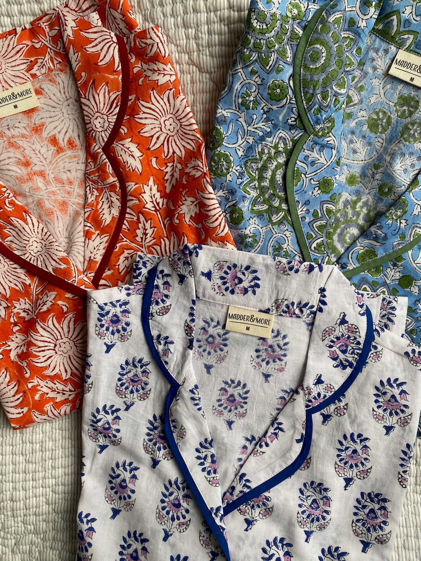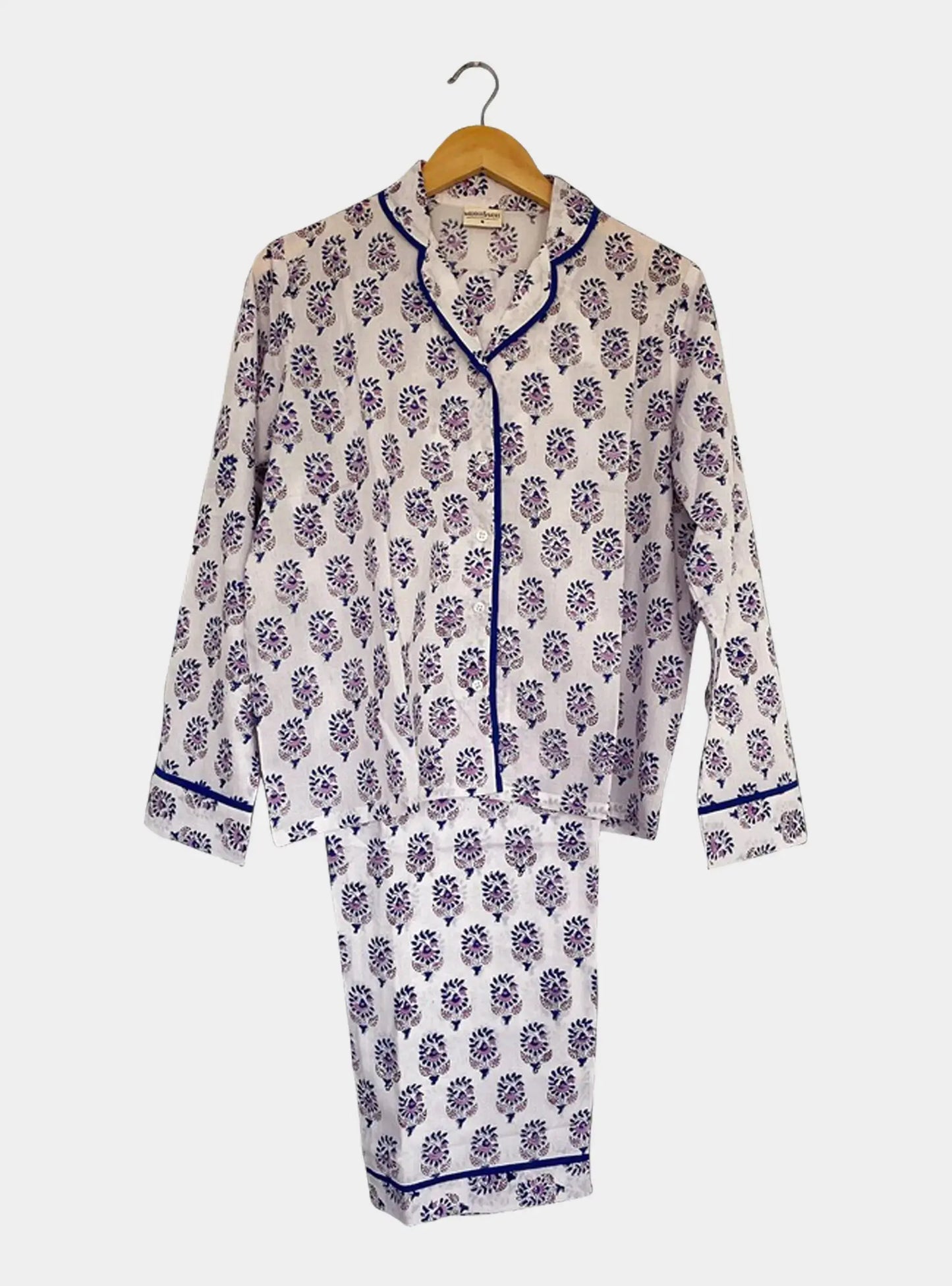 Our block printed long pyjama sets are handmade in Jaipur. The fabric is hand printed so please allow for discrepancies in designs as each set is unique.