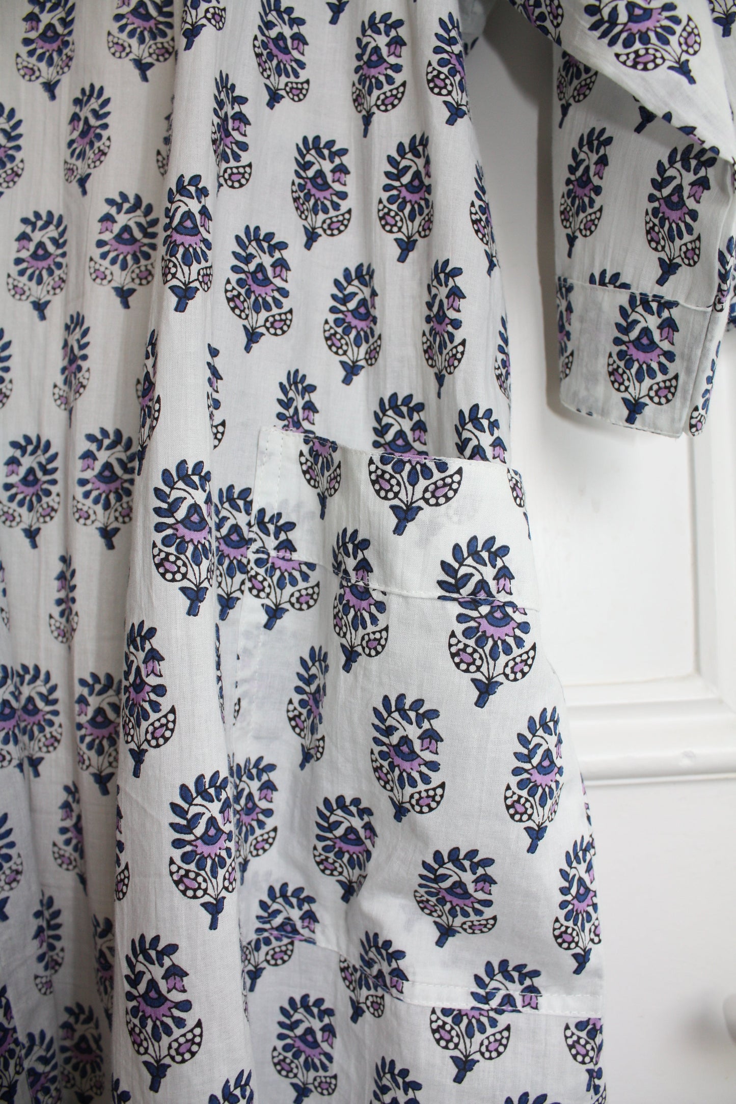 Our printed robes are handmade in Jaipur and are perfect for warm summer nights, lazy days at home and to throw on at the beach. They are made with light, floaty cotton, have two pockets and a waist tie, and come in one size.