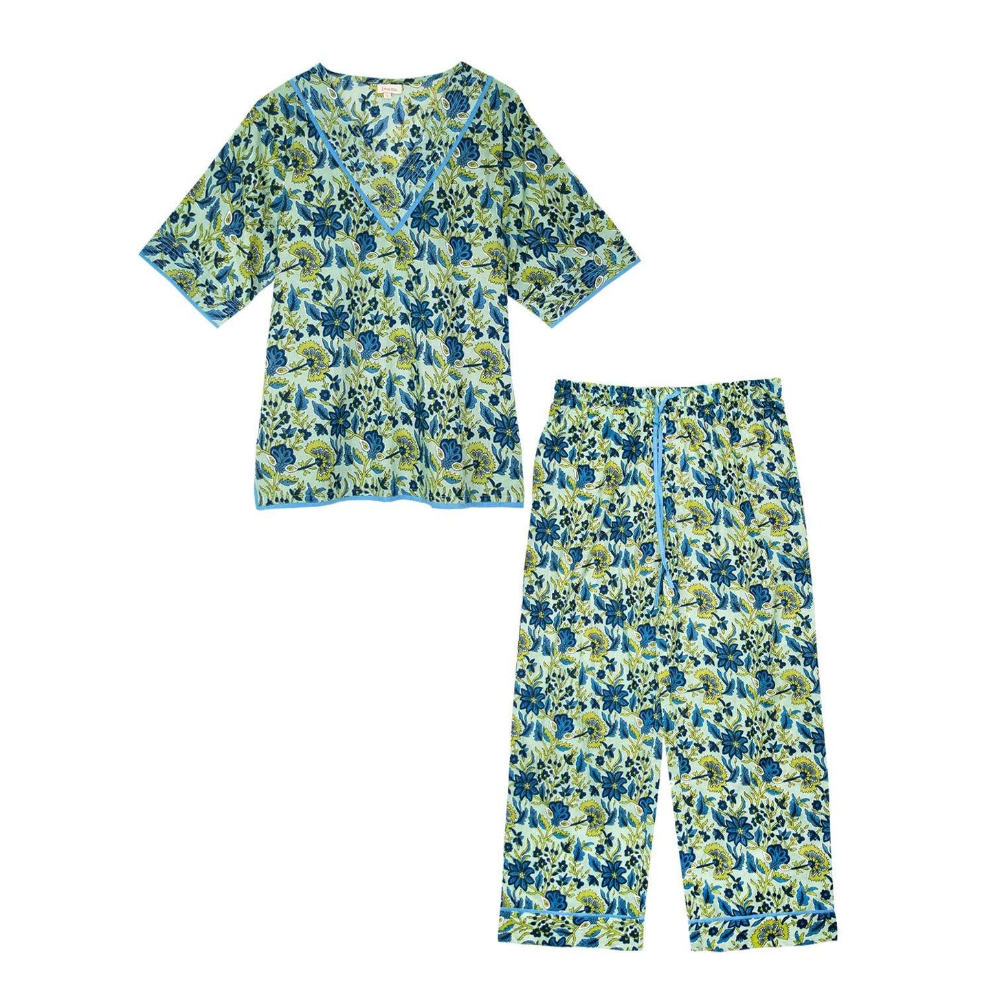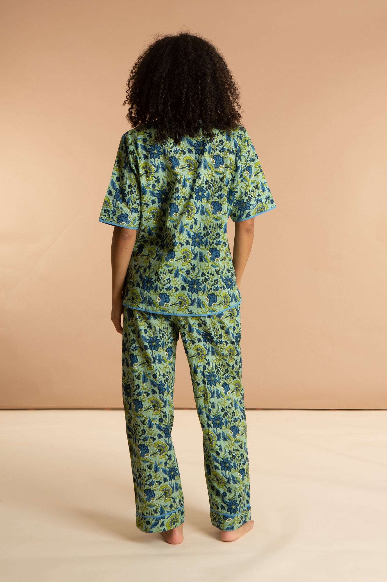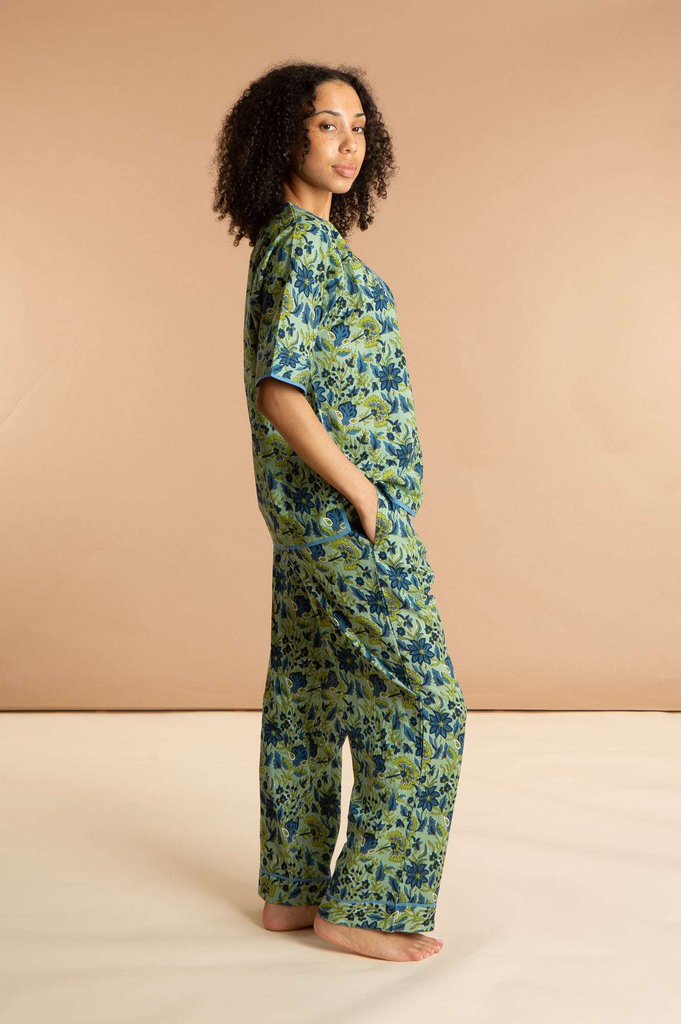 Our Lime Patchouli women's cotton pyjamas set is inspired by fresh mint essential oils and fragrances from the Asian Tropics. These luxury pjs feature a short-sleeved V-neckline loose top and straight leg pyjama bottoms, which are carefully printed and pre-washed, leaving the soft and breathable 100% Indian cotton a dream to wear. Let our bold printed loungewear inspire you from your early nights to late mornings.