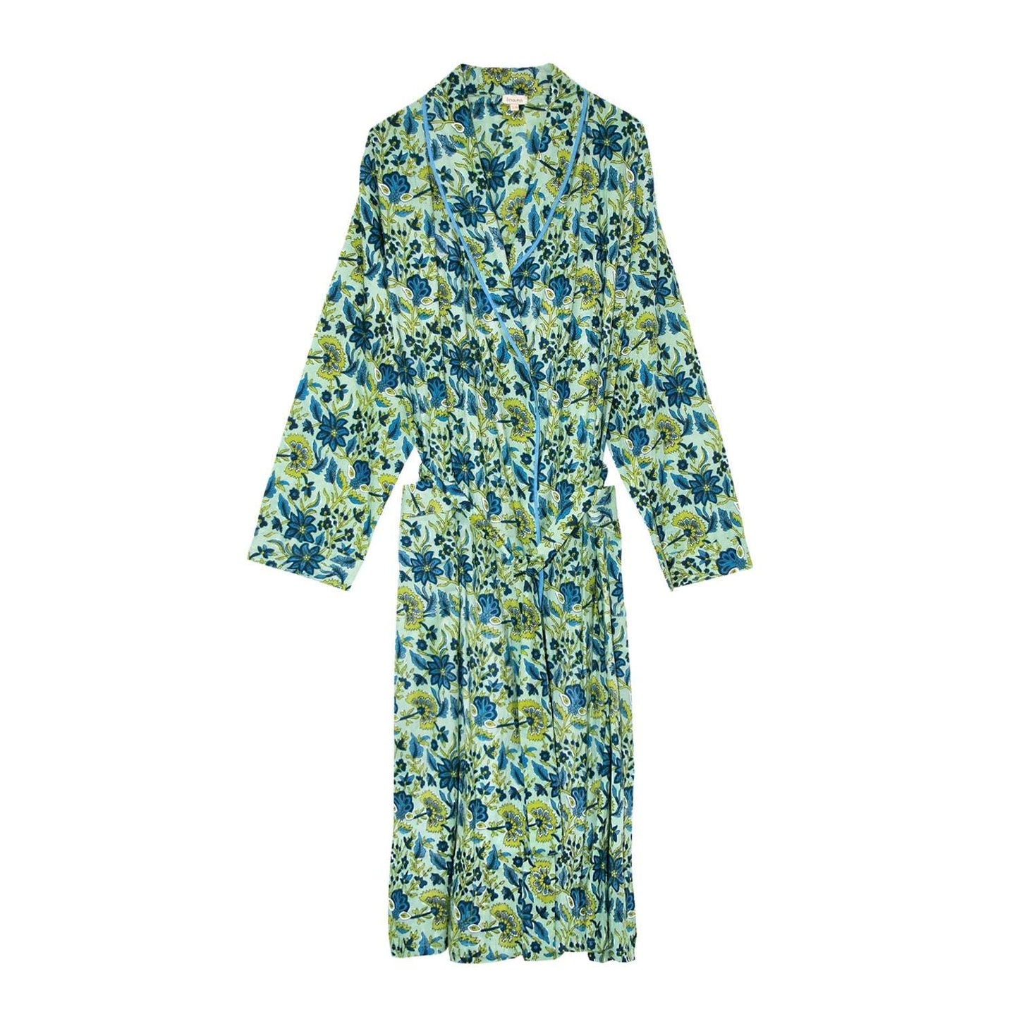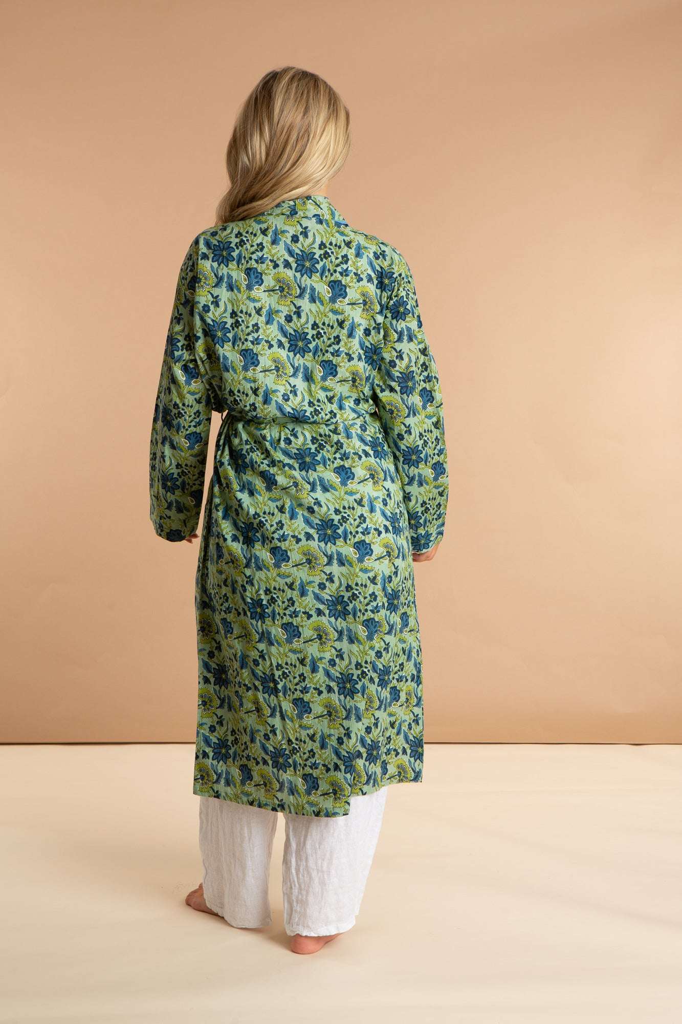 Our Lime Patchouli women's cotton robe is inspired by fresh mint essential oils and fragrances from the Asian Tropics. Featuring pockets, a generous length, and an inner drawstring for security, this luxury dressing gown is made from soft and breathable 100% Indian cotton, which is carefully printed and pre-washed. Let the soft green and blue pattern lull you into a restful state of mind.