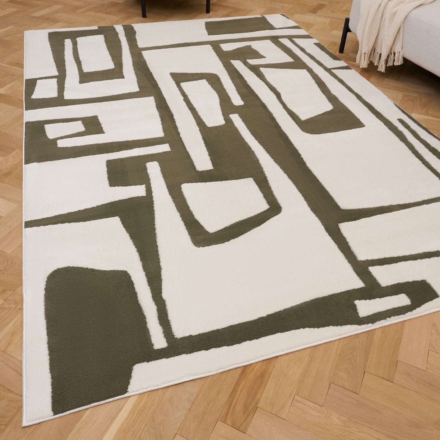 Bring natural calm to your home with the Loft Abstract Green Rug. Its abstract geometric design features fluid olive-green shapes on a light cream base, creating a subtle, earthy statement that adds visual interest without overwhelming your space. Perfect for living rooms, bedrooms, or creative areas.