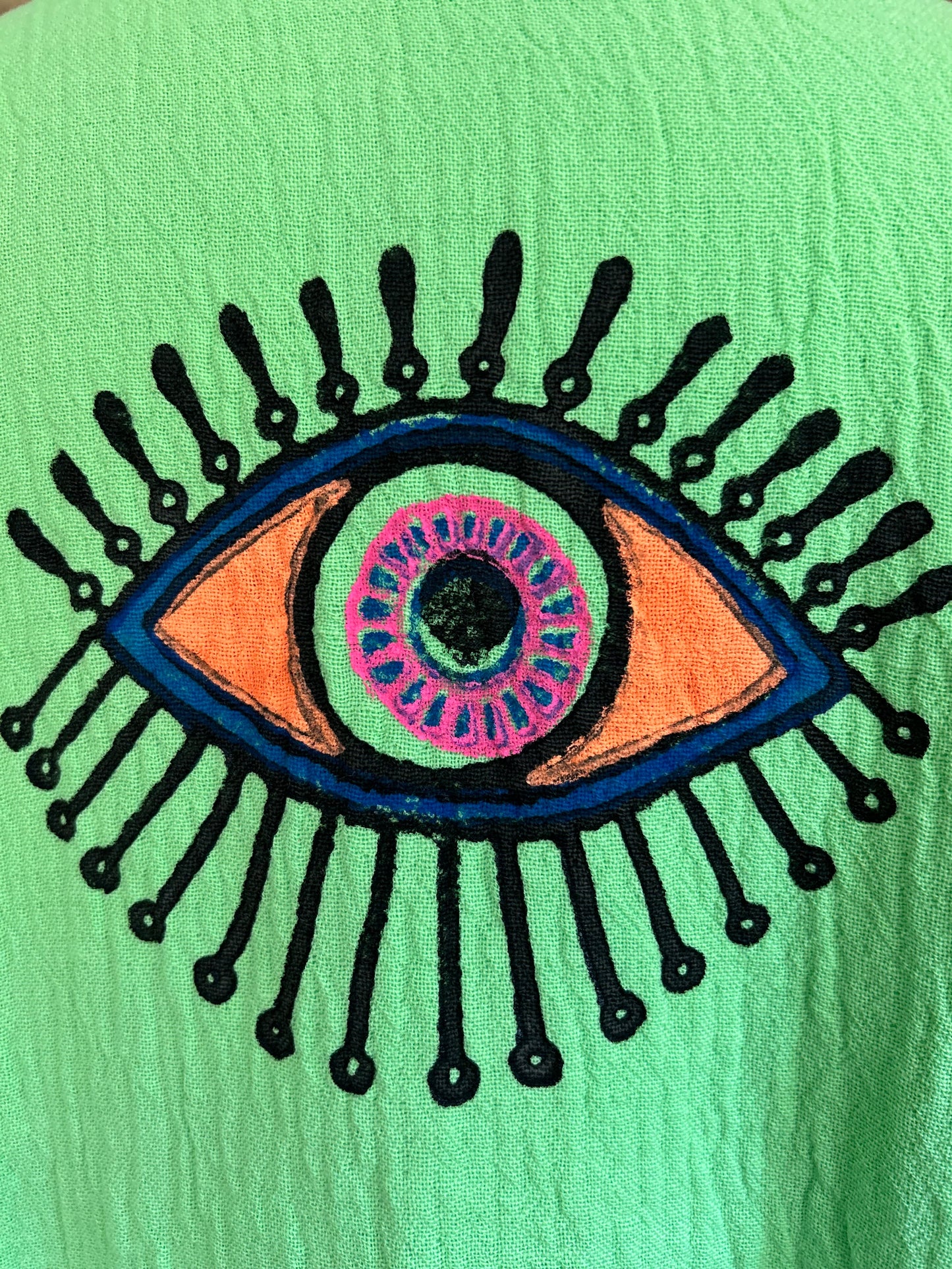 Every robe is hand block-printed with our iconic eye motif — a symbol of protection and positivity. This artisanal process ensures each piece carries its own subtle character, making your kimono truly unique.