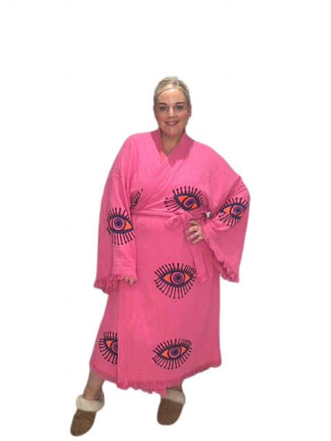 Each robe features our iconic eye motif, hand block-printed using traditional artisanal techniques. This process creates beautiful, subtle variations in colour and print, making every kimono unique and full of character.