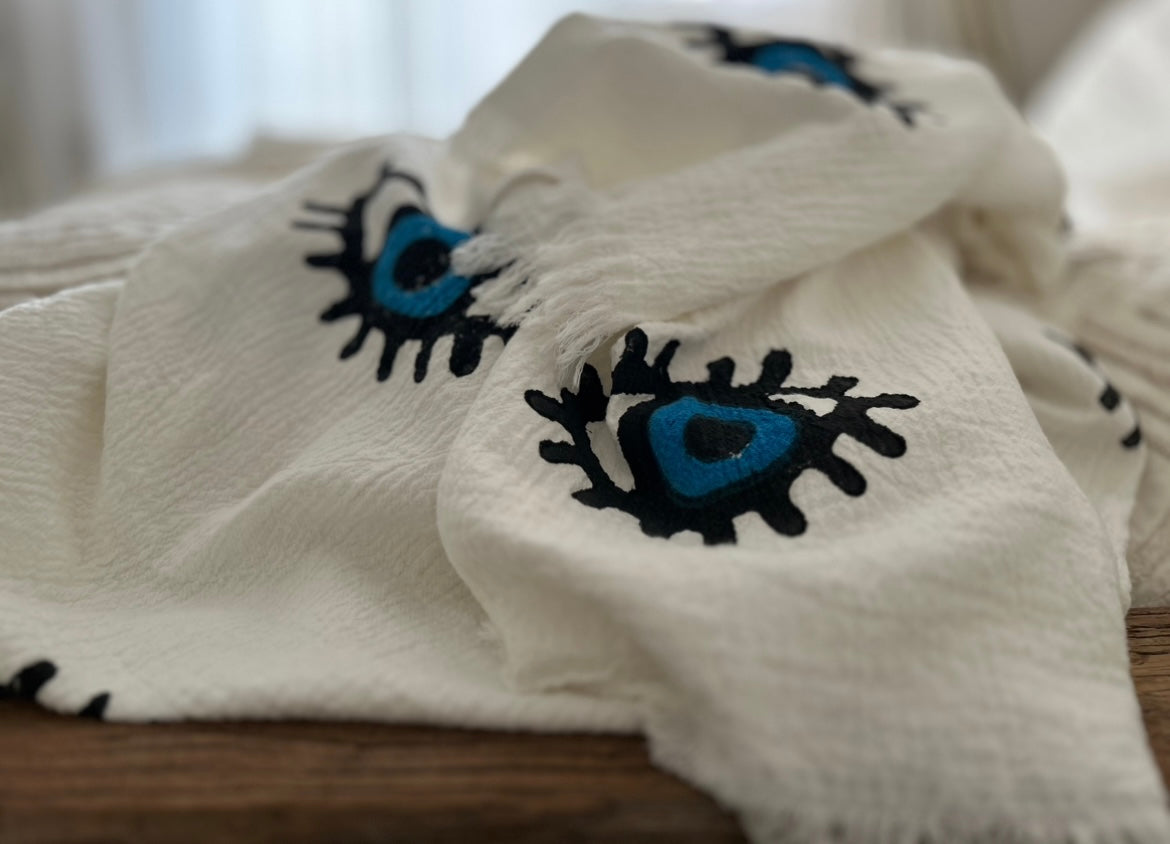- Hand block-printed with the iconic eye motif for a distinctive finish.