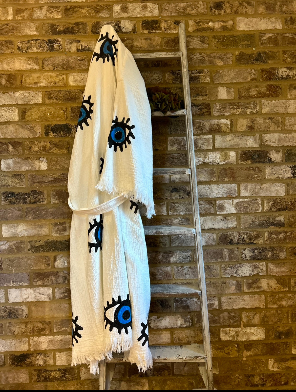 Long Cotton Robe: White with Dark Blue & Black Eye
