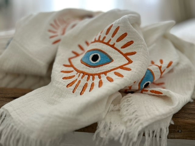 Each robe is hand block-printed with our beloved eye motif — a timeless symbol of protection and positivity. This artisanal technique ensures every piece is beautifully unique, showcasing subtle variations that add to its charm.