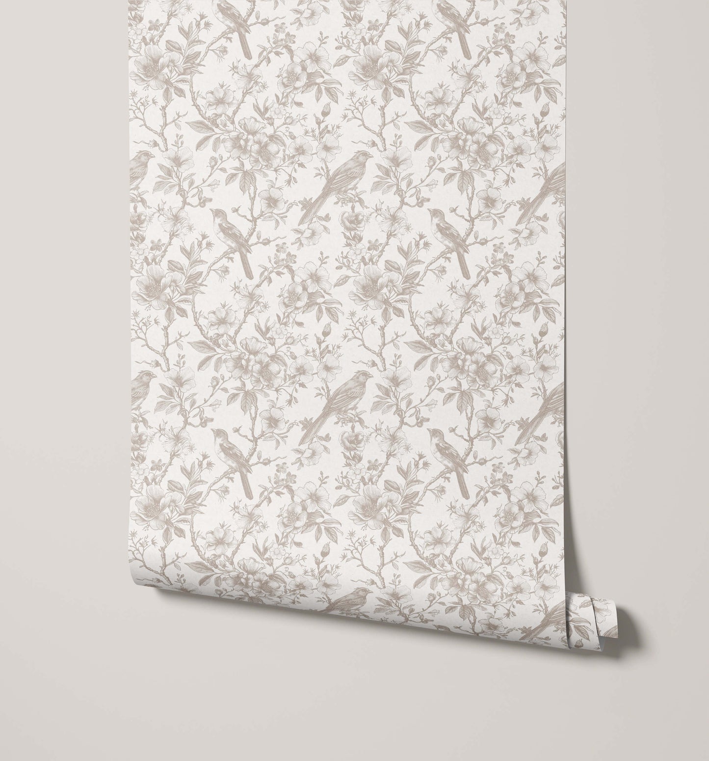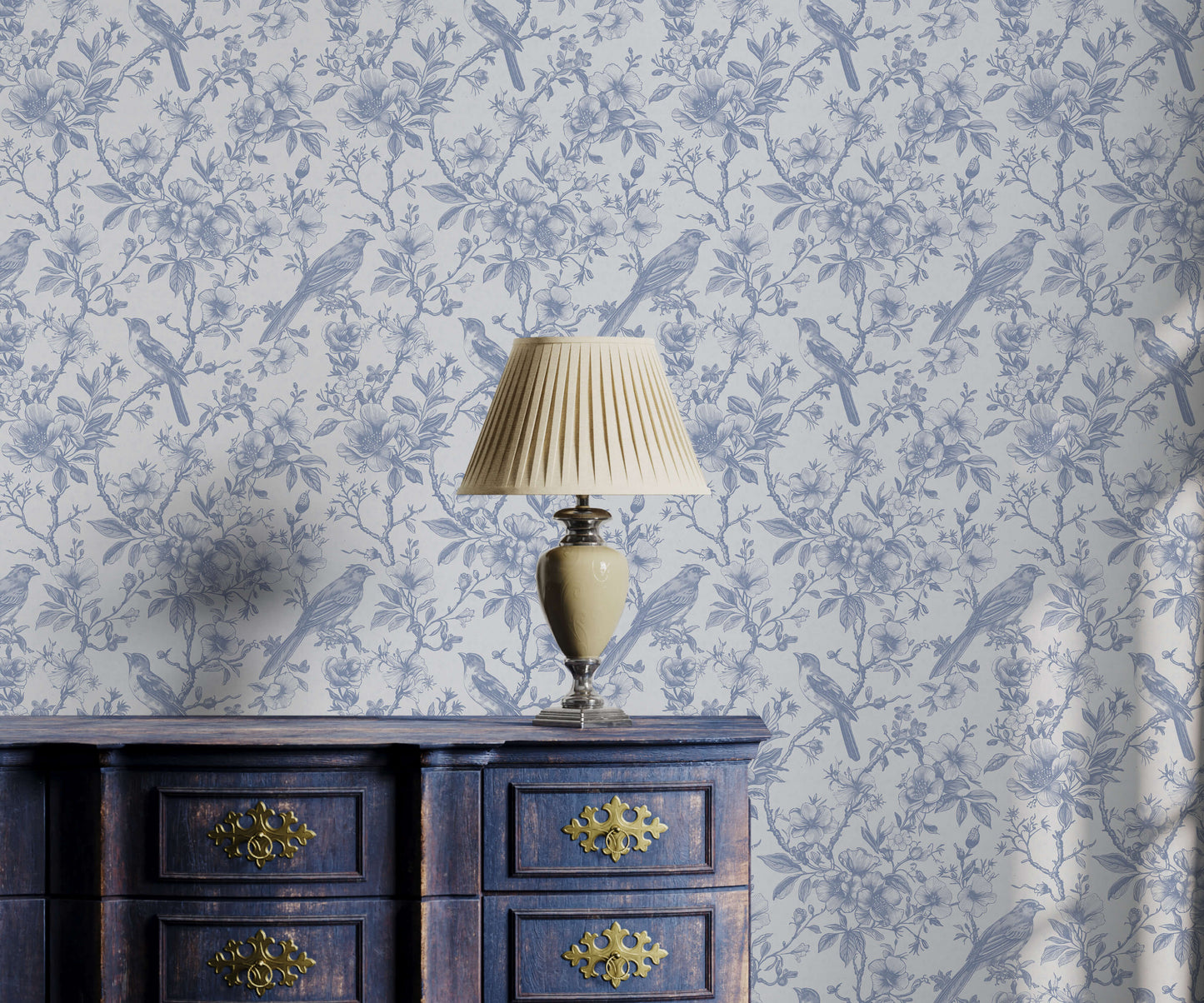 The high level of detail and repeating natural elements create a continuous, engaging tapestry across the wall. This sophisticated bird toile wallpaper is perfect for adding a sense of historical elegance, tranquility, and natural artistry to any room. It is an ideal choice for creating a gentle, narrative backdrop in bedrooms, living areas, or studies, inviting close appreciation of its intricate illustration.