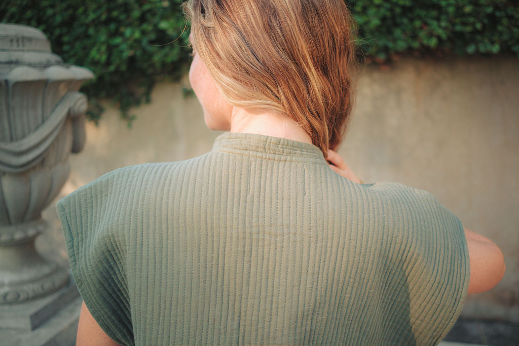 introducing our handmade, ultra-stylish oversize sleeveless jacket / waistcoat in quilted fabric, featuring an exclusive all-over top-stitched. This piece isn't just a jacket; it's a statement. With a high neck, button closure, and drop shoulders, it's perfect for those warmer days when you want to look smart and casual without the bulk of a coat. Large welt pockets add both functionality and flair. Layer it over your favourite tee or sweater for a laid-back yet polished vibe. The intricate stitching adds a touch of craftsmanship that sets it apart, making it your go-to for effortless chic.