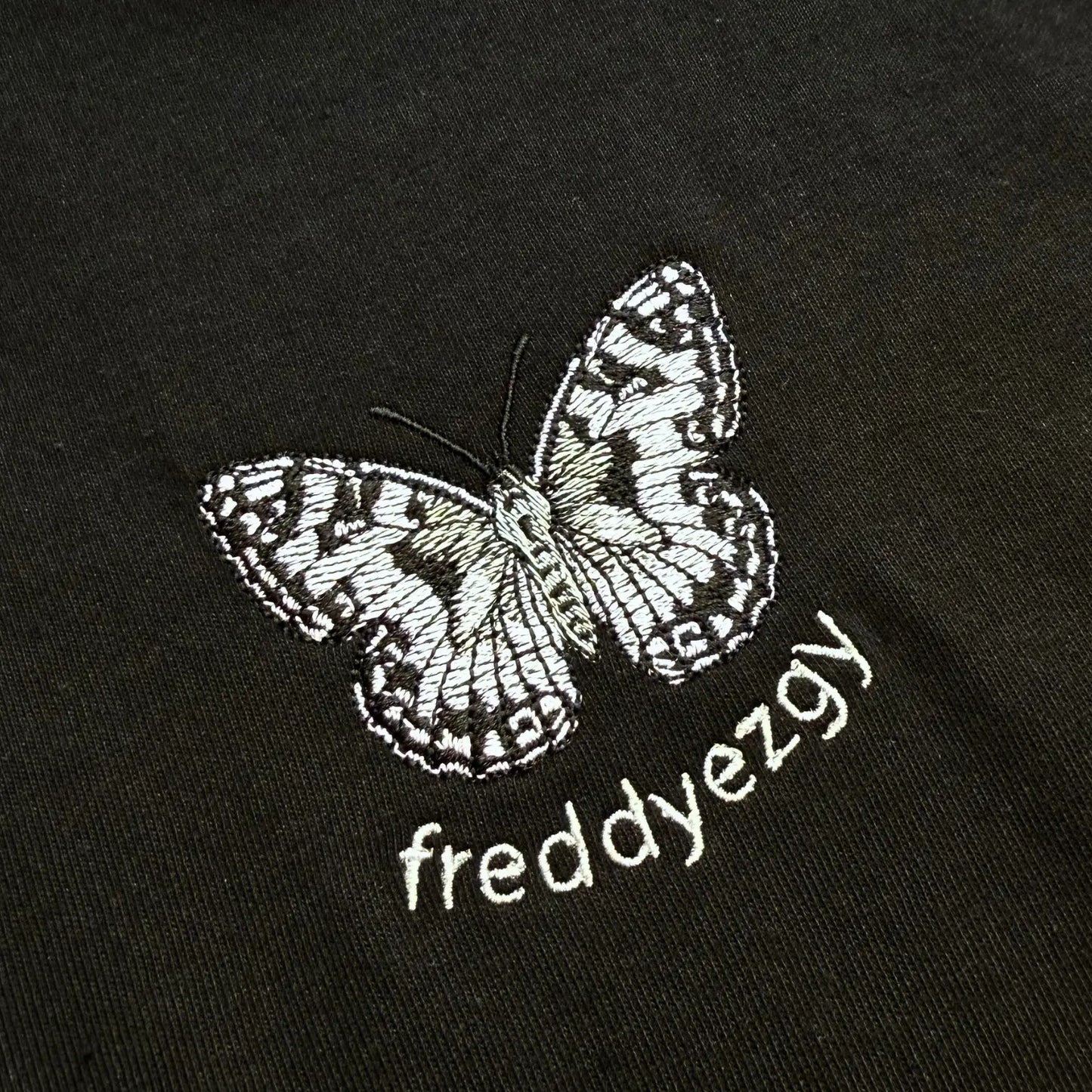 Embroidered with fine, precise stitching, the butterfly anchors the design with subtle strength. Its patterned wings stand out against the fabric like moonlight through branches — understated at first glance, richer the longer you look.