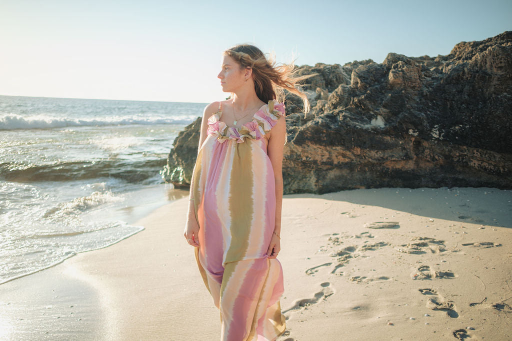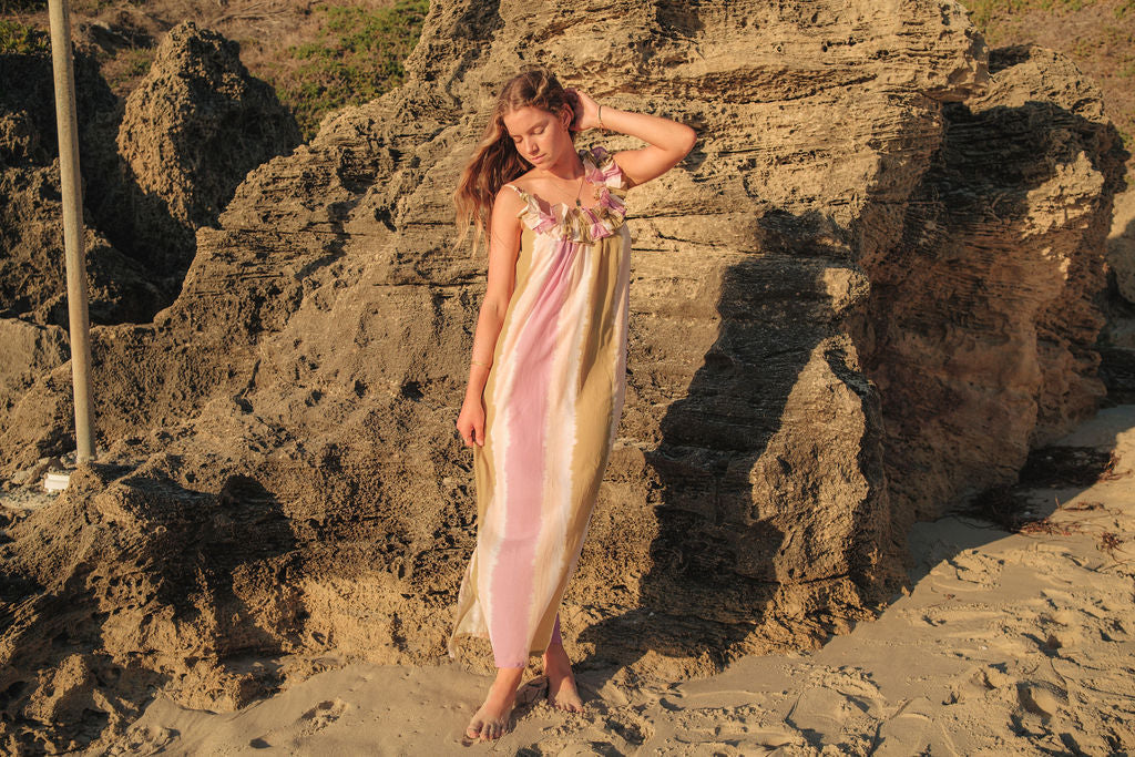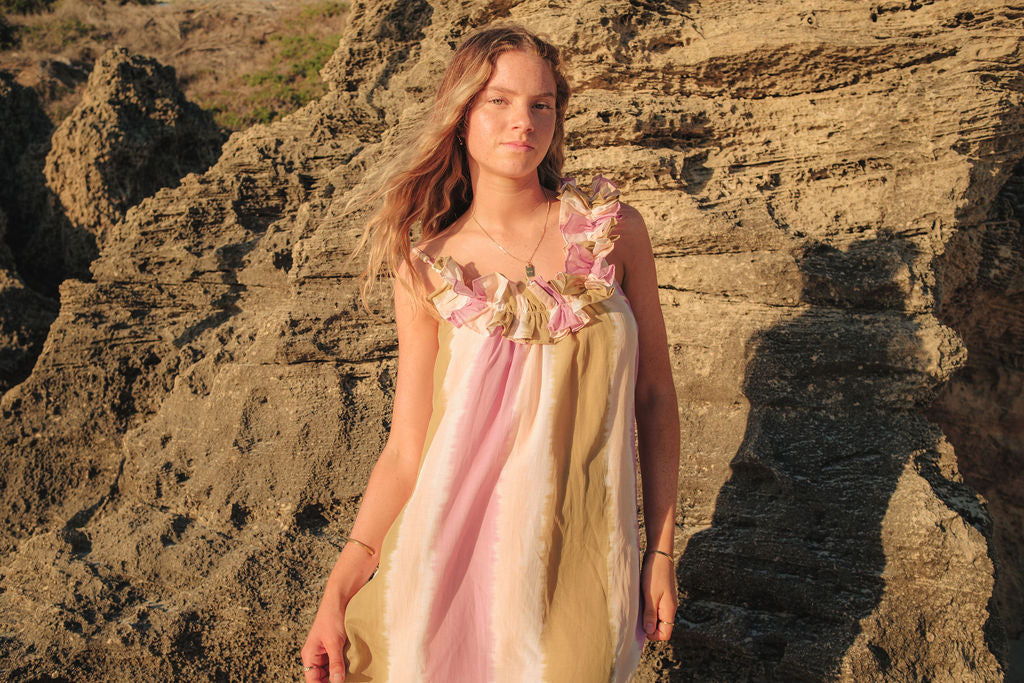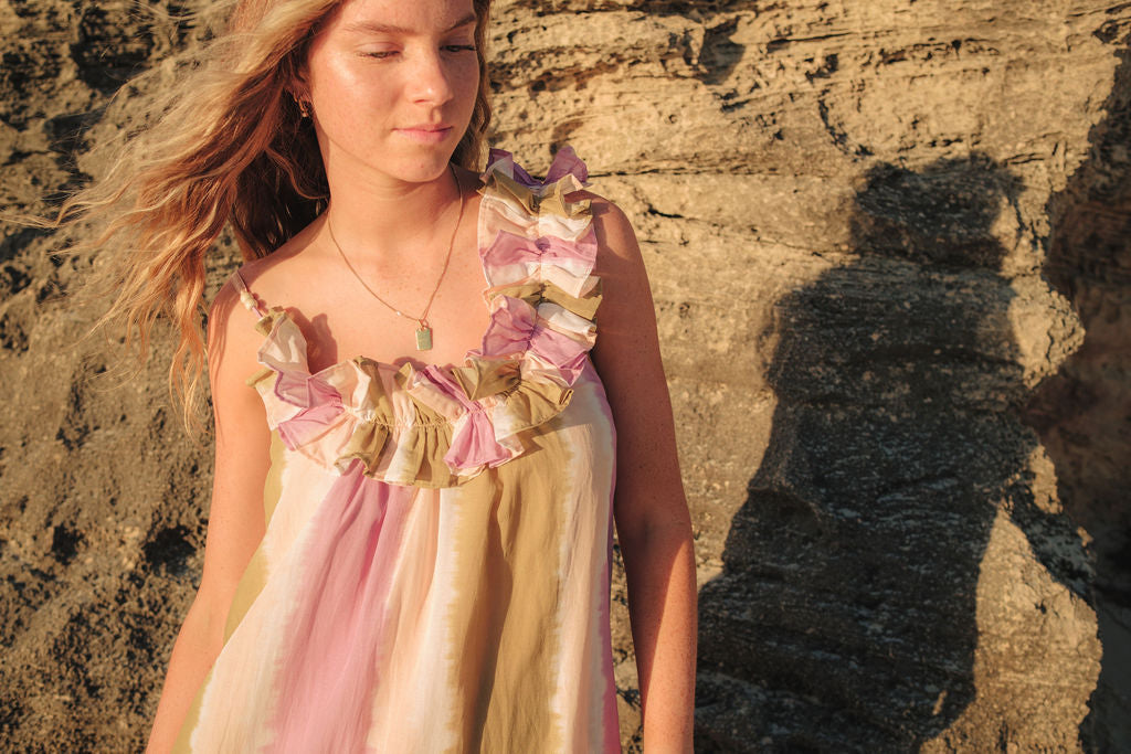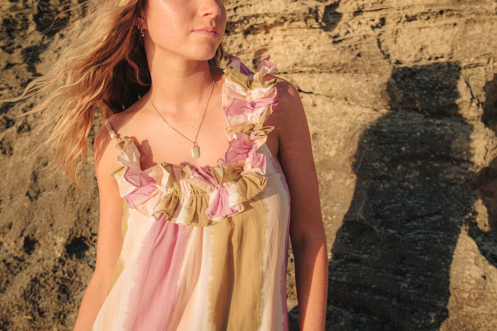 The ruffle details at the neckline add a touch of fun—playful yet chic. Tiny beads on the straps? A little detail that makes all the difference. And yes, it has pockets—because every great dress should! We're all about elevated functional fashion!