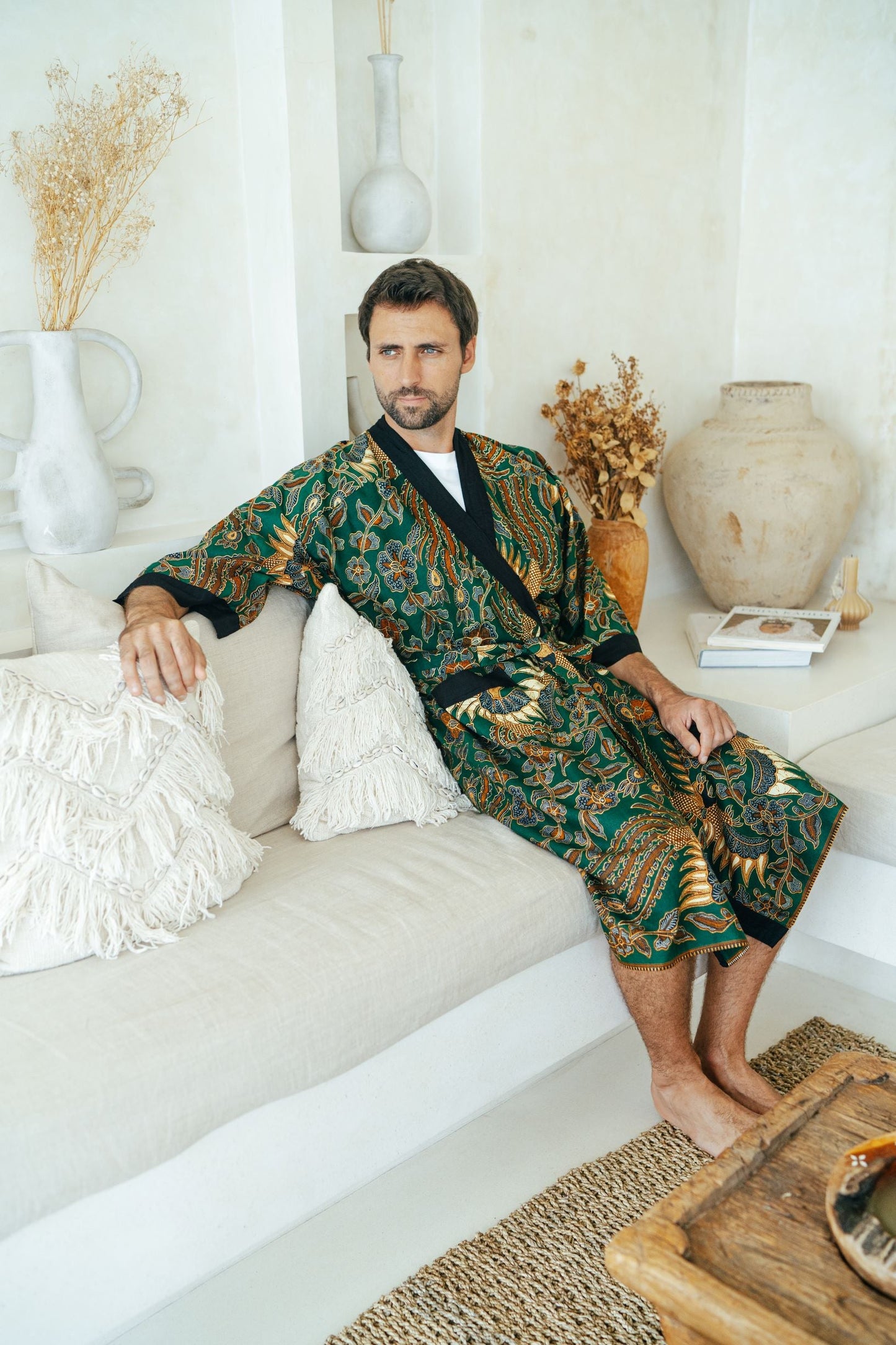 A relaxed, breathable robe made from 100% cotton and hand-printed using traditional Indonesian batik techniques. This full-length kimono is perfect for everyday lounging, festivals, holidays, or as a unique gift. It’s lightweight yet structured and has a timeless design that looks just as good open over an outfit as it does tied closed.