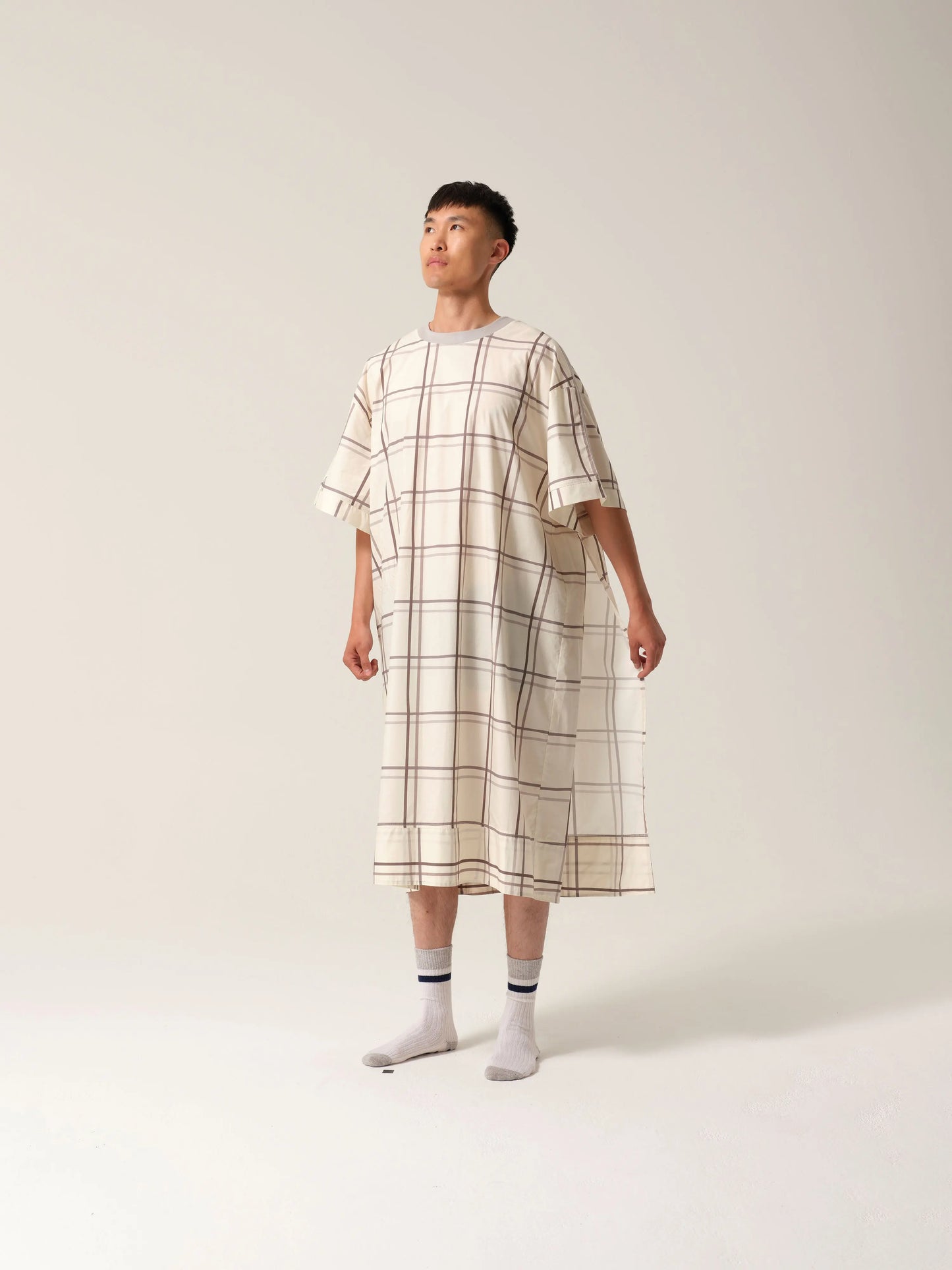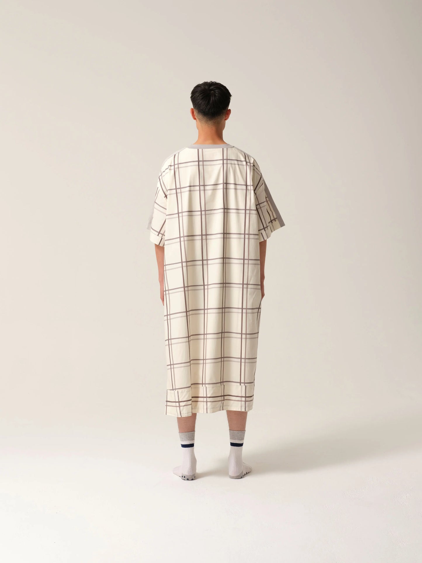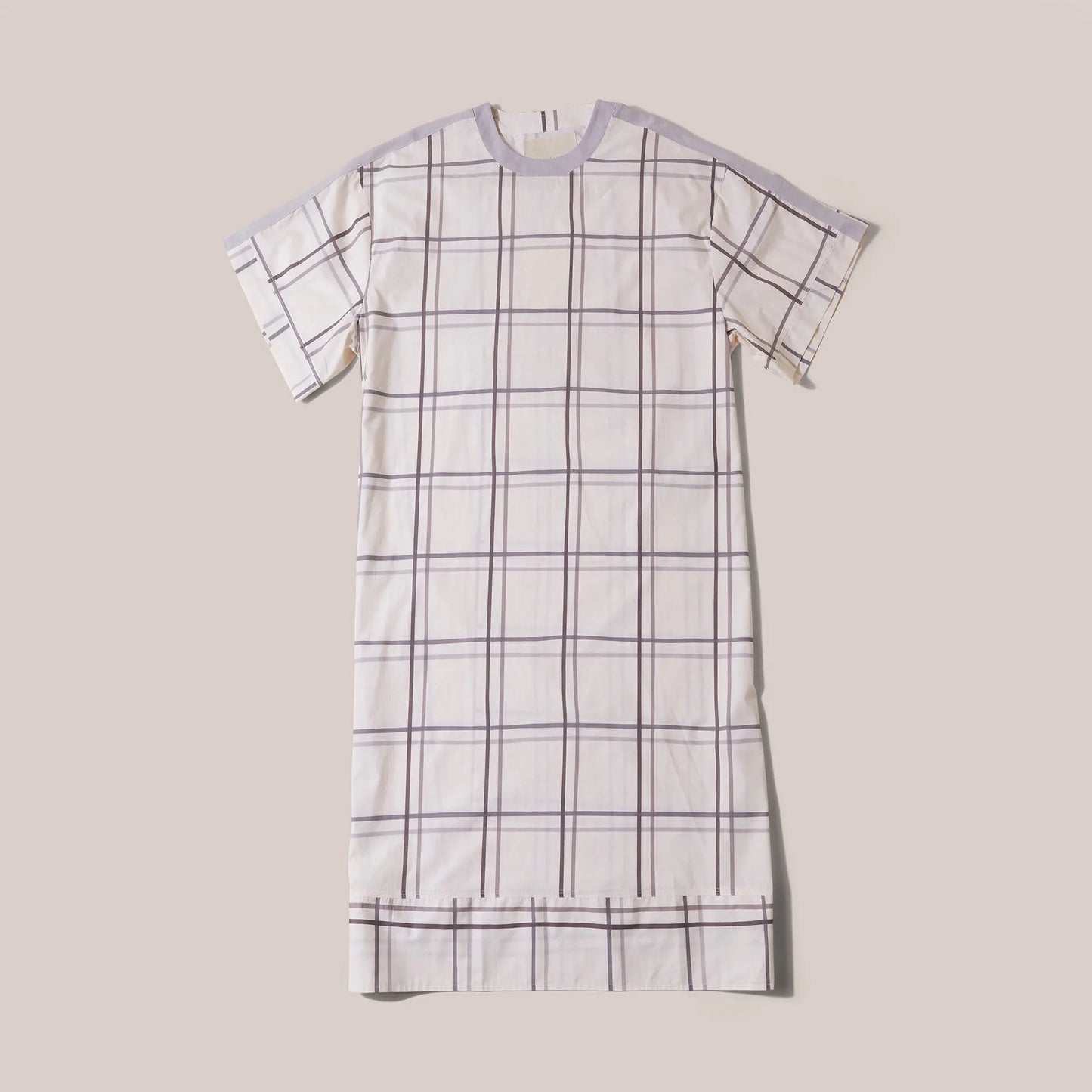 The longer sleeves and hem offer reassuring coverage, while the soft jersey neckline and weighted hem provide comfort and structure, ensuring it stays in place whether sitting or lying down. A wide, easy-to-fasten side tie and button at the neck allow for full medical access, making it ideal for those with limited dexterity.