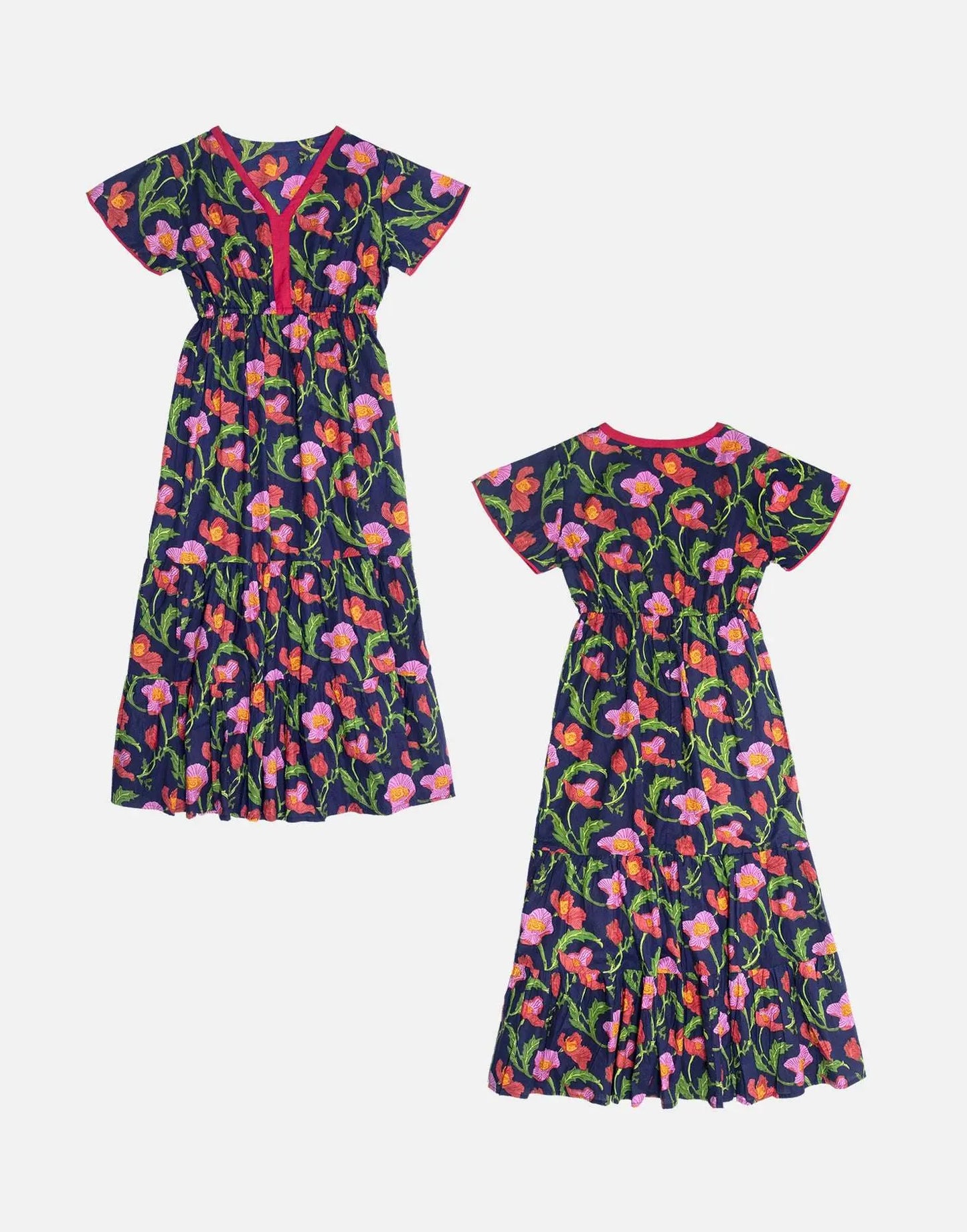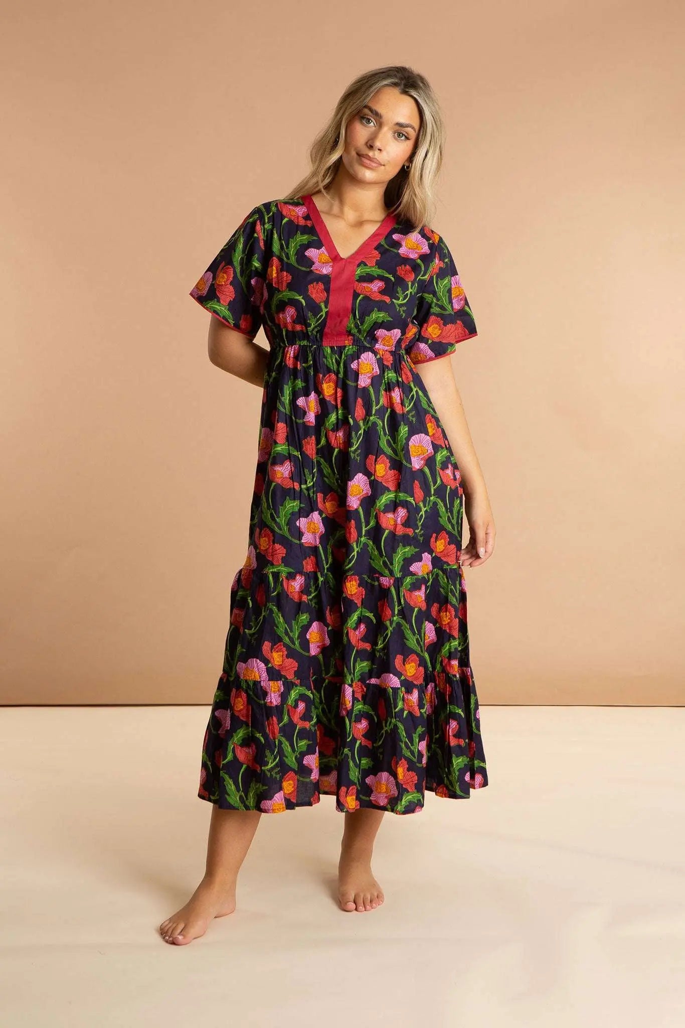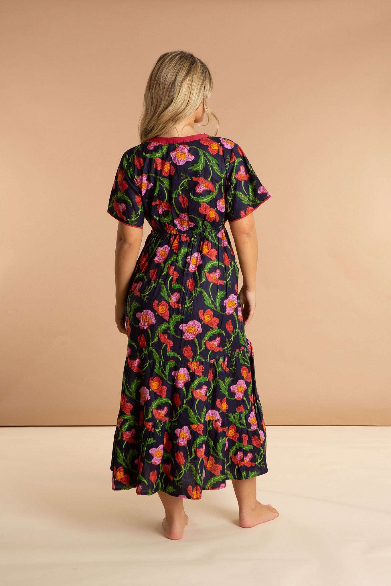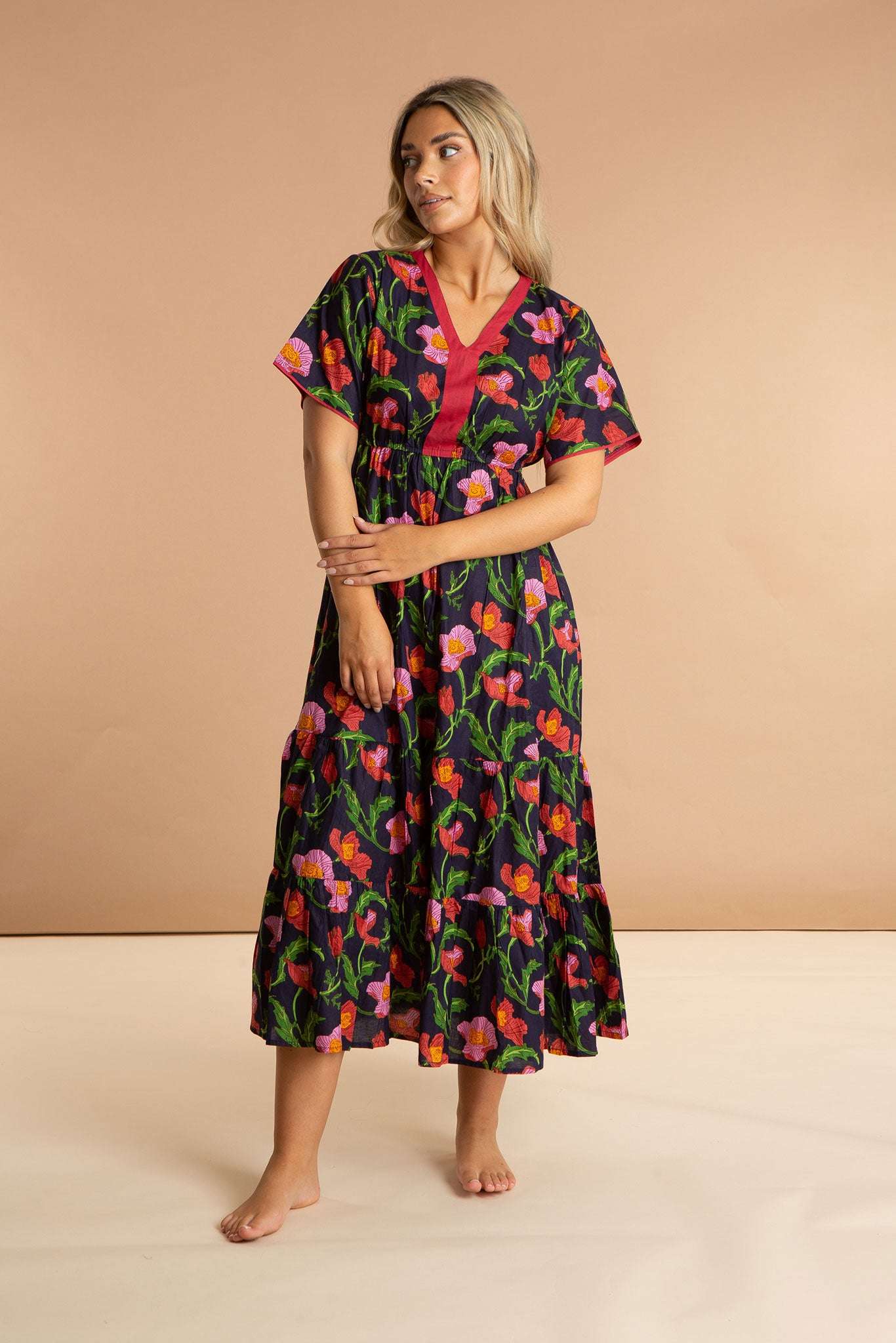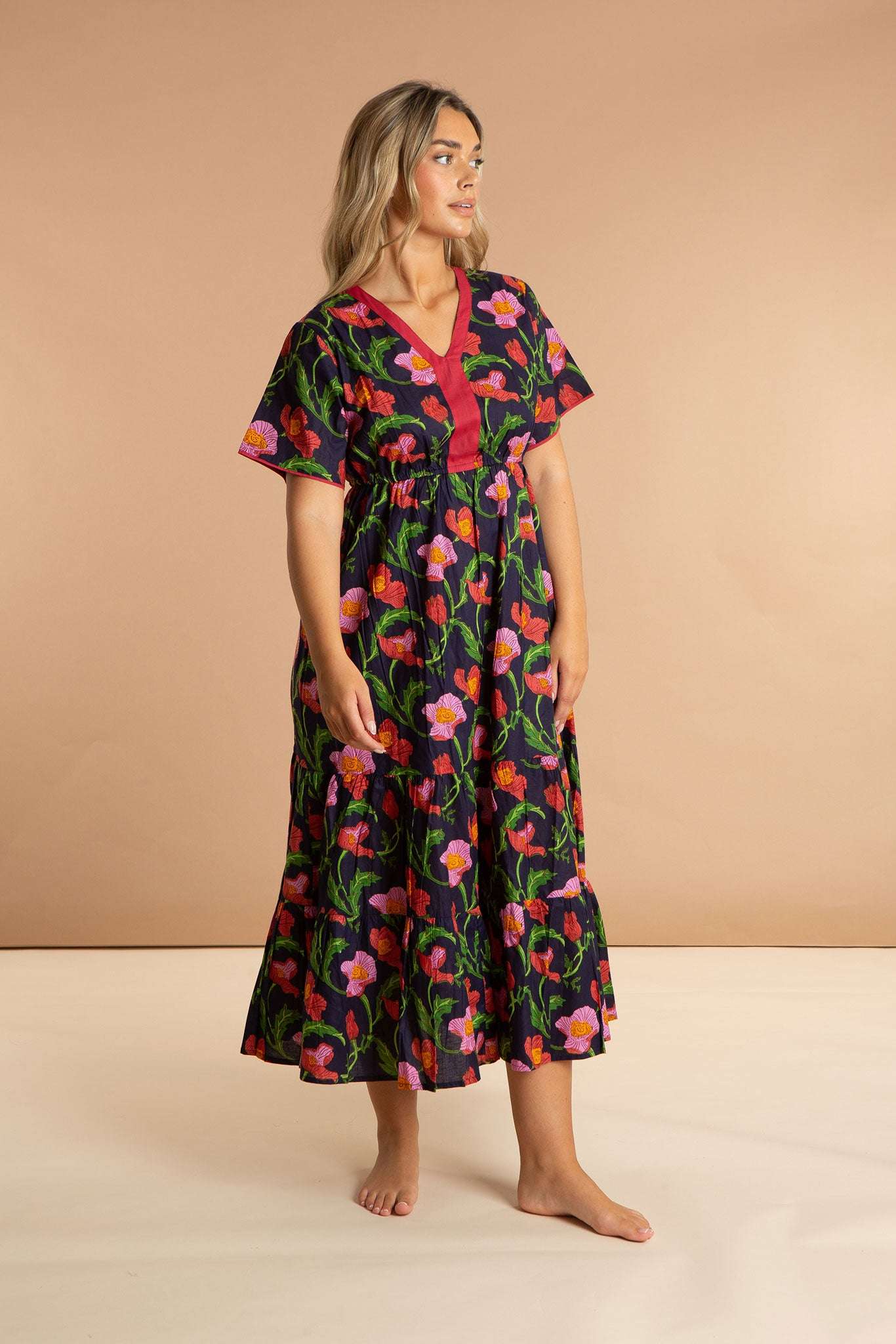 Our Midnight Sweetpea women's cotton dress is inspired by floral blooms across the Sicilian midnight sky. Featuring a stretchy elastic waistband, contrast neckline, short sleeves, and a full skirt, this luxury red, pink, and black dress is made from soft and breathable 100% Indian cotton. The classic bold print adds a dash of colour to this flowy summer dress.