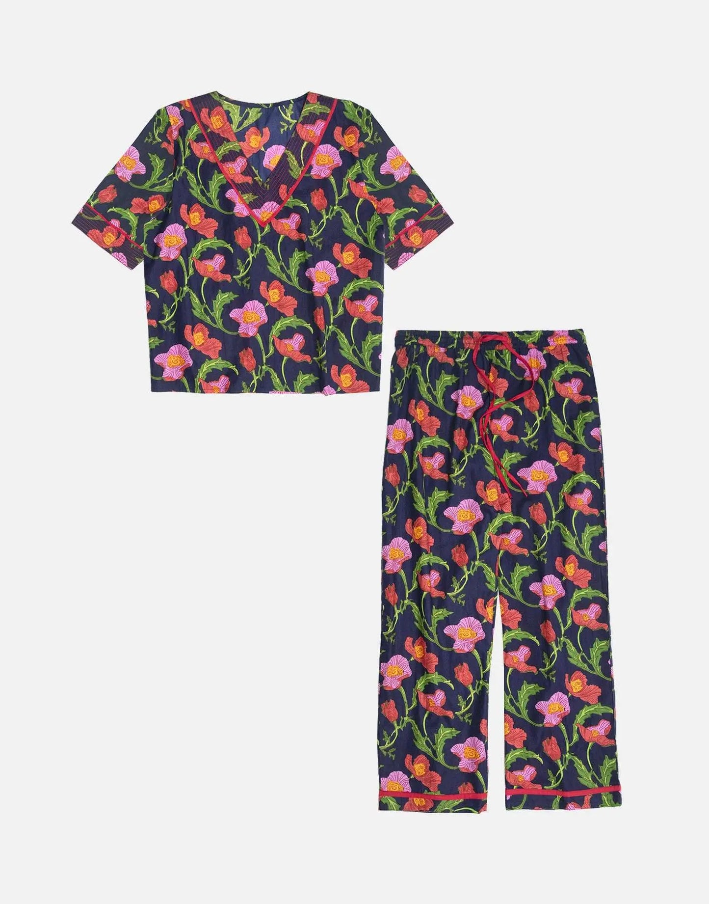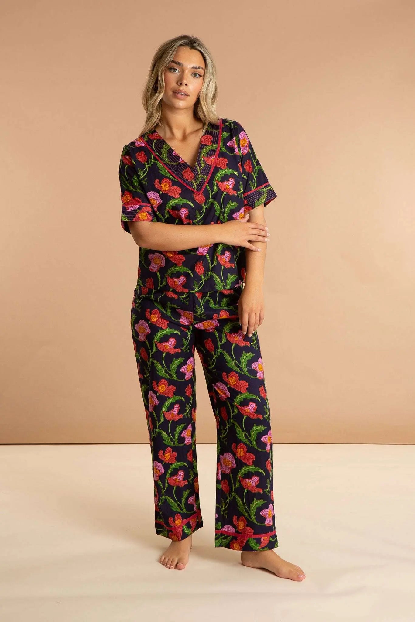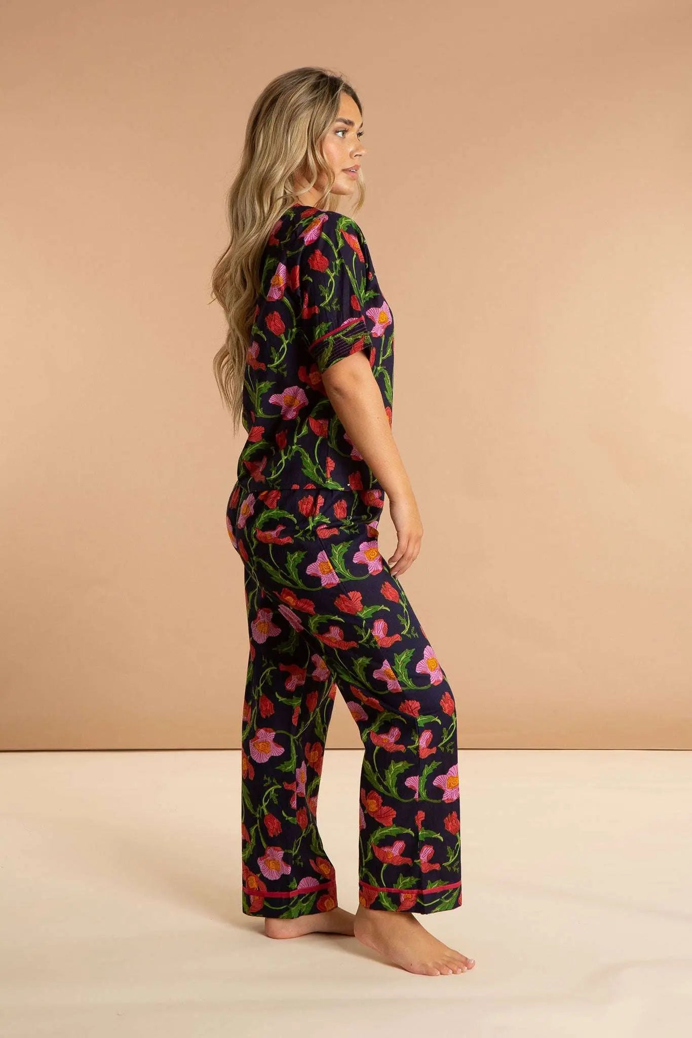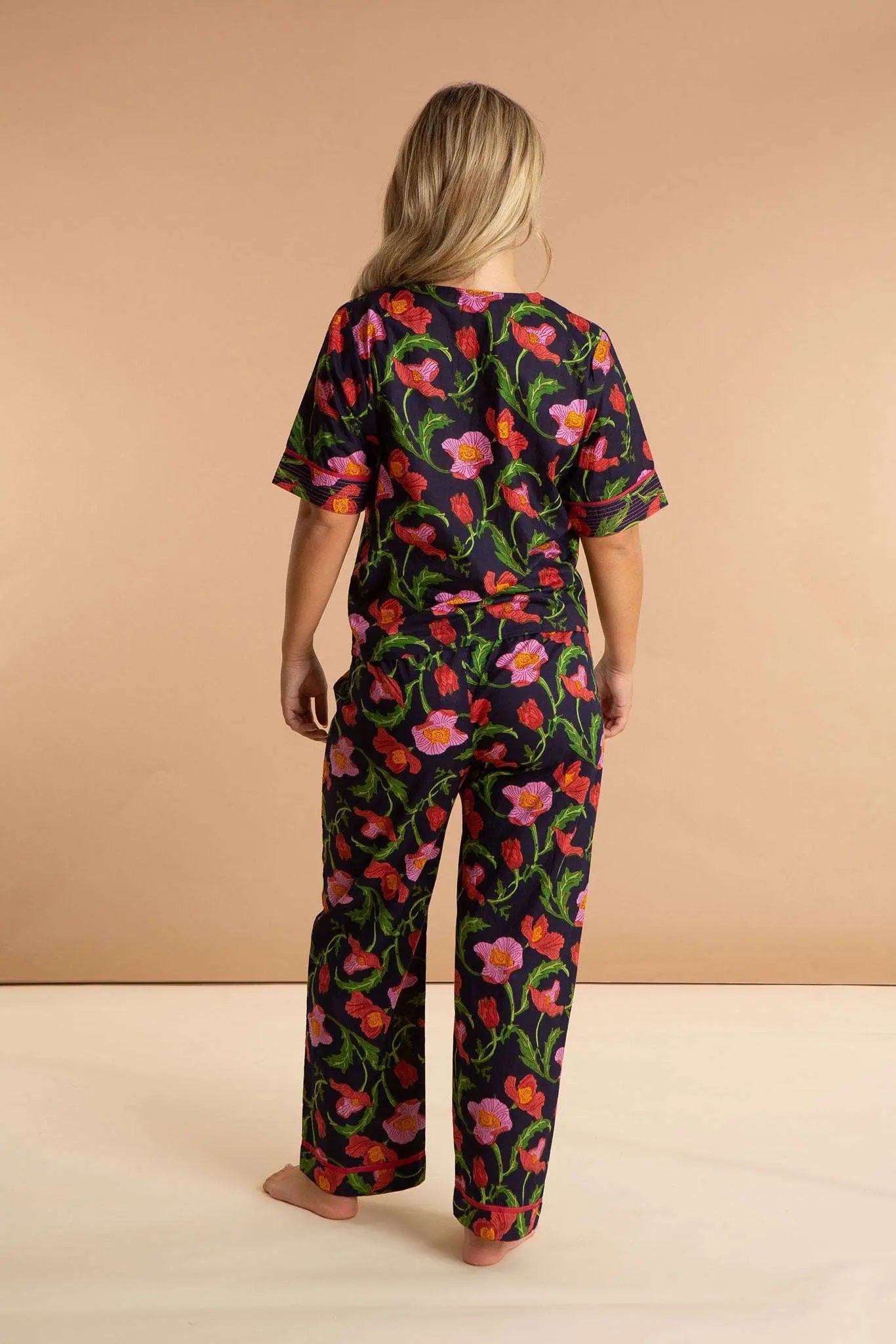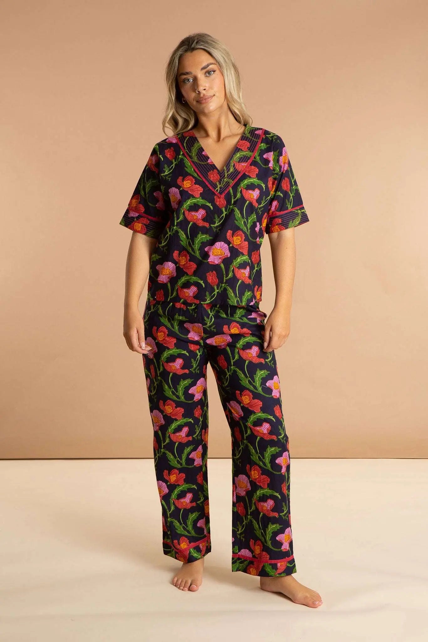 Our Midnight Sweetpea women's cotton pyjamas set is inspired by floral blooms across the Sicilian midnight sky. These luxury pjs feature a short-sleeved V-neckline loose top and straight leg pyjama bottoms, which are carefully printed and pre-washed, leaving the soft and breathable 100% Indian cotton a dream to wear. Our bold printed loungewear compliments both your early nights and late mornings.