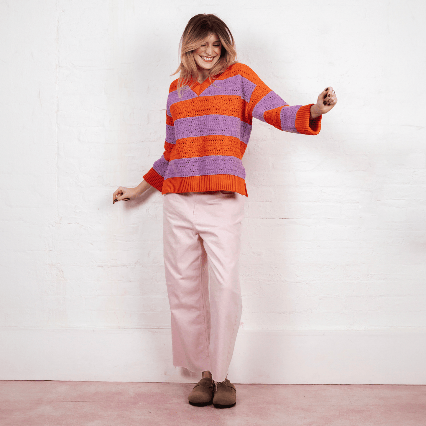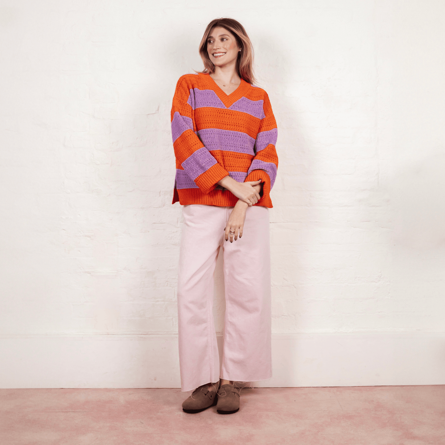 Millie Crochet Stripe V Neck Cotton Blend Jumper - Orange