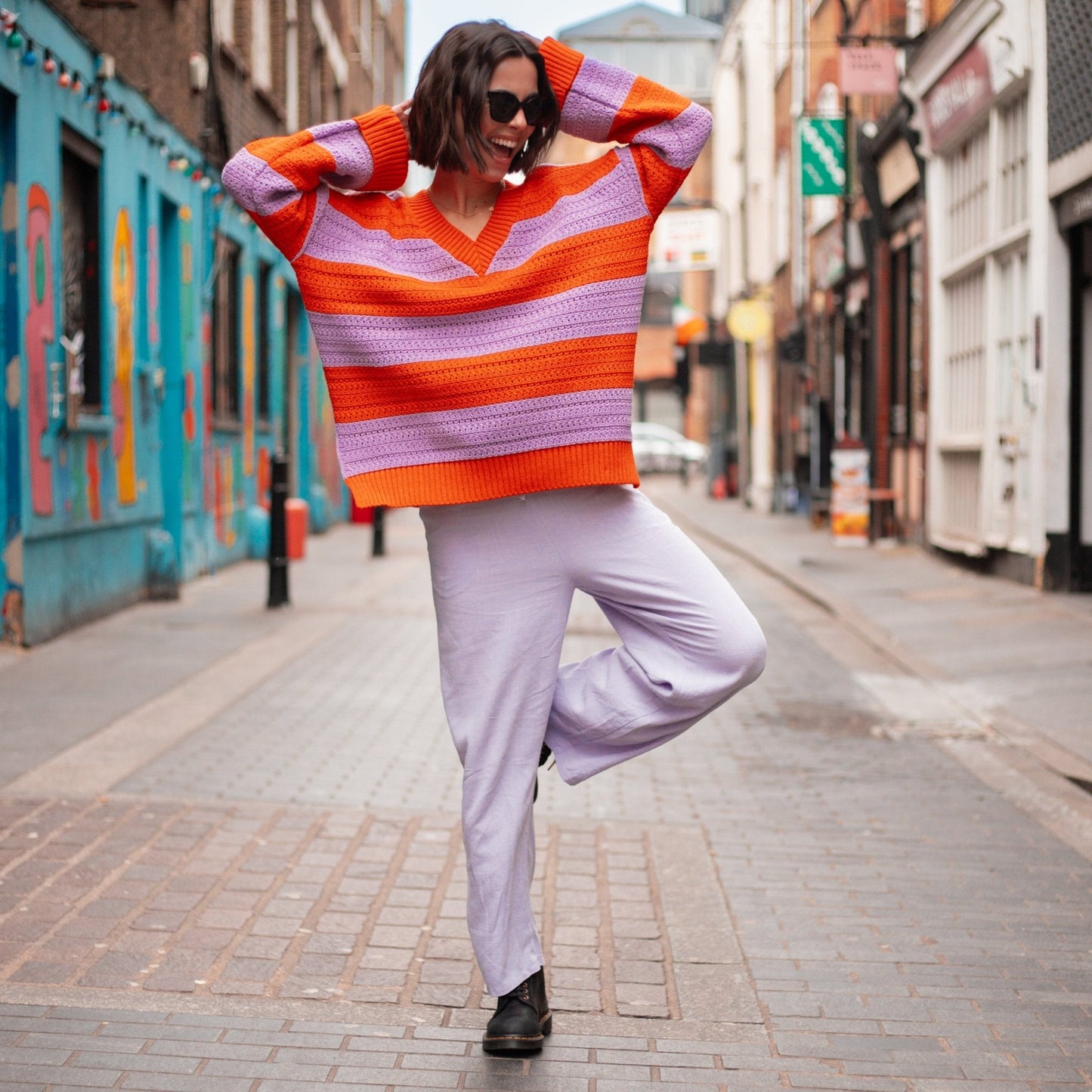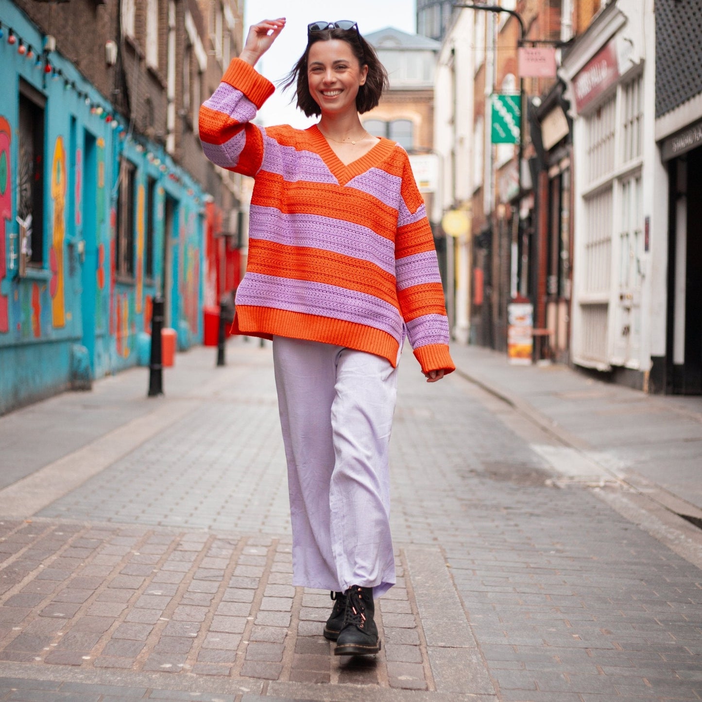 Effortlessly add a pop of color to your wardrobe with our Millie crochet stripe jumper! The delicate crochet stitch, boxy fit, and turn up cuff make it the perfect summer piece for layering over midi dresses or as a beach coverup on vacation. Plus, it's sustainably made in the UK with recycled cotton blend yarn. Stand out in style with this versatile and eco-friendly sweater!
