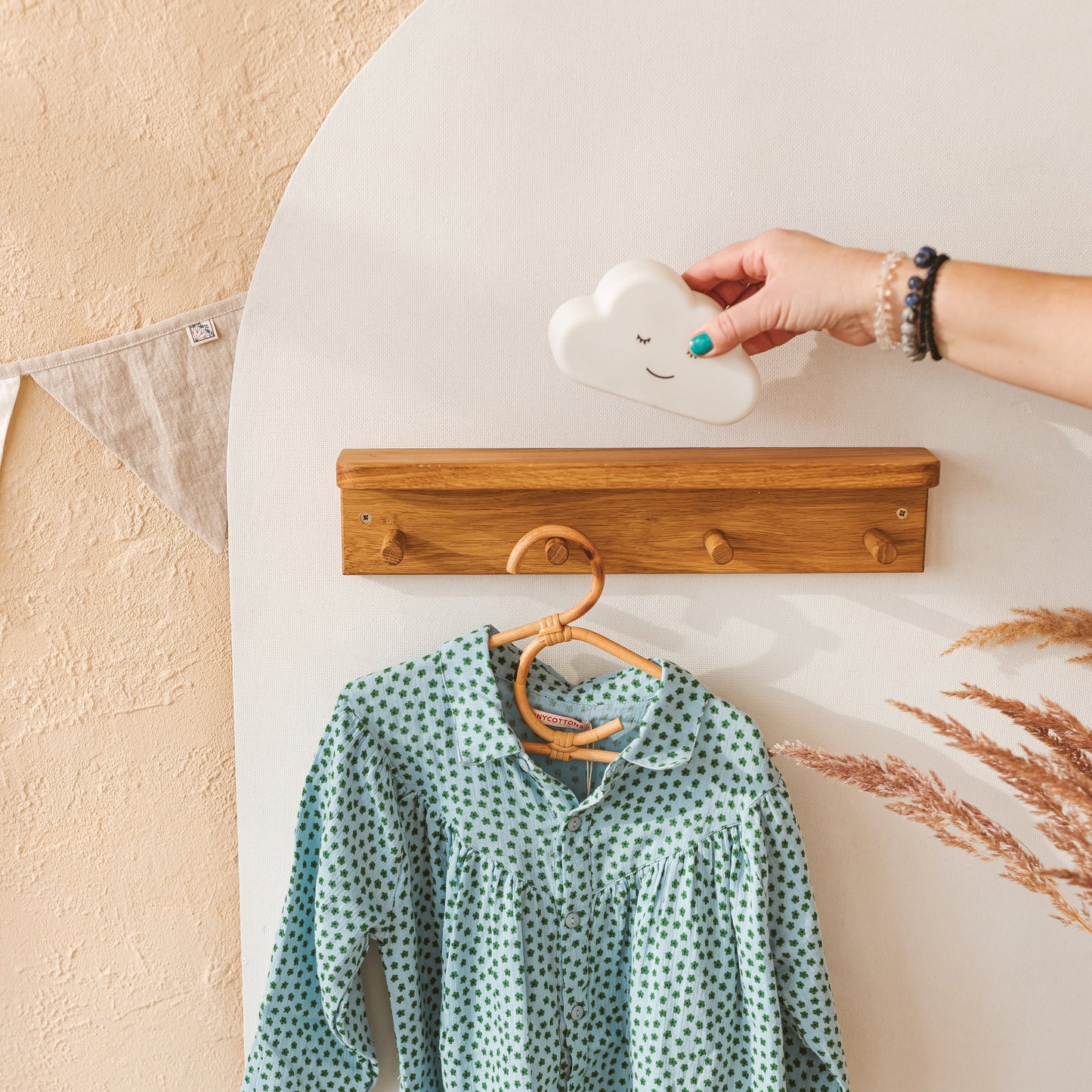 From your nursery to your hallway, the MINICAMP wooden coat hooks with floating bookshelf provide the perfect organization solution for any room. Equipped with a flat top shelf and 4 wooden pegs, these wall-mounted hooks are perfect for storing and hanging clothing and displaying your child’s favourite books.