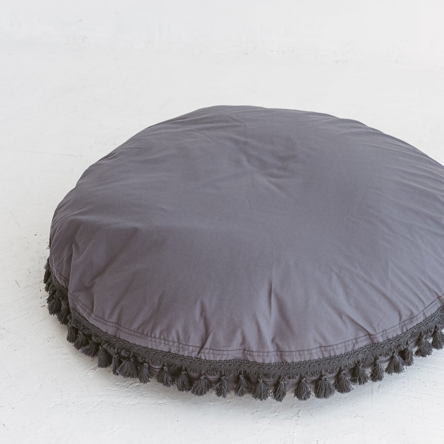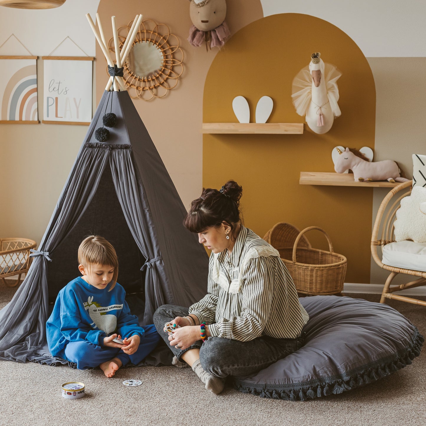 The MINICAMP Large Floor Cushion with Tassels in Grey is an ideal addition to your child's play area. This spacious cushion offers a soft and comfortable spot for playtime, reading, or relaxation, making it perfect for both children and teenagers.