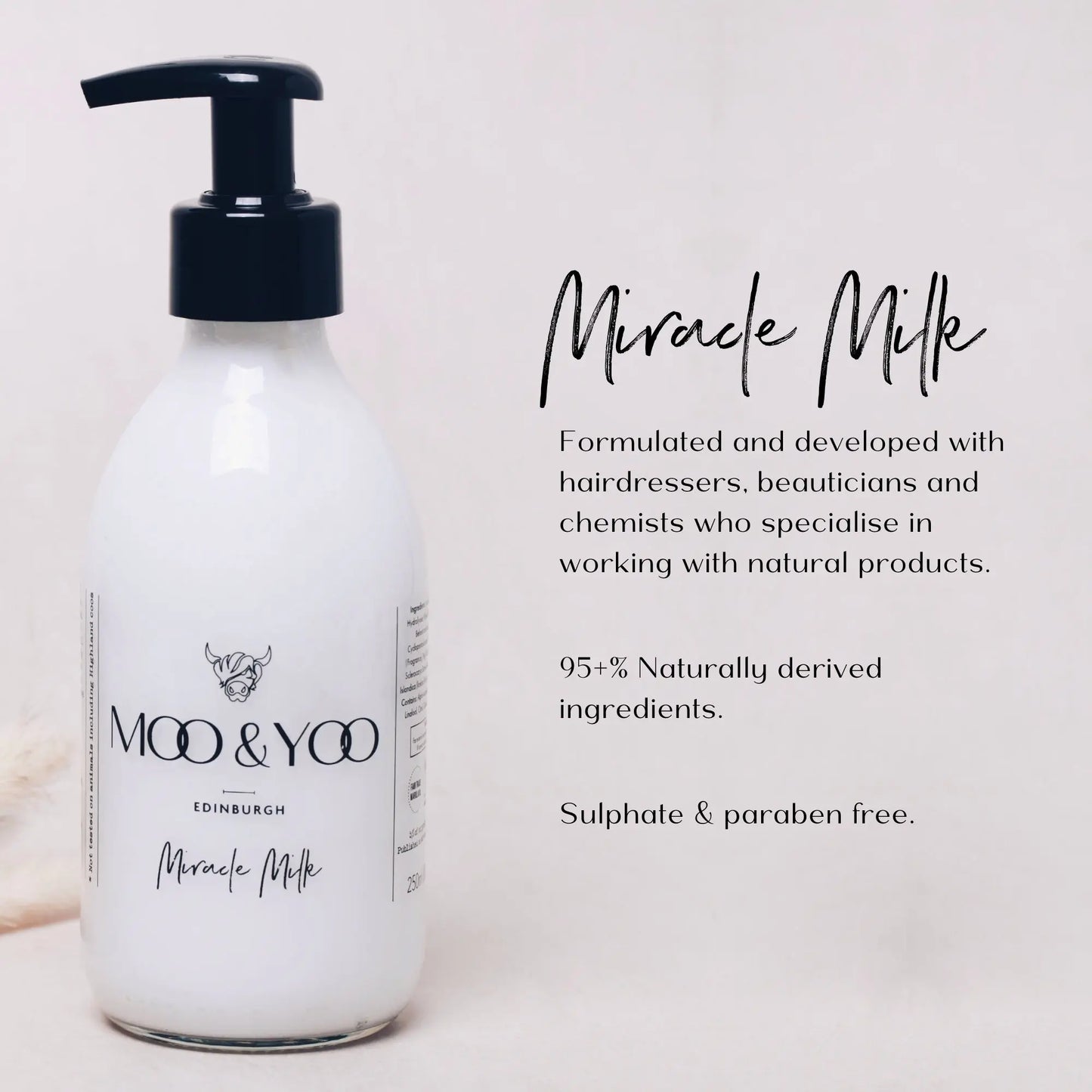 Our hero product! Your hair hasn't experienced anything like this before. Our Miracle Milk leave-in treatment transforms, protects and nourishes your hair. It hydrates, de-frizzes, de-tangles, softens and adds body to your hair. Our milk also contains UVA/UVB and heat protection. Ideal for all hair types thanks to its naturally light consistency.