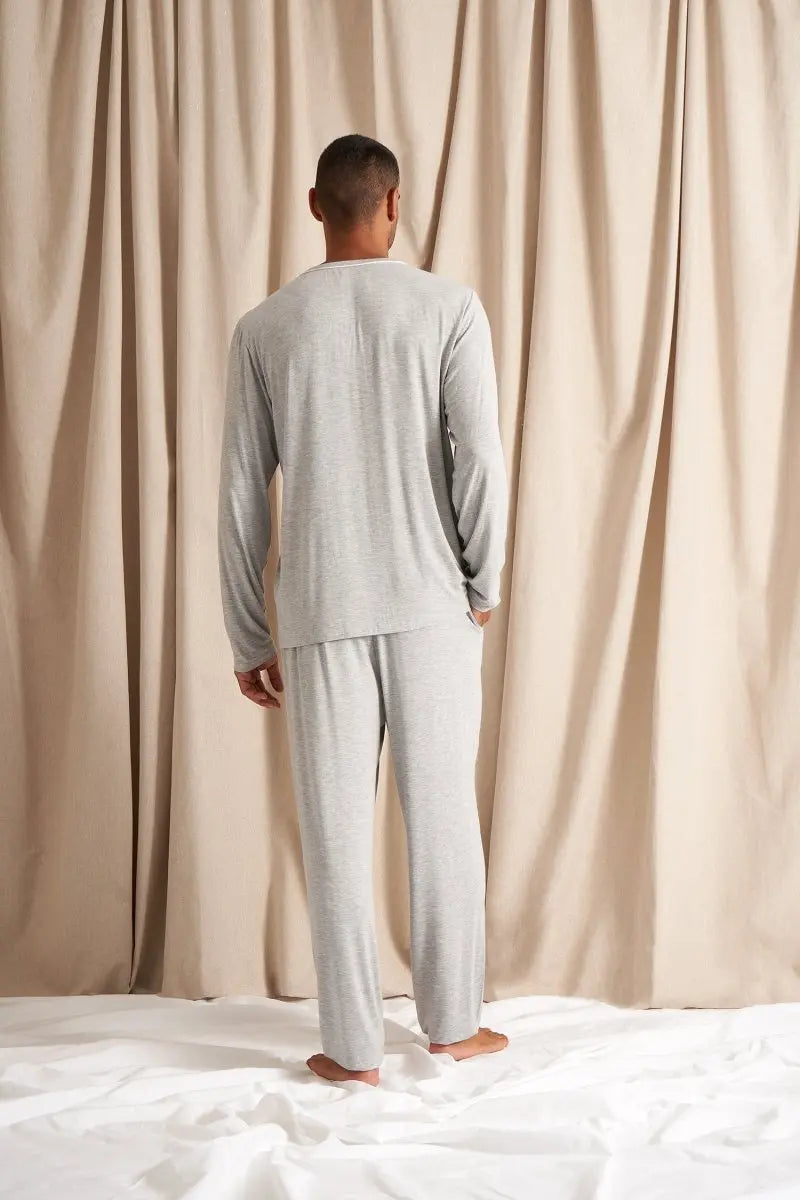 Available in four sophisticated colours—Grey Marl, Black, Green, and Midnight—this set features a long-sleeve top with a subtle pocket accent and full-length trousers with a cuffed ankle and an elasticated, functional tie waist for a customisable fit.