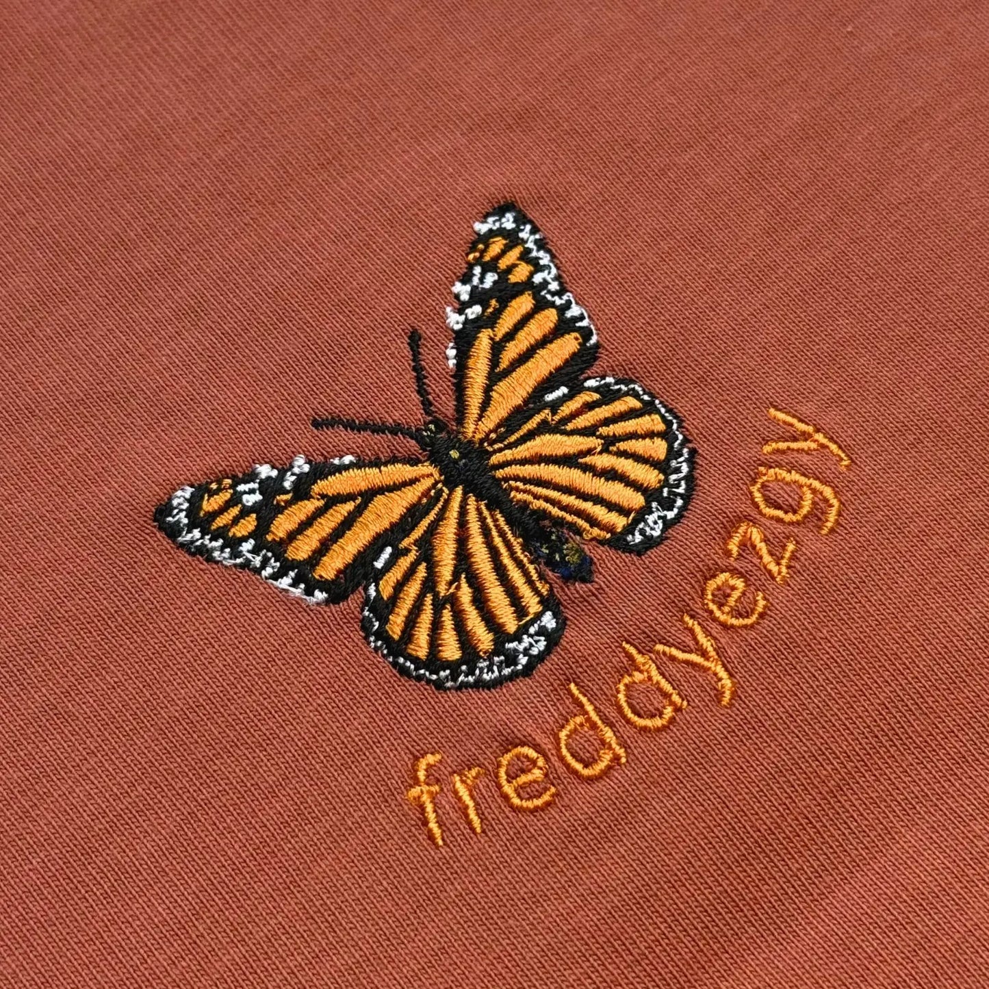 - Vibrant orange Monarch embroidery — a symbol of movement and migration.