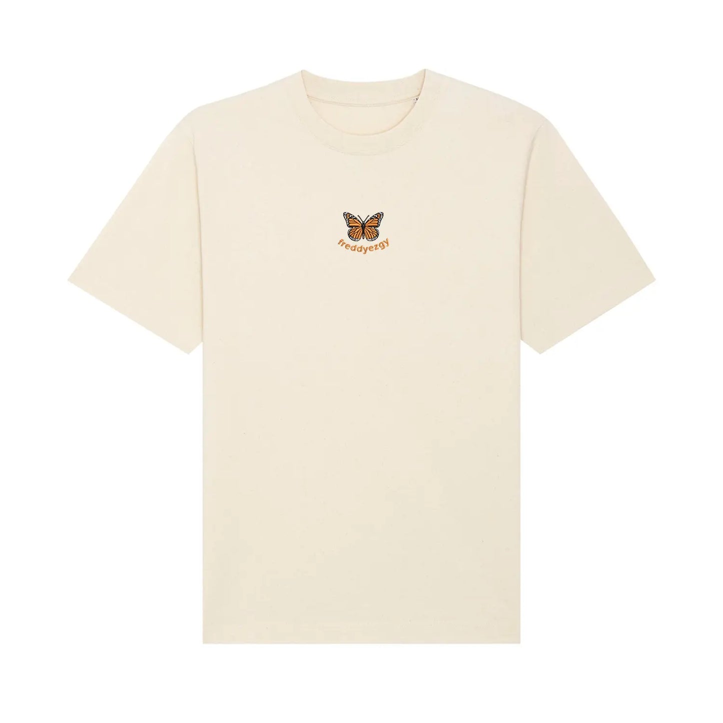 FREDDYEZGY pairs the Monarch’s vivid wings with earthy tones — from terracotta-like heritage brown to raw natural beige. The contrast feels grounded yet striking, giving the tee a depth that goes beyond a simple graphic print.