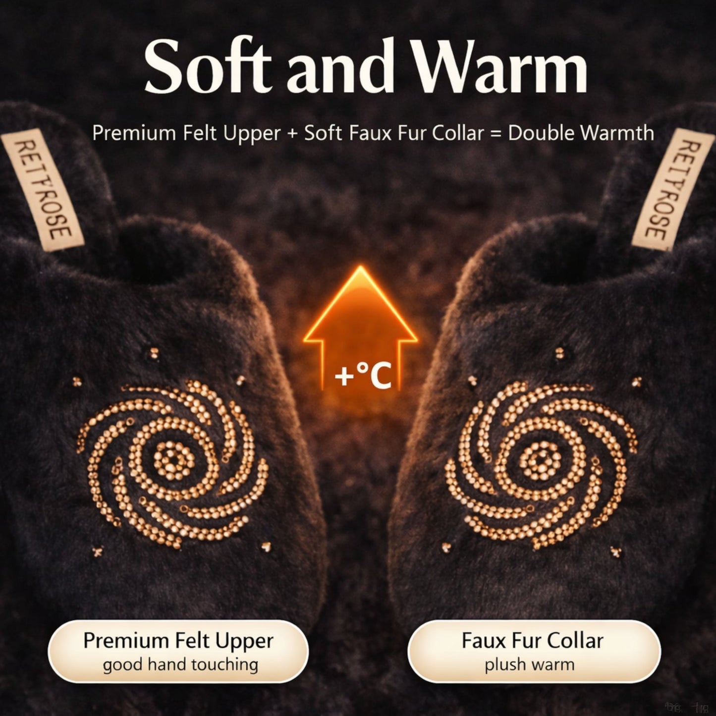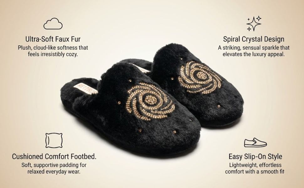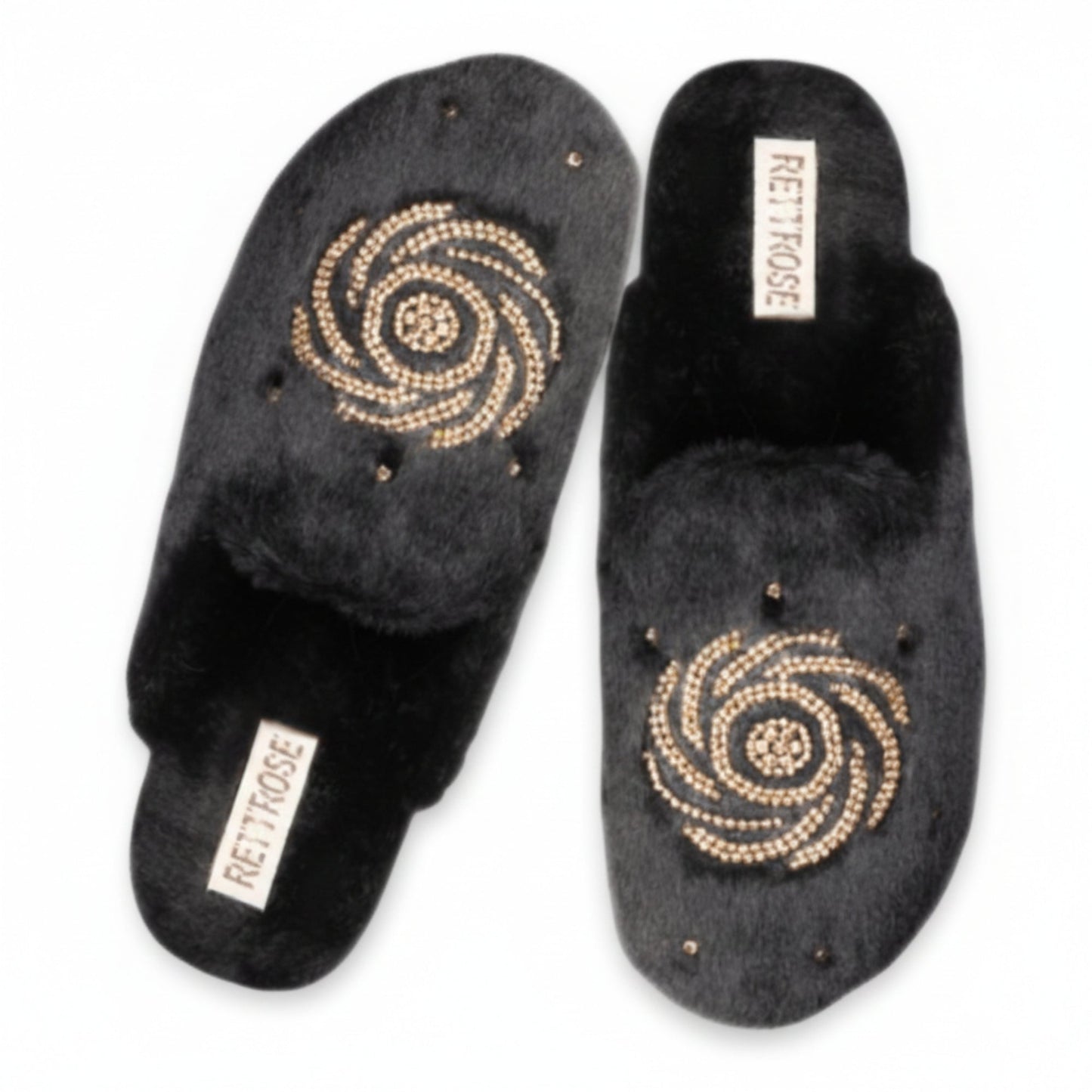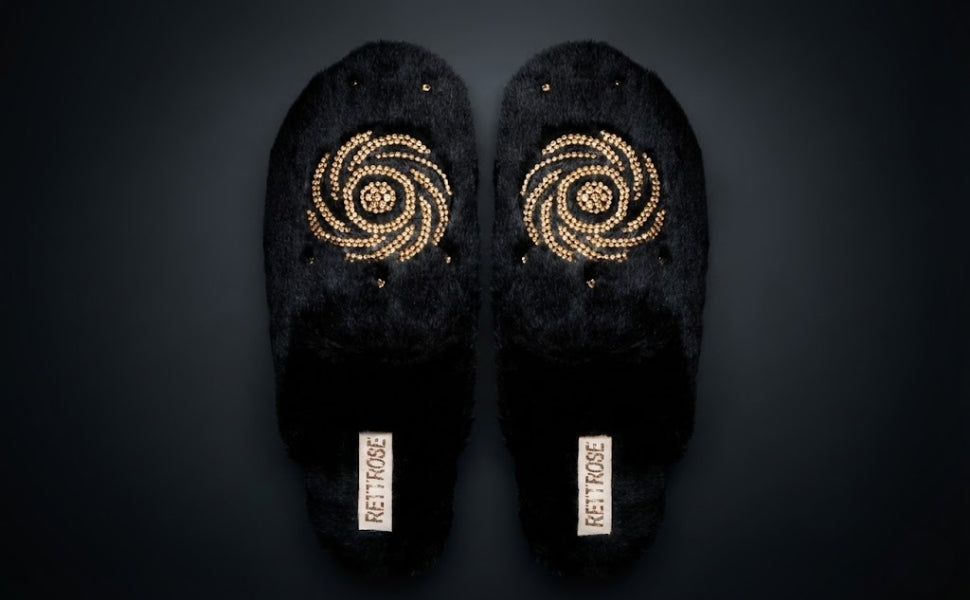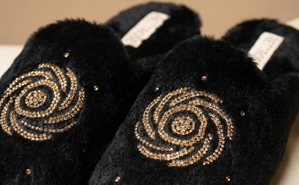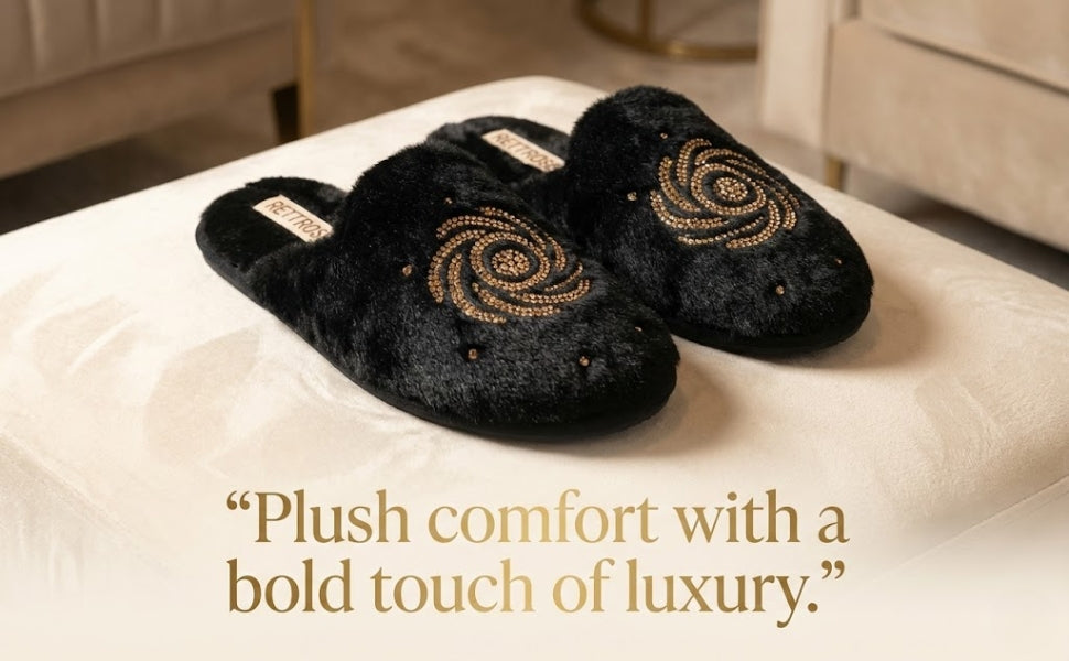 Each pair is handmade and individually decorated, making them truly unique and a reflection of fine craftsmanship. Whether you're relaxing at home or elevating your casual loungewear, the Morgan Noir slippers by RETTROSE deliver the perfect mix of comfort, elegance, and handcrafted luxury.