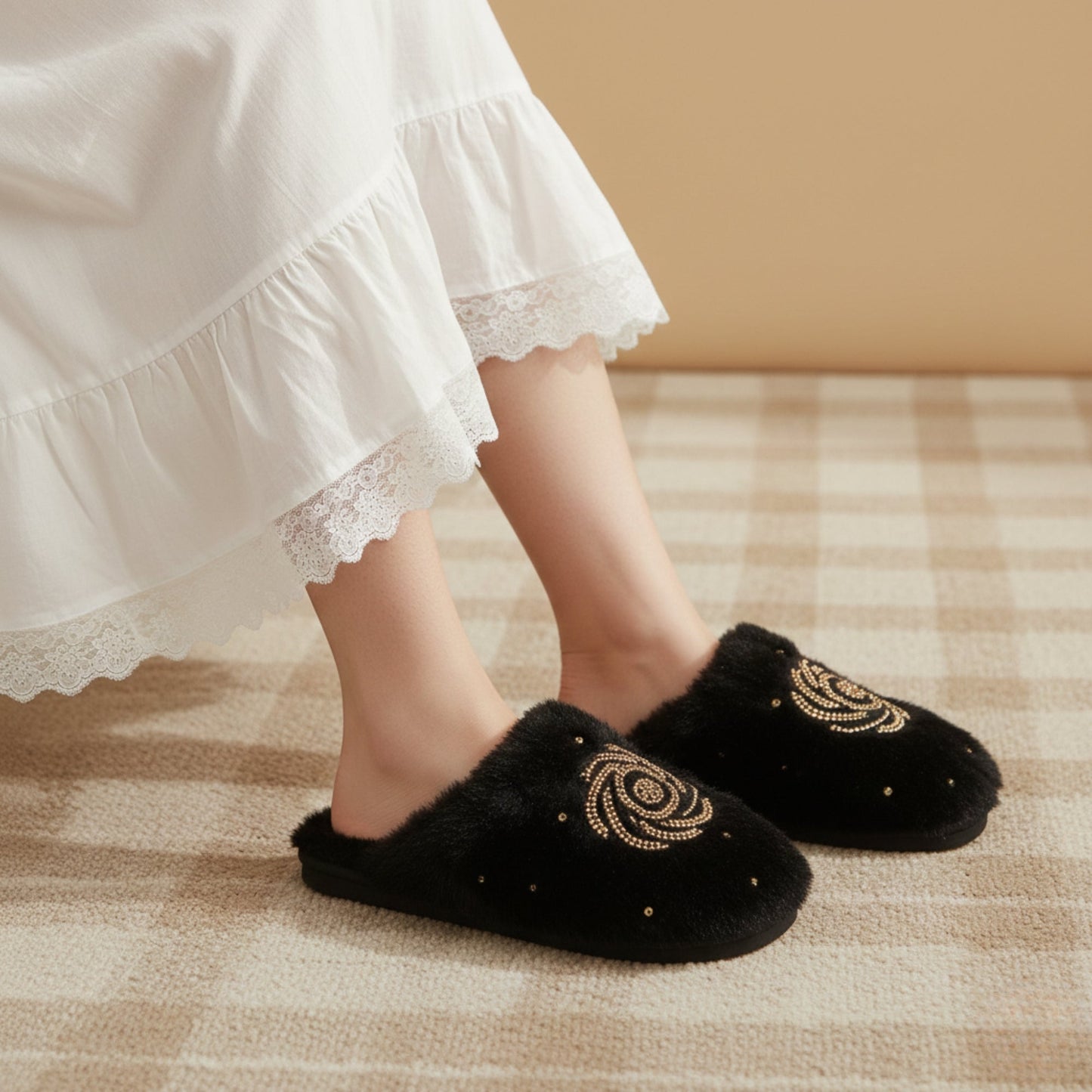 Morgan Black Luxury Faux Fur Comfortable Diamanté Embellished Women’s Handmade Slippers