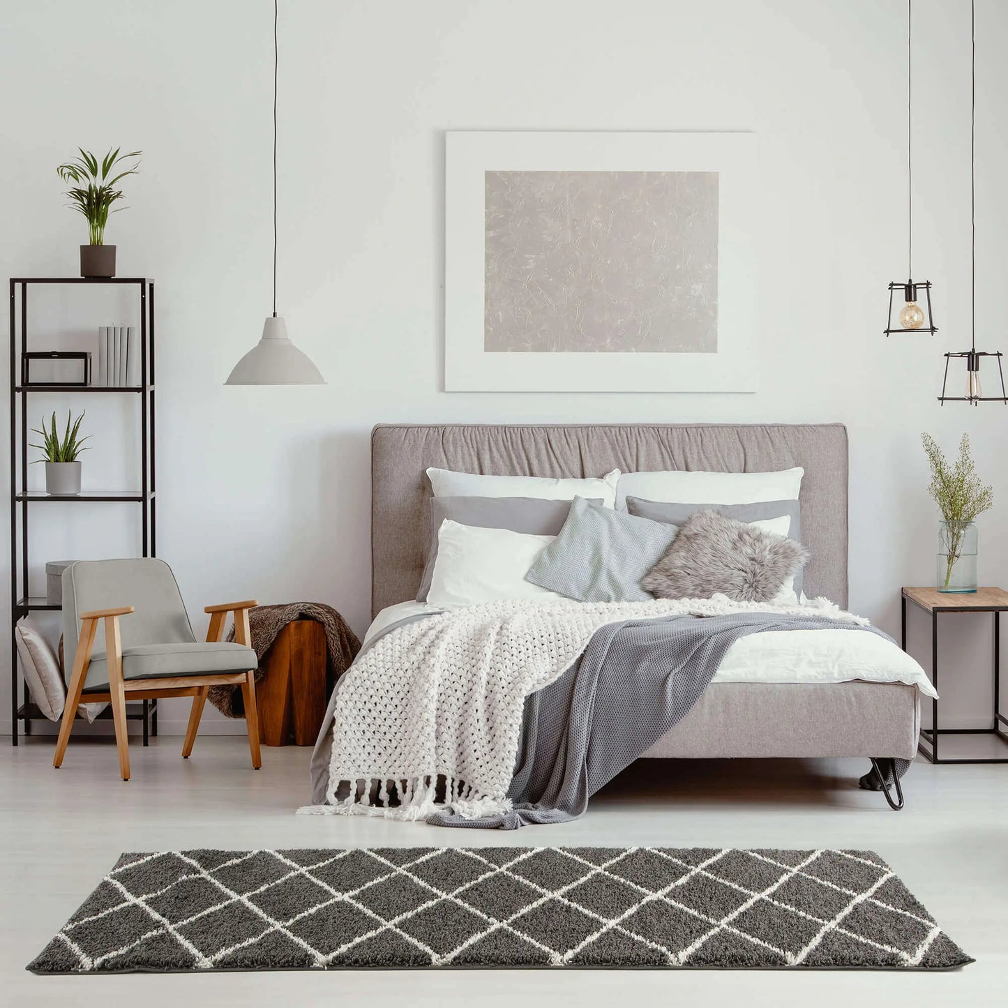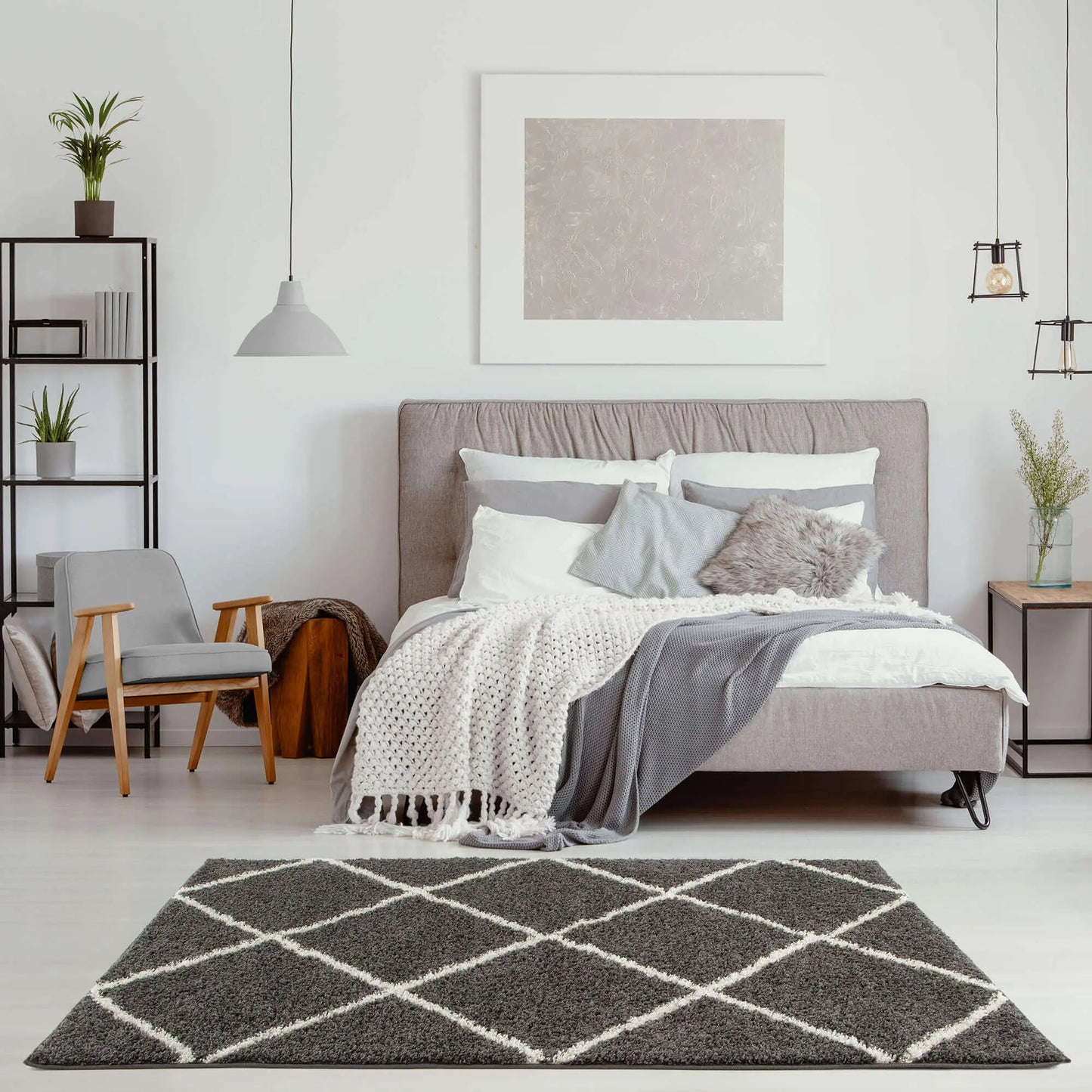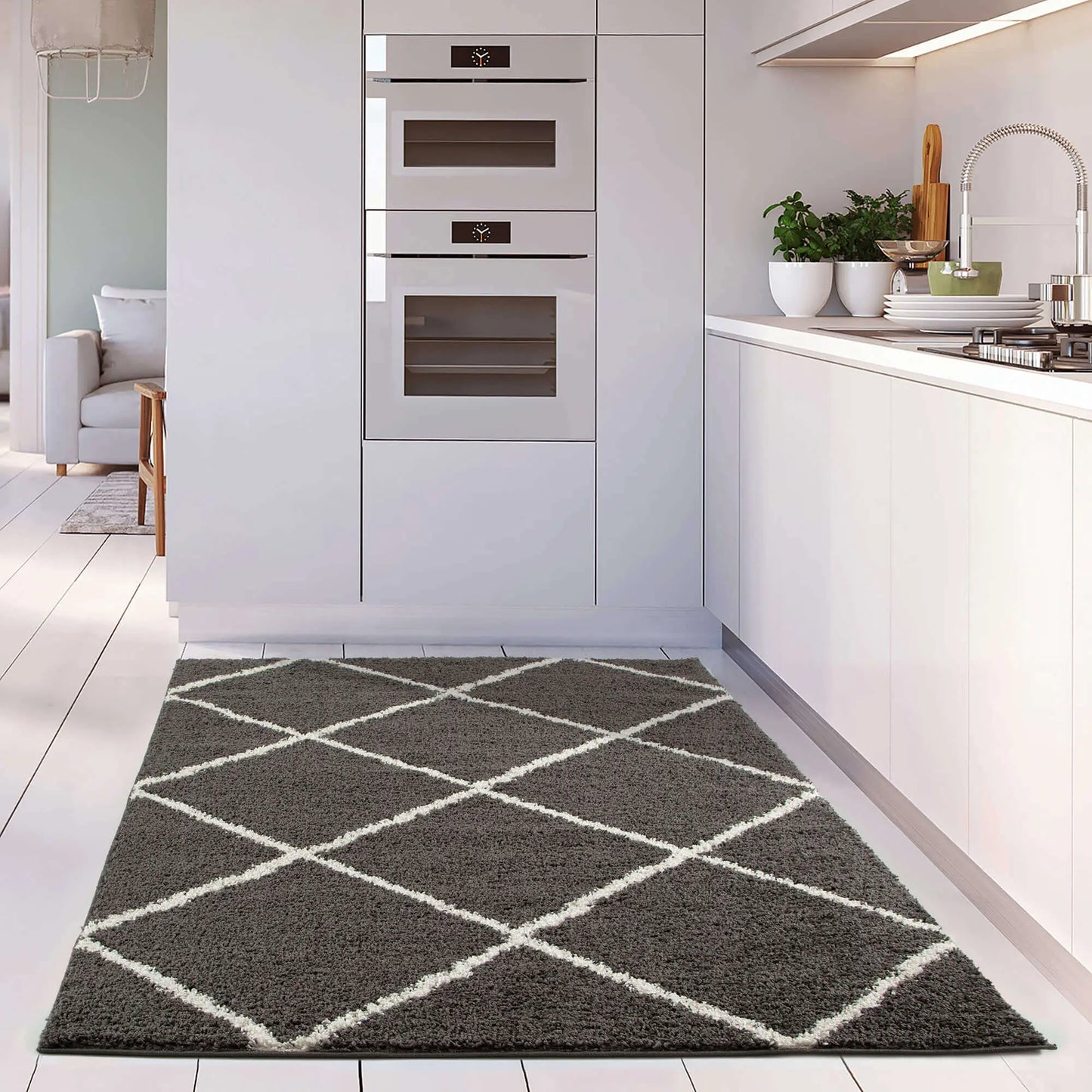 Diamond Design Thick Shaggy Area Rugs Dark Grey has a pile height of 30mm and is thicker than other shaggy rugs. The design of the shaggy rug conveys an exquisite look and rich feel and a pleasing choice of patterns. This rug can easily suit any room, classic or modern.