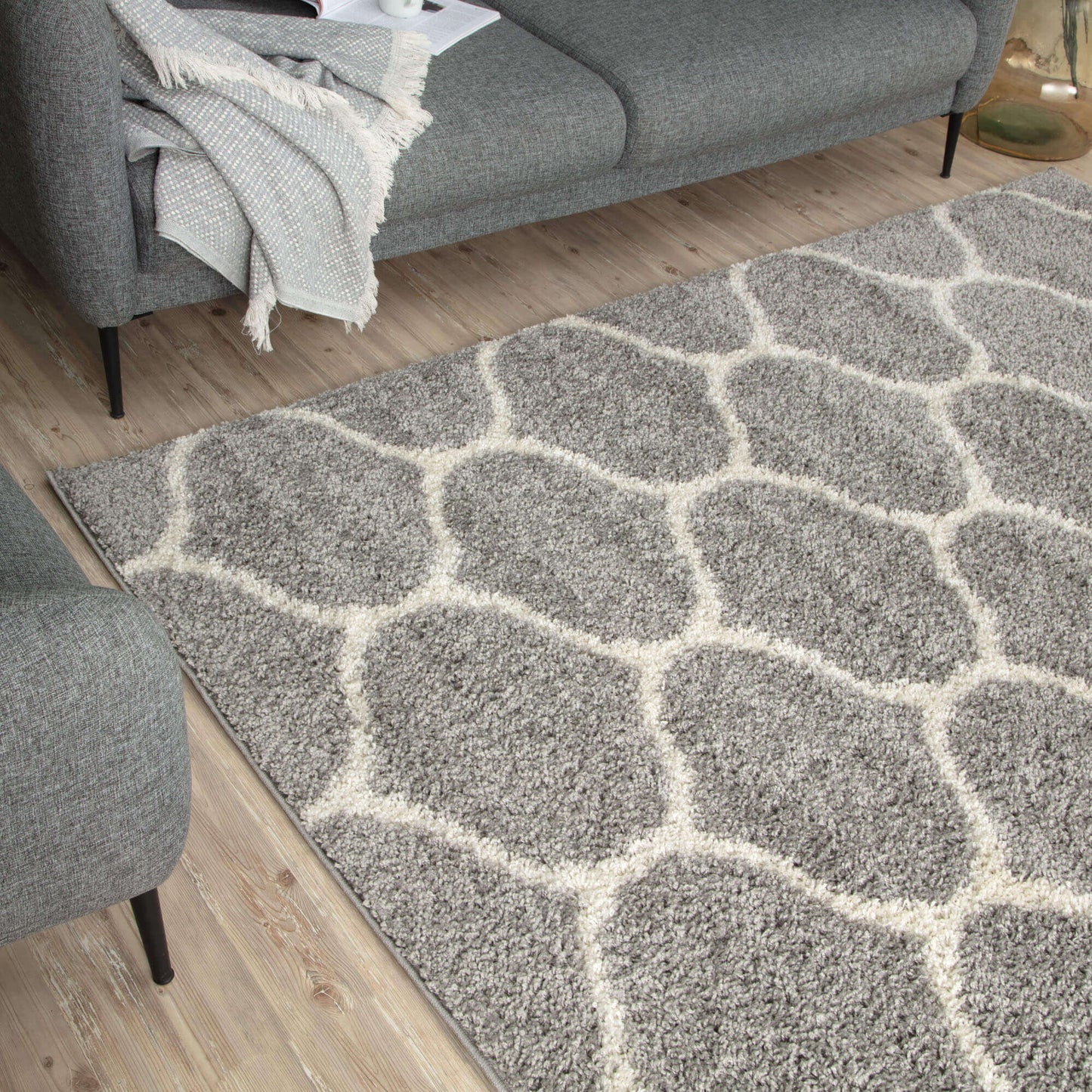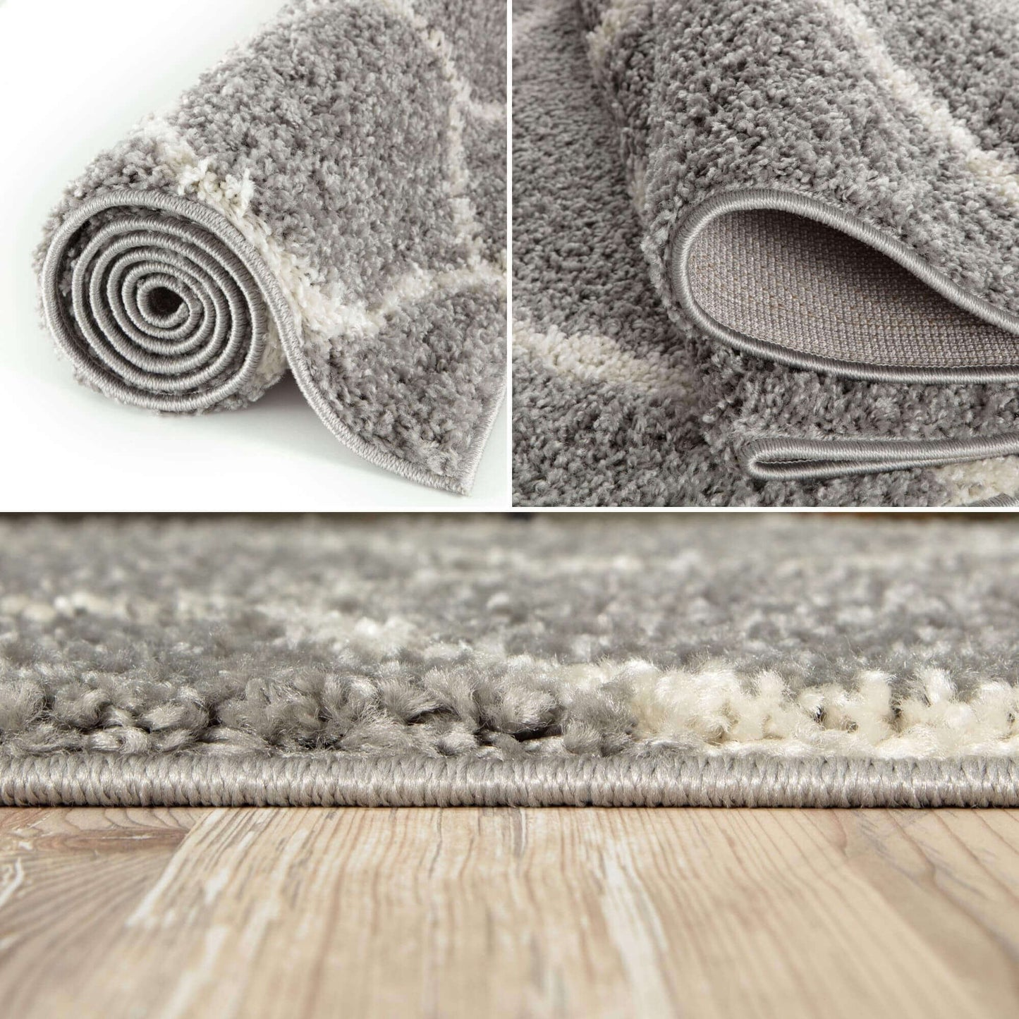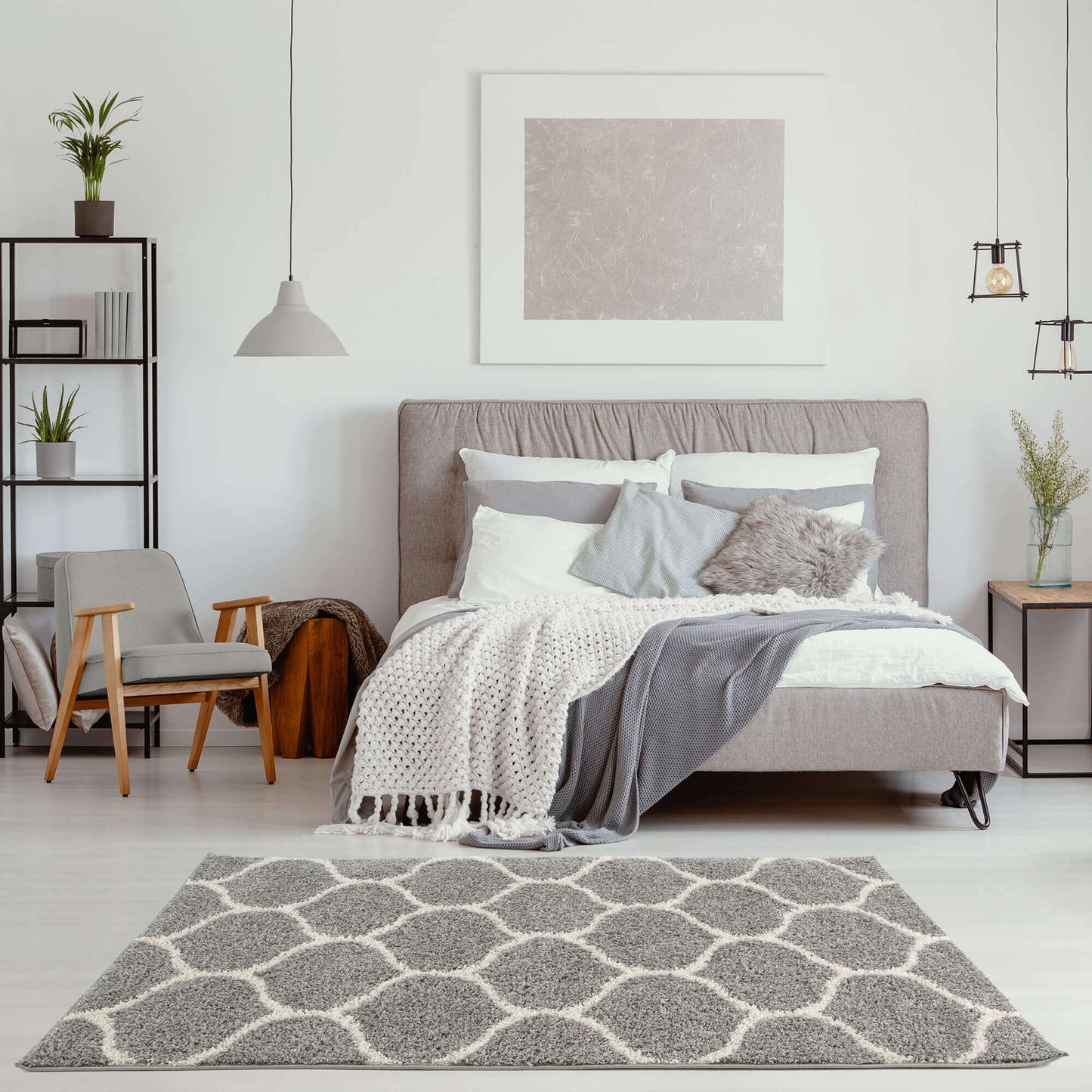 Trellis Design Thick Shaggy Area Rugs Grey has a pile height of 30mm and is thicker than other shaggy rugs. The design of the shaggy rug conveys an exquisite look and rich feel and a pleasing choice of patterns. This rug can easily suit any room, classic or modern.