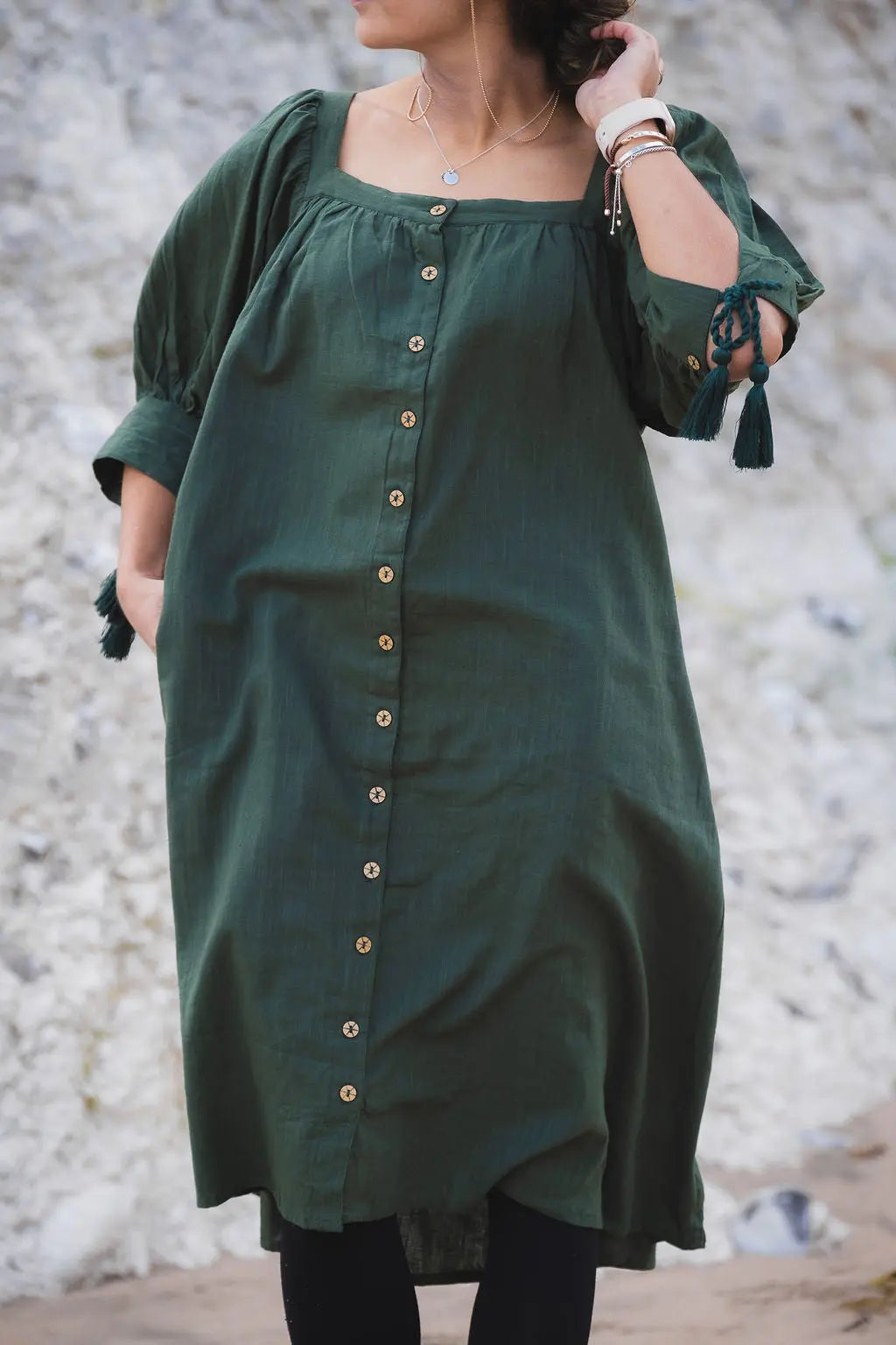 If you find it a little too long, you can safety pin the shoulders up a notch allowing you to get the perfect knee length for the winter months and still lets you notch it down come the summer months. Square neck is the main feature with blouson sleeves finished with removable tassels.