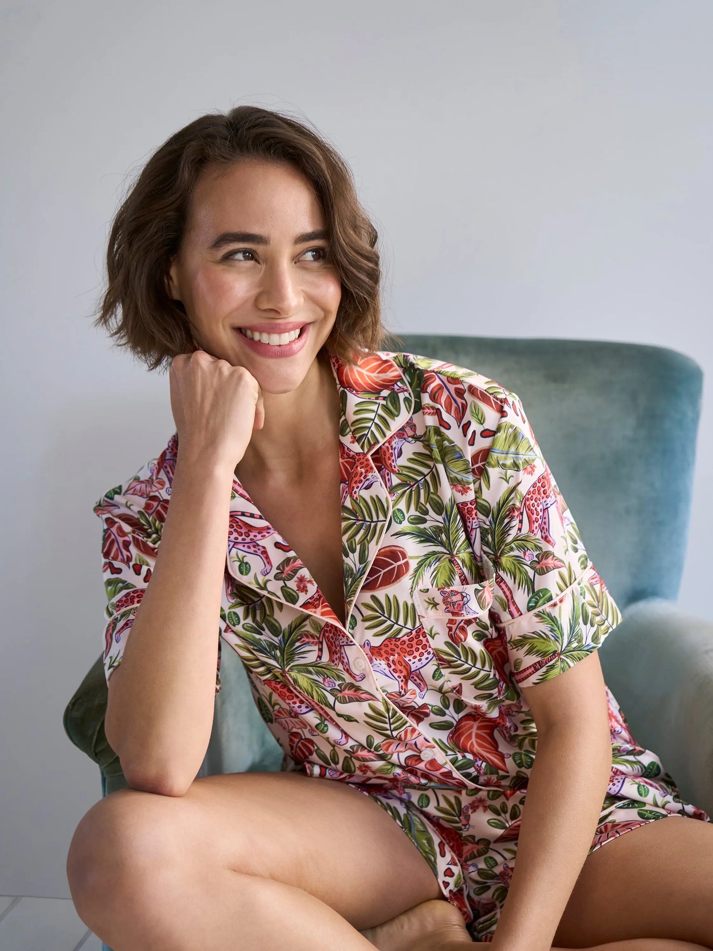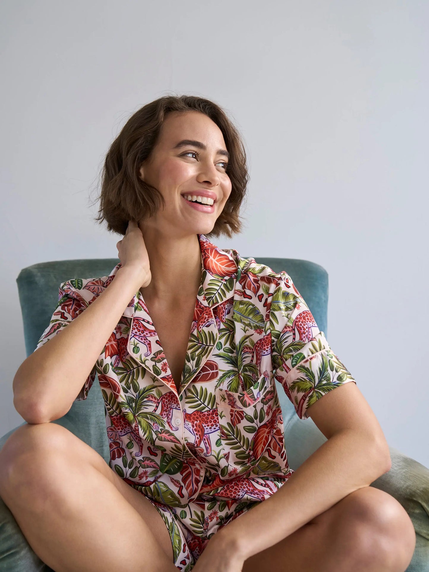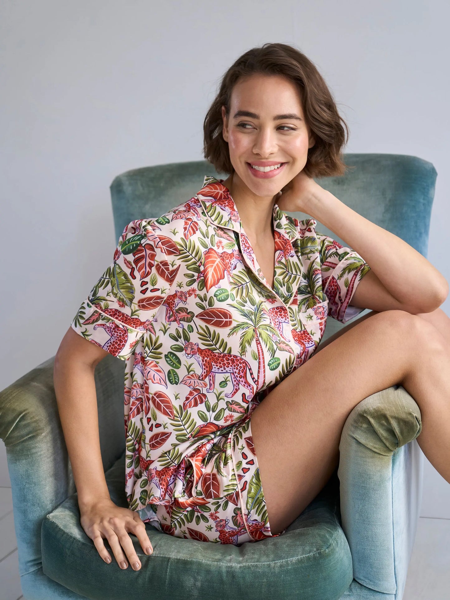Slip into the Tropical Safari set and let your evenings feel a little more adventurous. Bold tropical print, sleek contrast piping, and silky recycled satin — this is the short set that's colourful, uplifting, and impossibly comfortable from the very first wear.