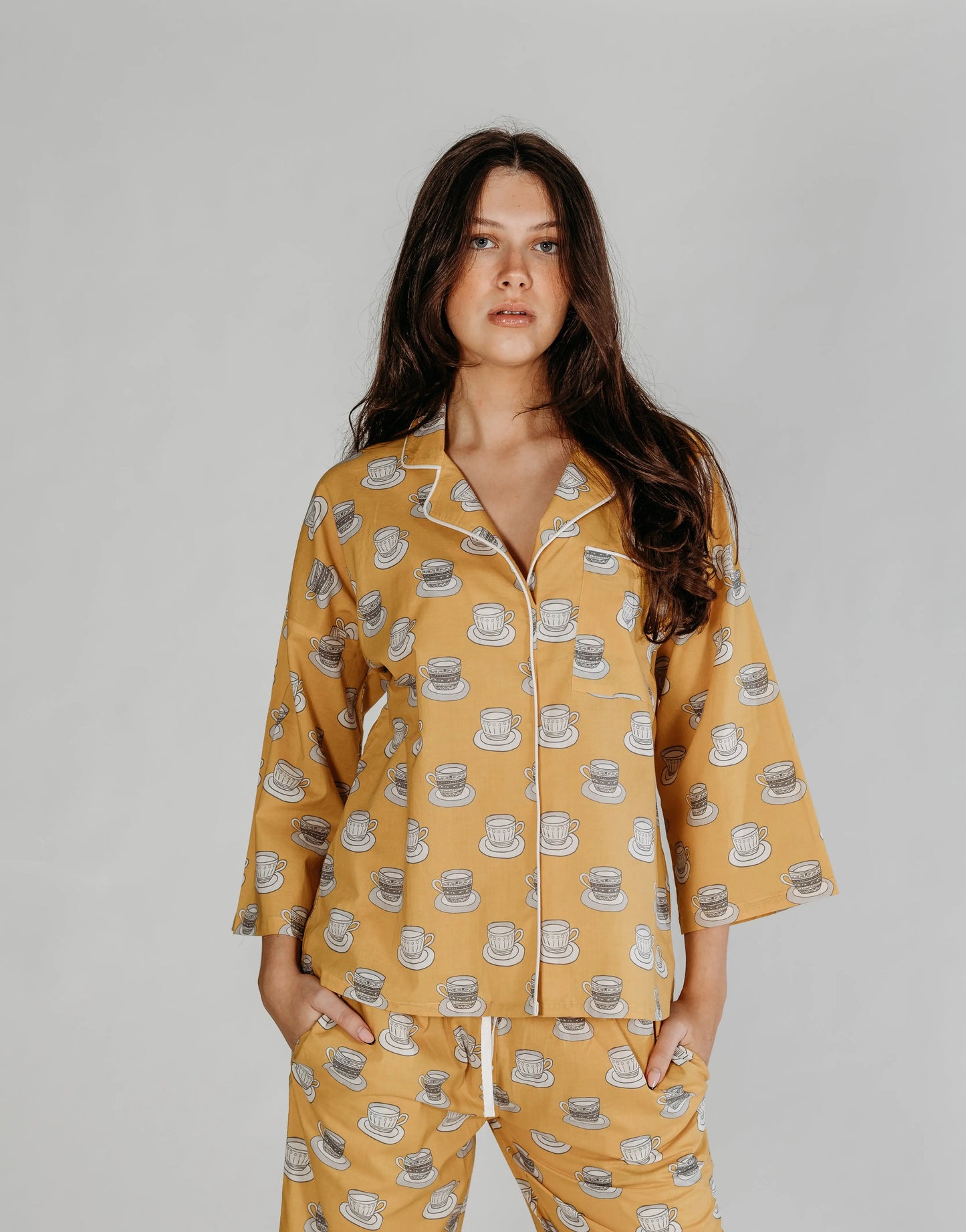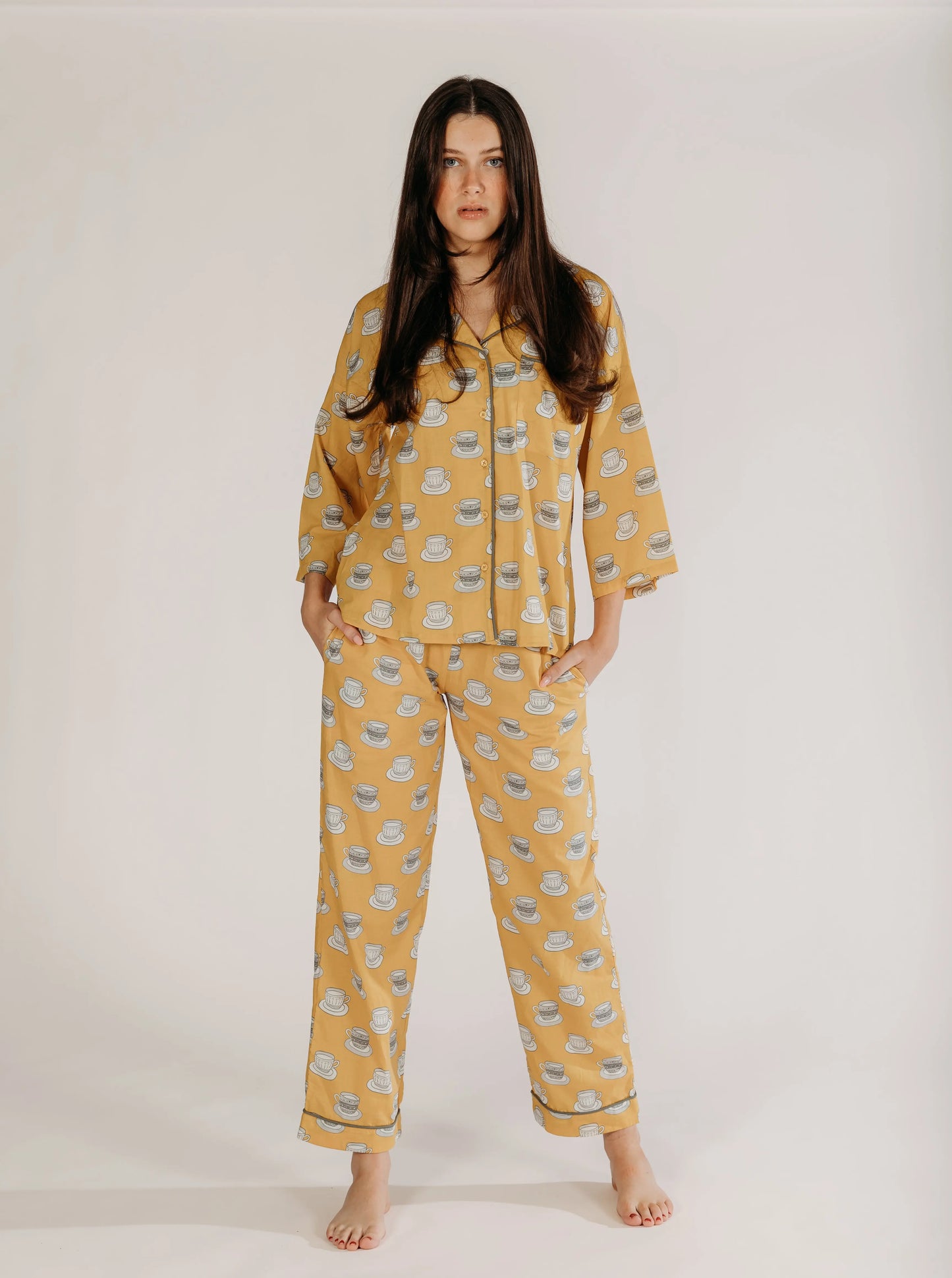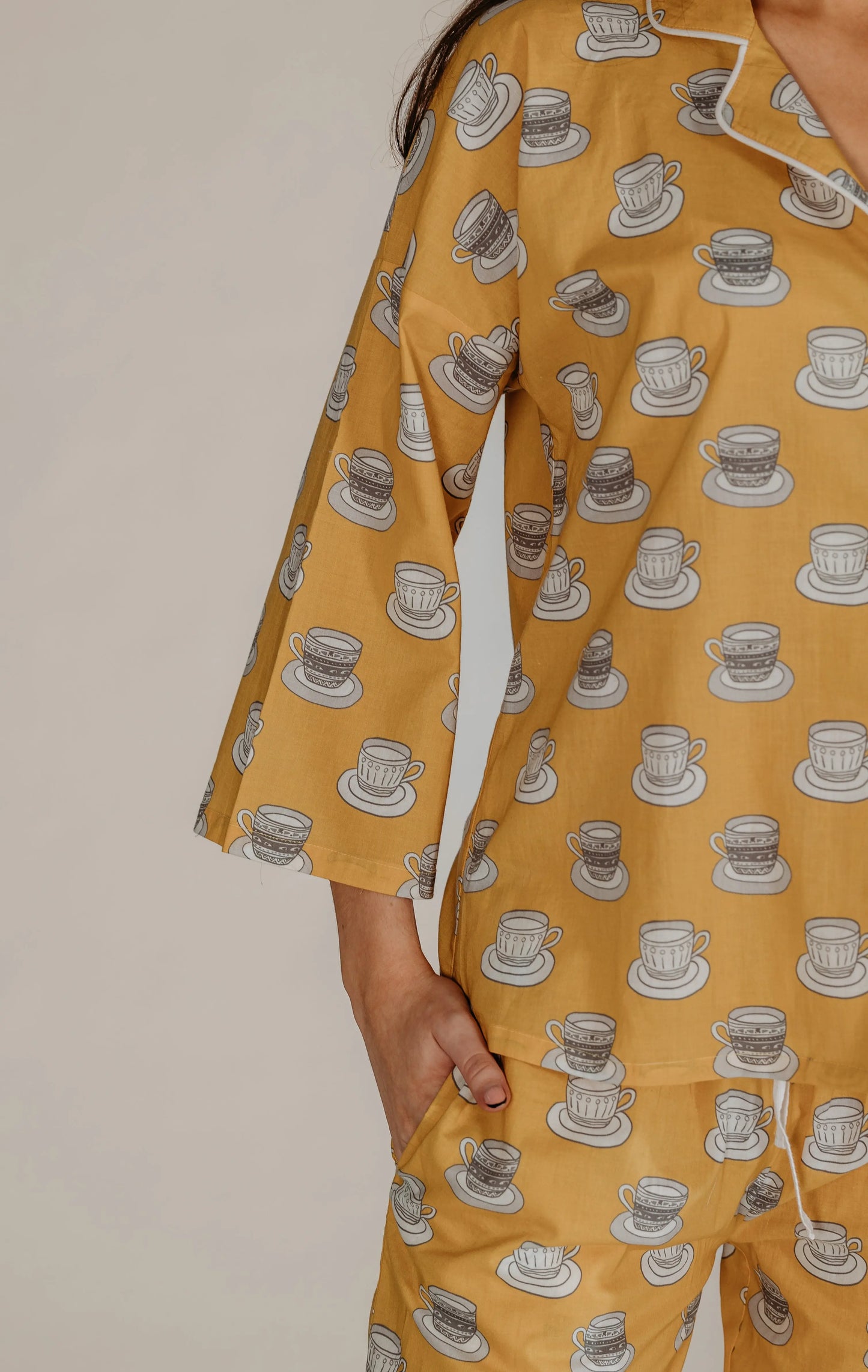 Inspiration taken from our ever loving love for tea!! This cutest cup and saucer print was hand drawn, Whether you are looking a gift for someone special or just a treat to wind down after a long day, our pyjamas are the perfect way to add a little bit of luxury to your evening routine.