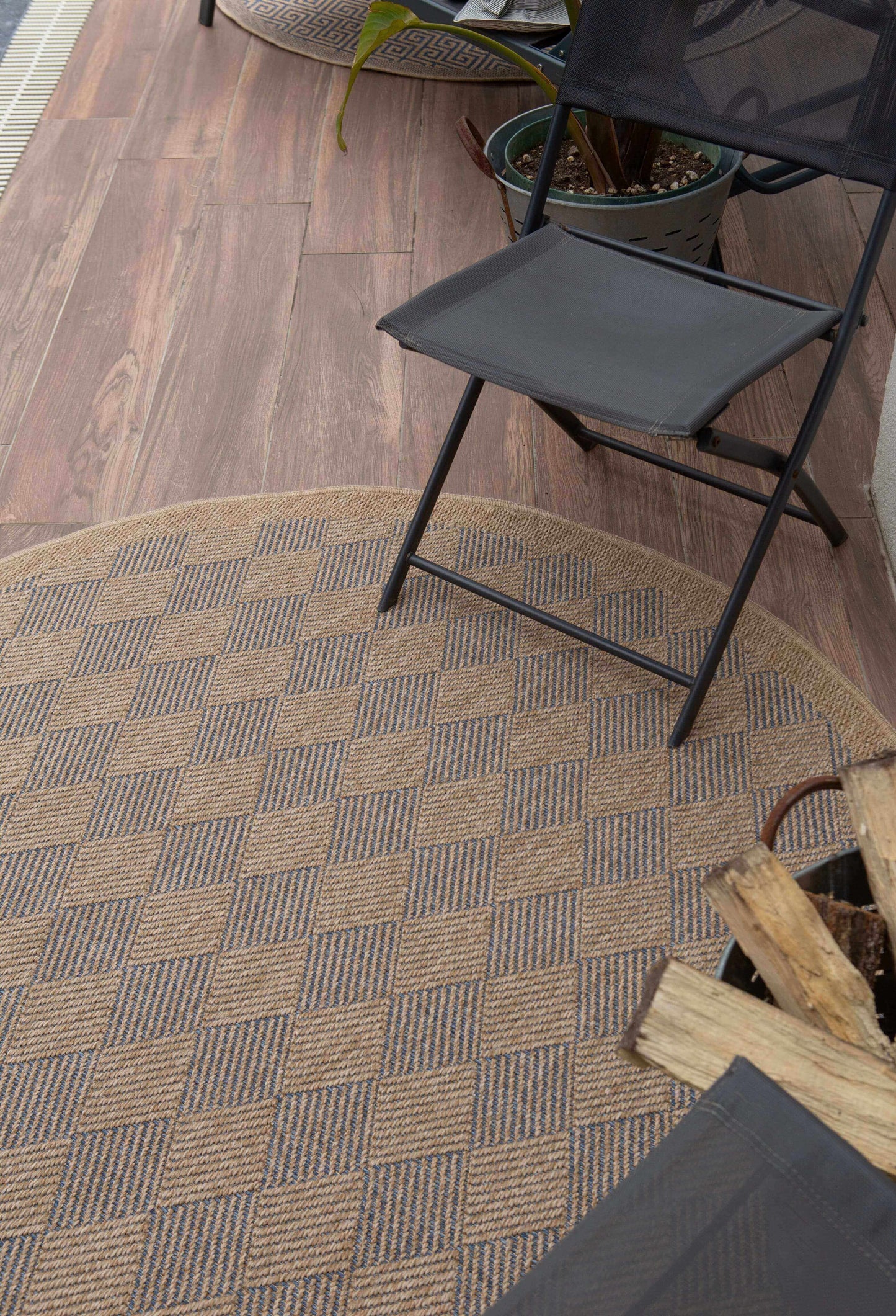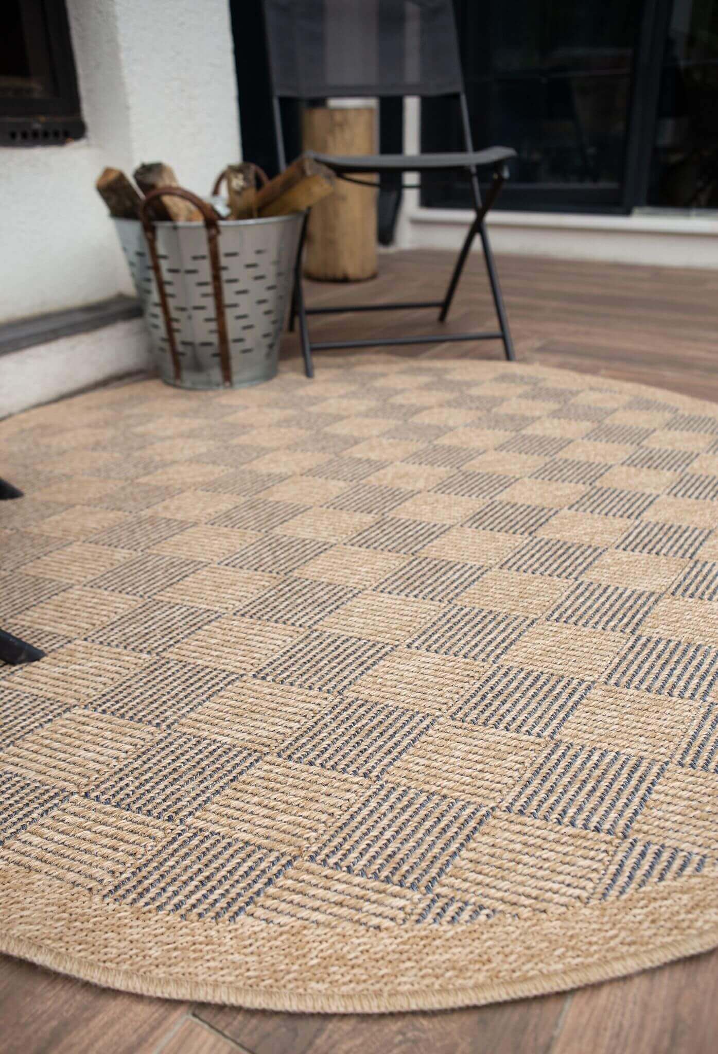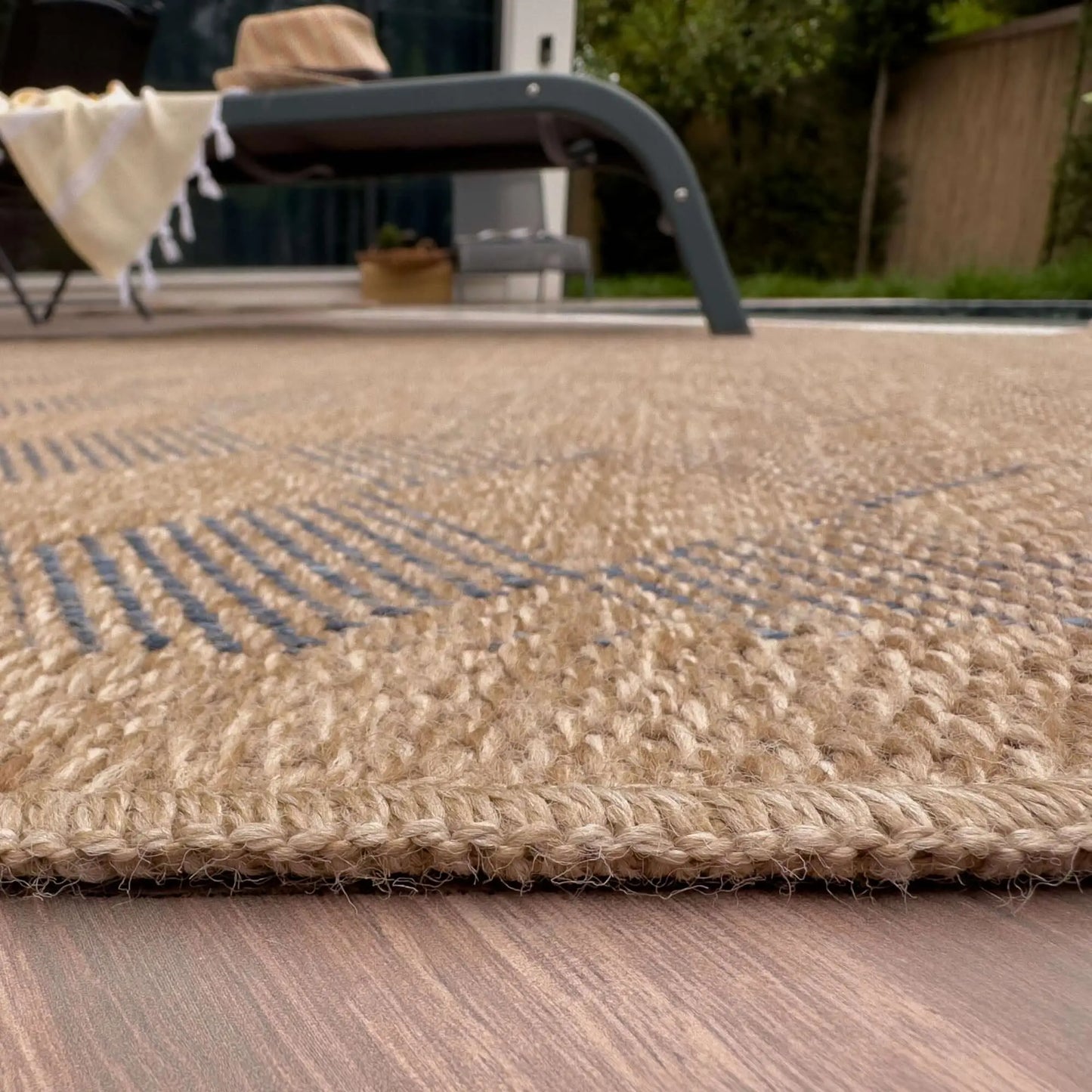 Choose from 6 size options and 4 natural jute-looking designs, including solid, greek key, square dots, and diamond, in 4 colour options including neutral, dark grey, green, and blue. With fringe on the edges, this rug brings a natural and organic ambience to any outdoor space.