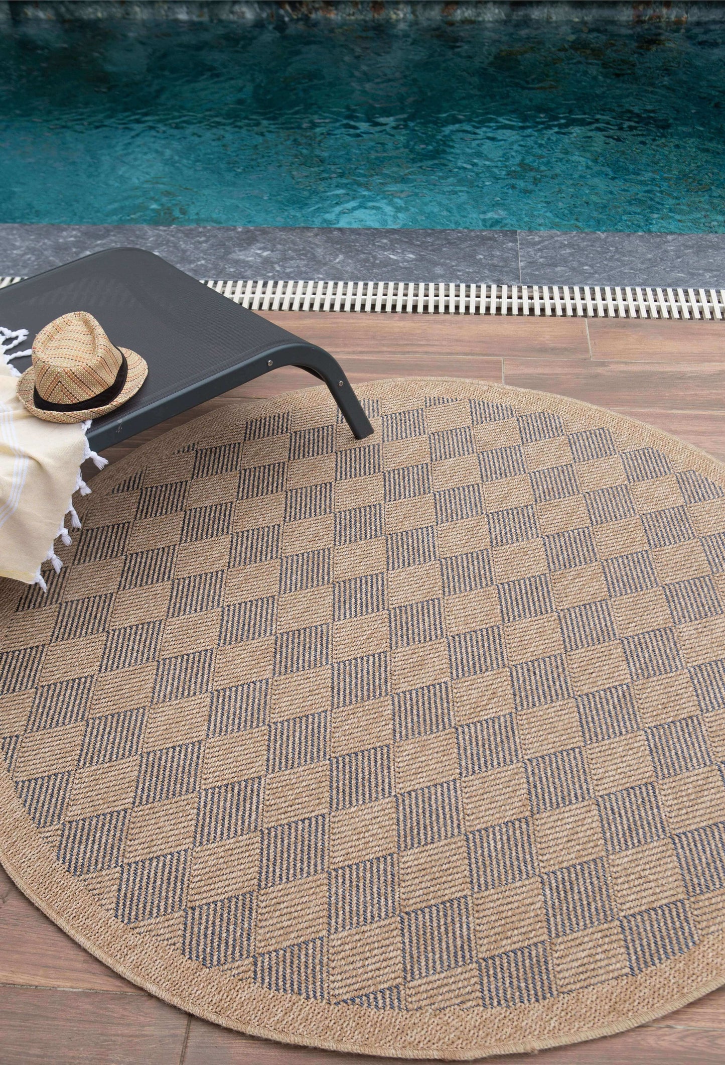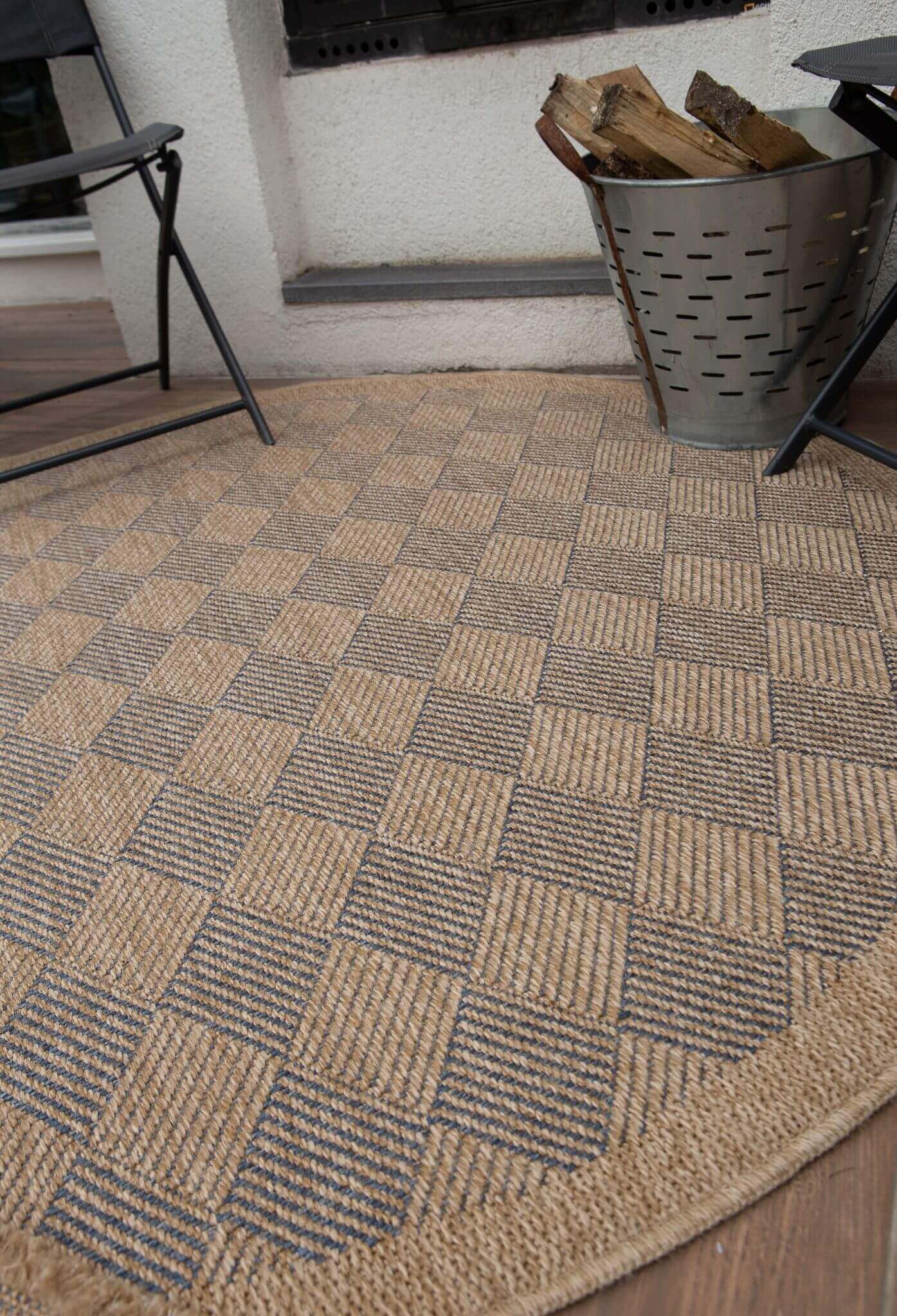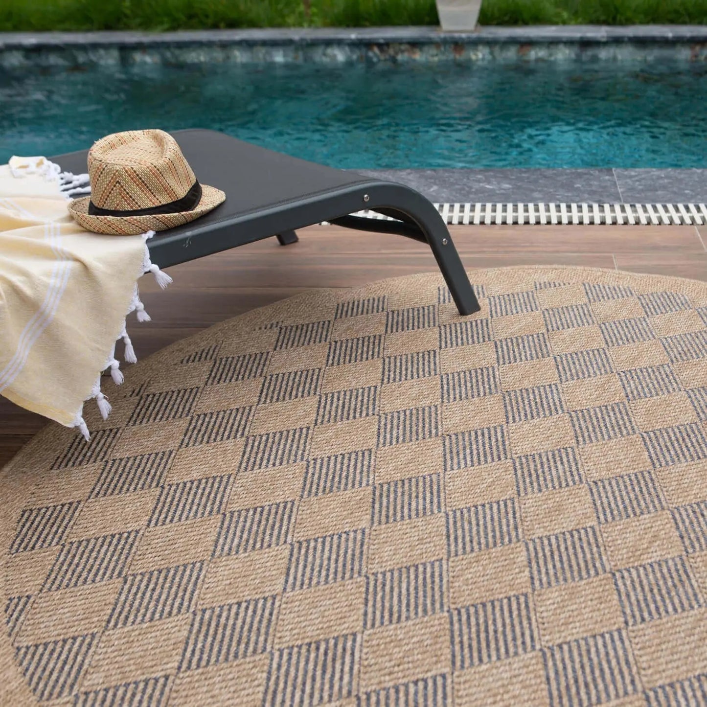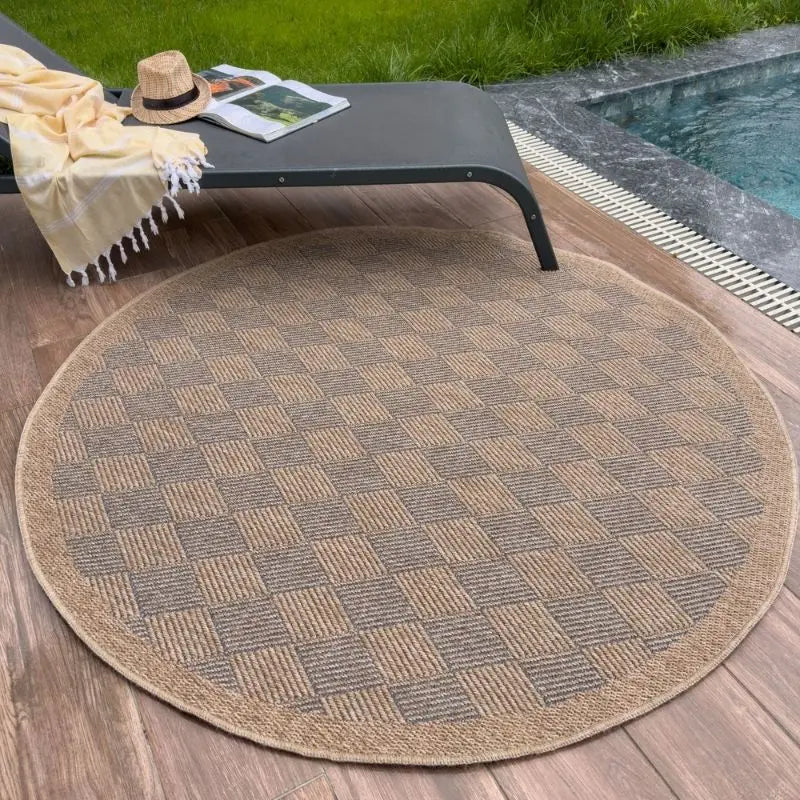 Choose from 6 size options and 4 natural jute-looking designs, including solid, greek key, square dots, and diamond, in 4 colour options including neutral, dark grey, green, and blue. With fringe on the edges, this rug brings a natural and organic ambience to any outdoor space.