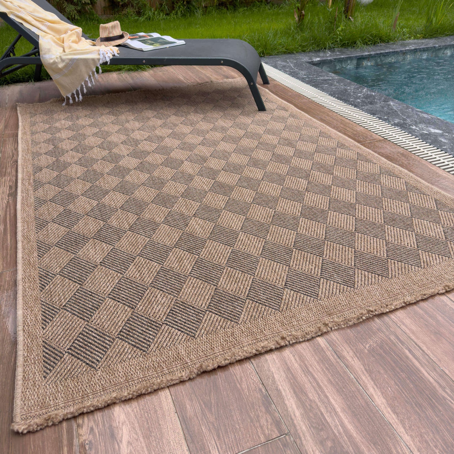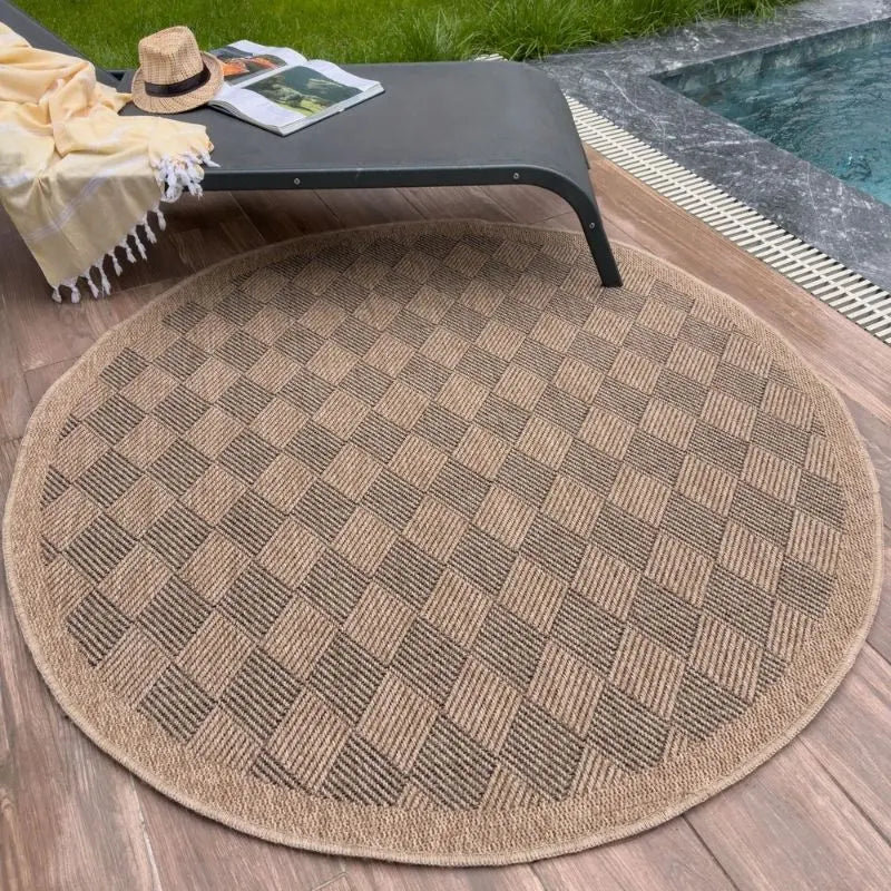 Choose from 6 size options and 4 natural jute-looking designs, including solid, greek key, square dots, and diamond, in 4 colour options including neutral, dark grey, green, and blue. With fringe on the edges, this rug brings a natural and organic ambience to any outdoor space.