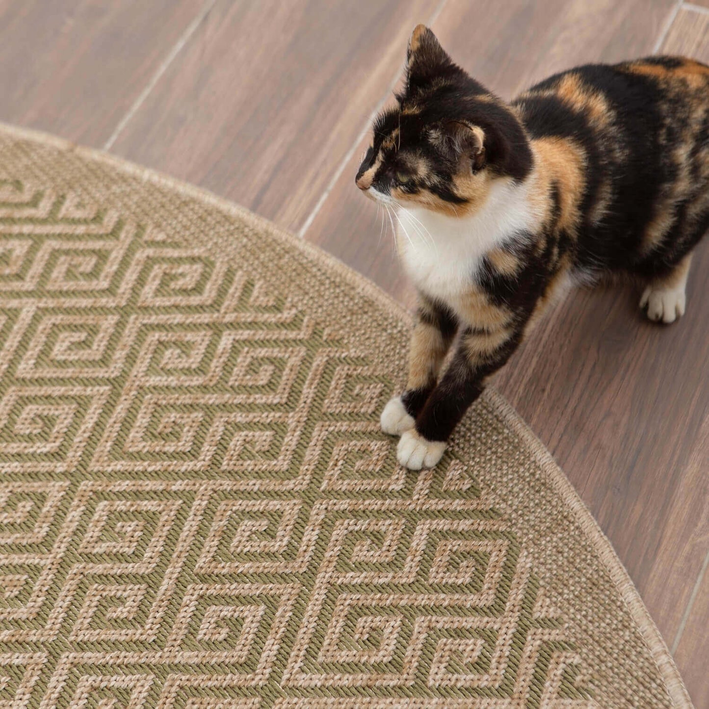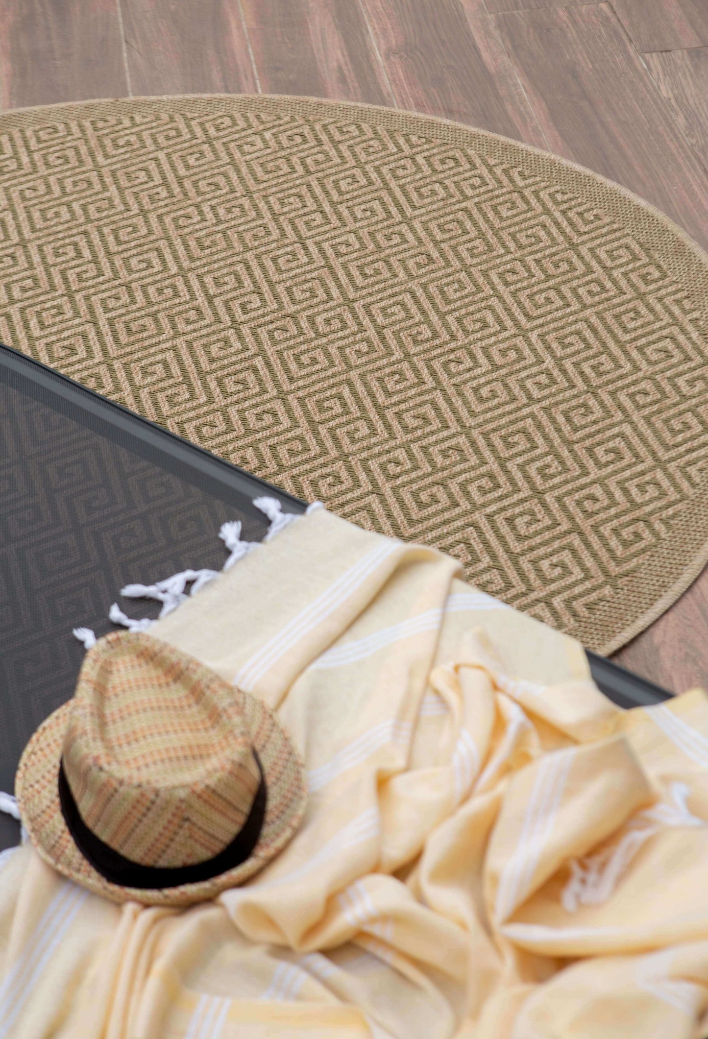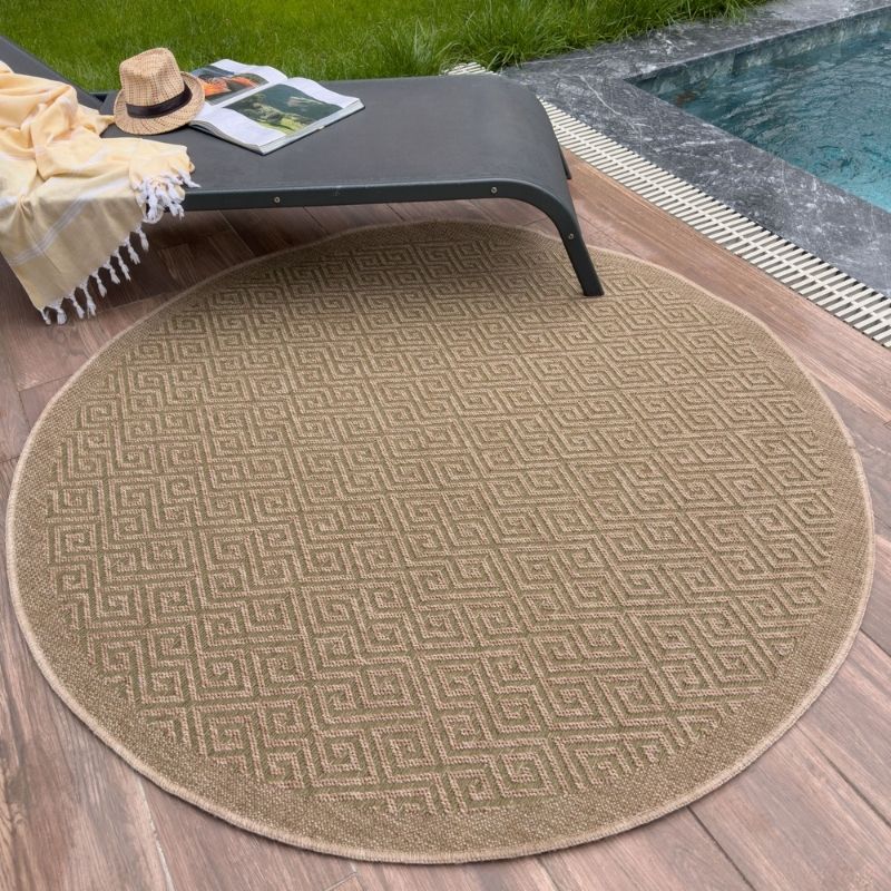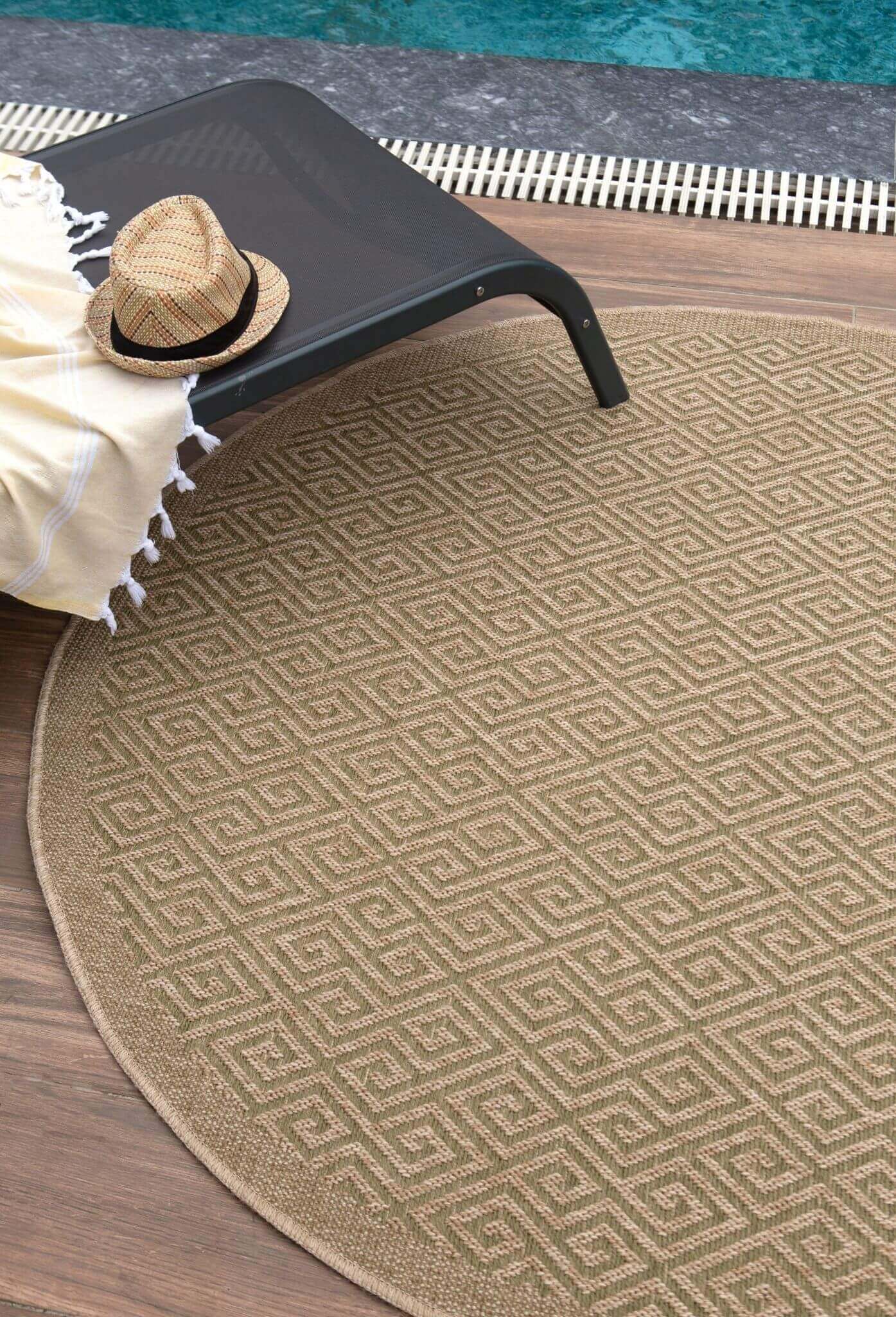 Choose from 6 size options and 4 natural jute-looking designs, including solid, greek key, square dots, and diamond, in 4 colour options including neutral, dark grey, green, and blue. With fringe on the edges, this rug brings a natural and organic ambience to any outdoor space.