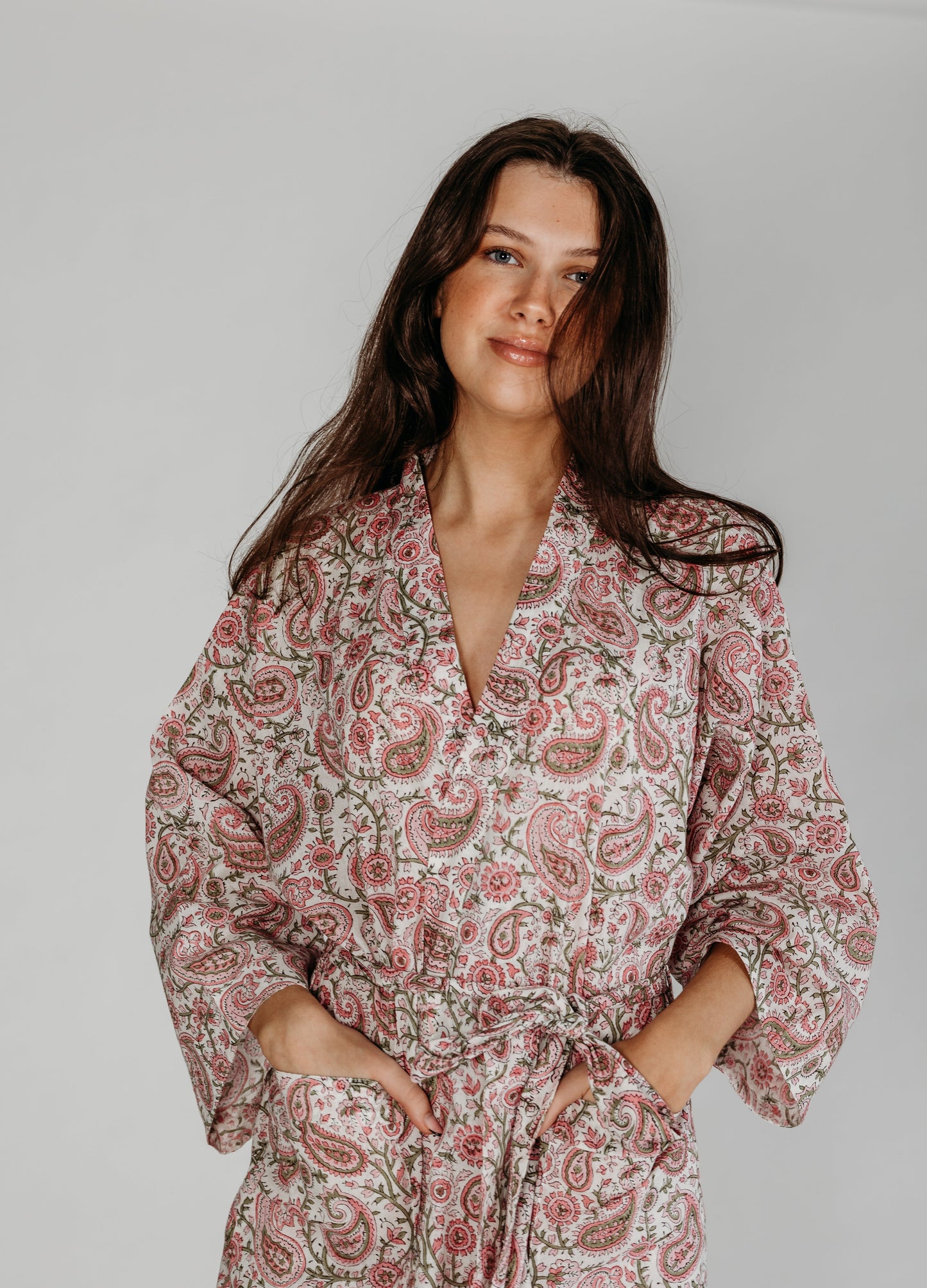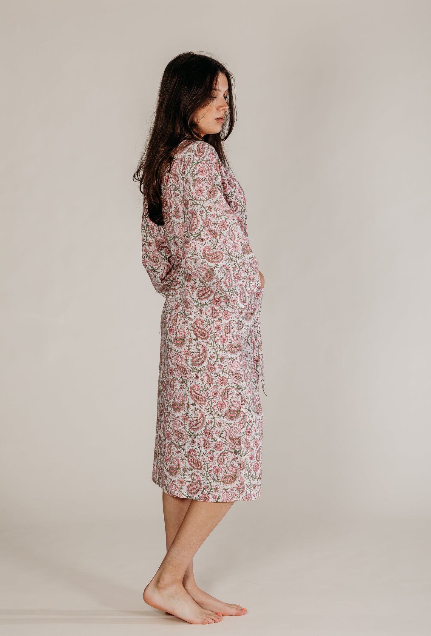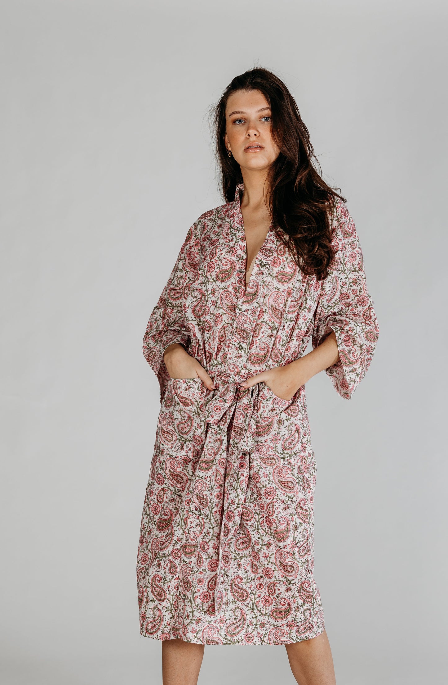 Wrap yourself in comfort with our hand block printed cotton robe, made from 100% natural fabric by our small team in India. Perfect for summer holidays, it's like taking a friend on holiday. This generously sized robe features two front pockets and makes an ideal bridesmaid gift. Versatile and stylish, it's great for lounging, beach cover-ups, or post-bath relaxation.Hand block printed by our small team in India