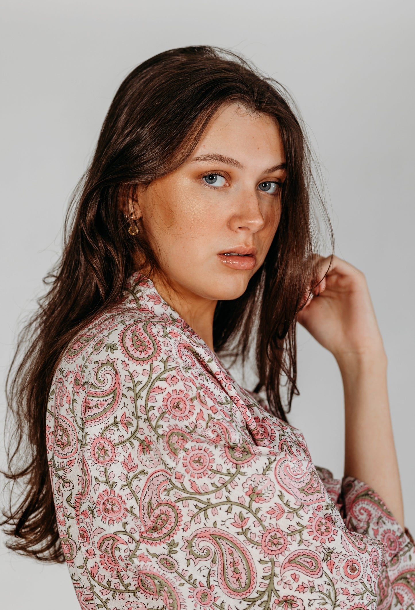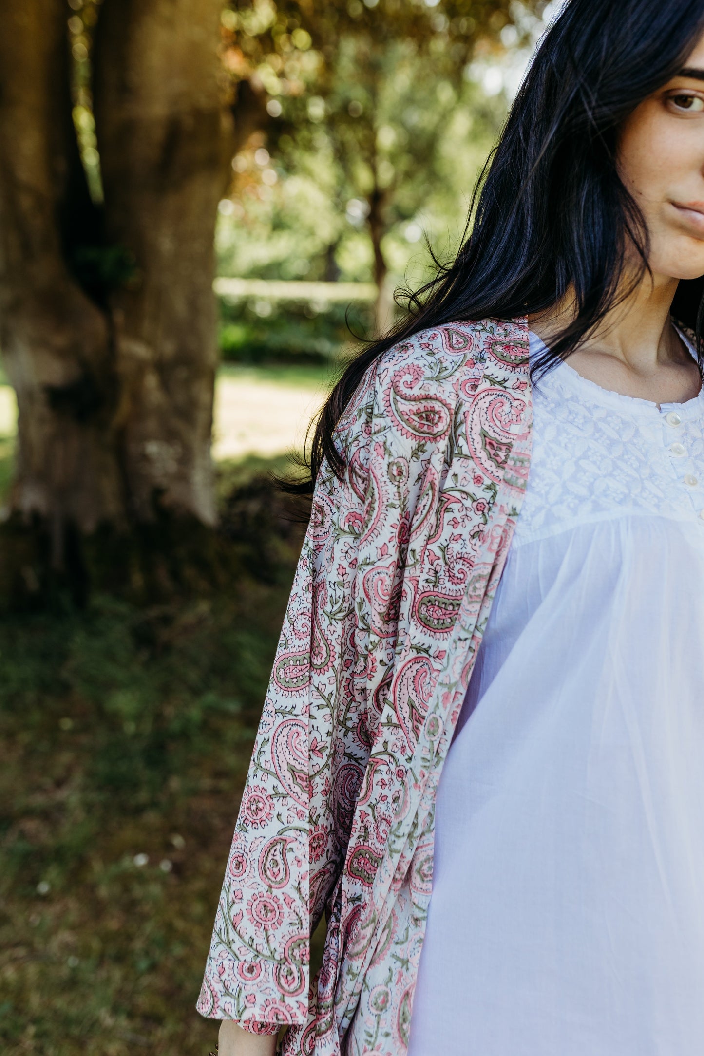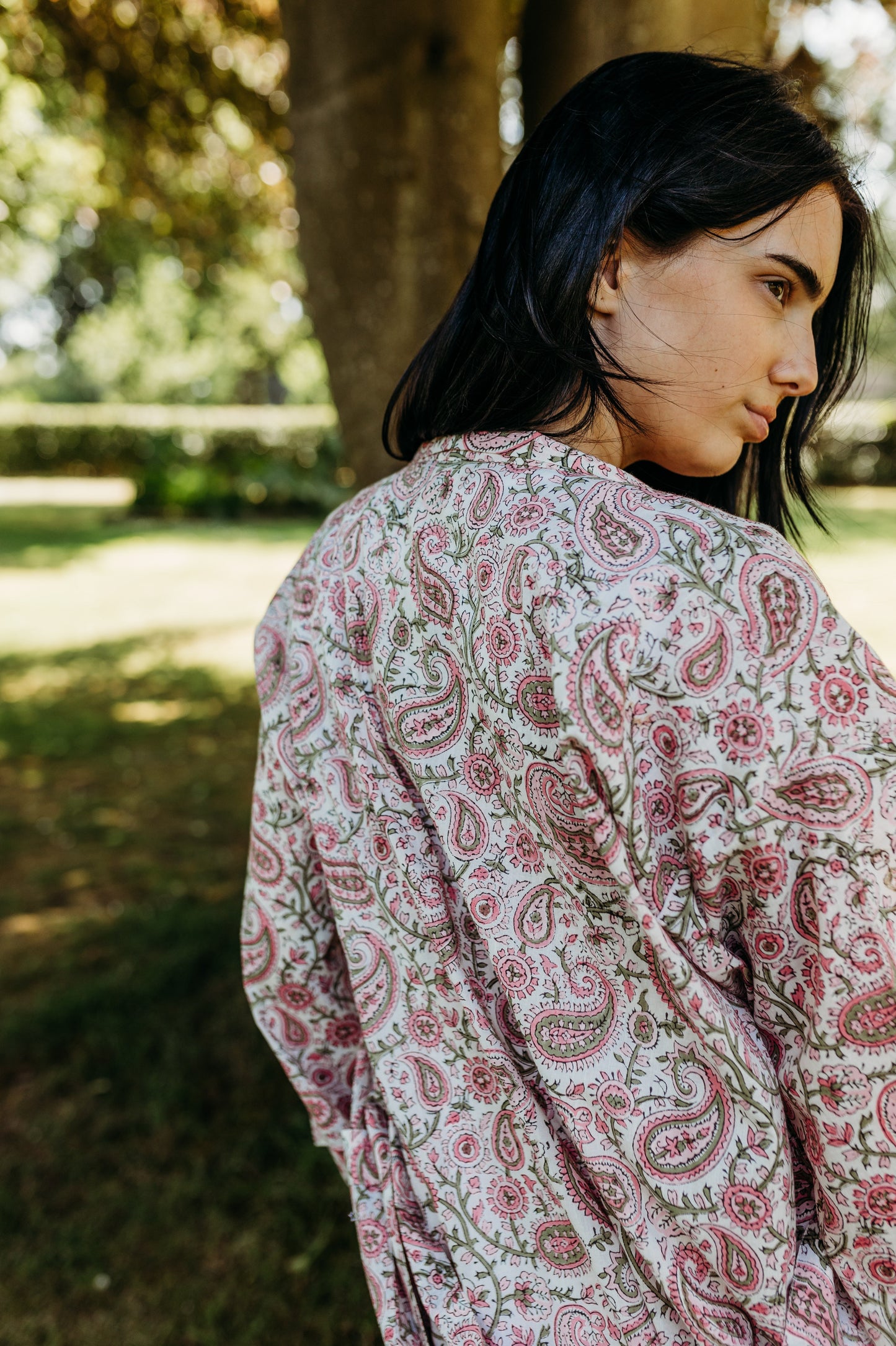 Wrap yourself in comfort with our hand block printed cotton robe, made from 100% natural fabric by our small team in India. Perfect for summer holidays, it's like taking a friend on holiday. This generously sized robe features two front pockets and makes an ideal bridesmaid gift. Versatile and stylish, it's great for lounging, beach cover-ups, or post-bath relaxation.Hand block printed by our small team in India