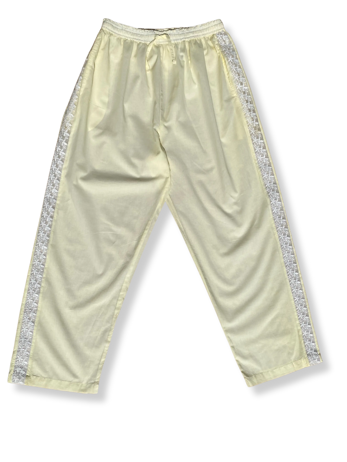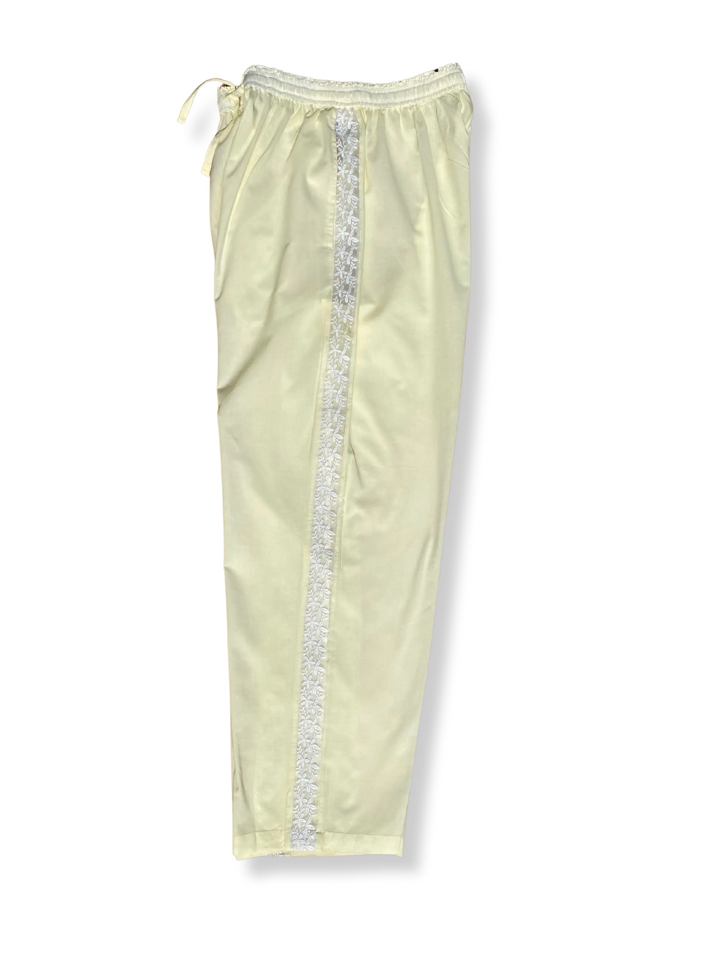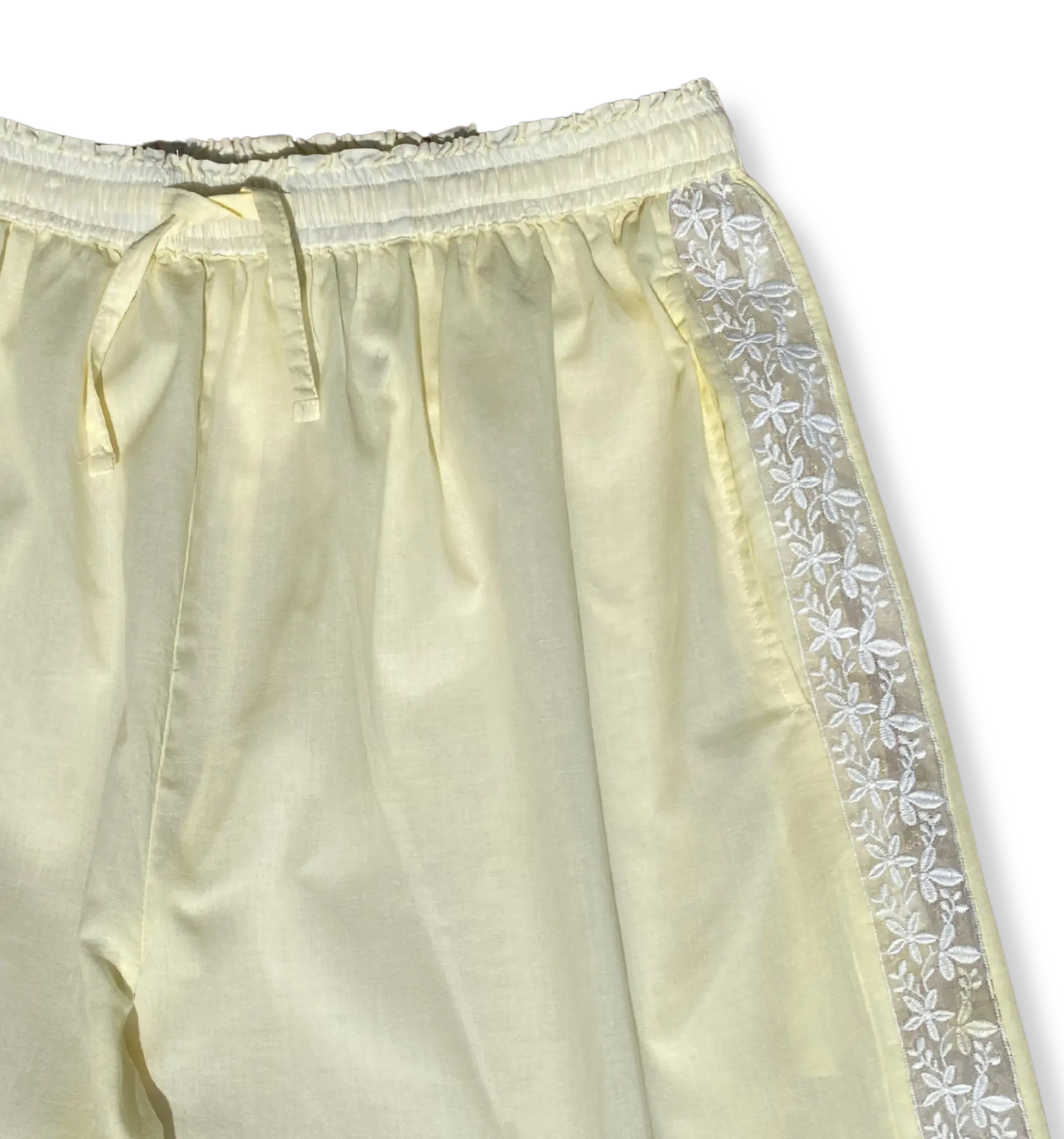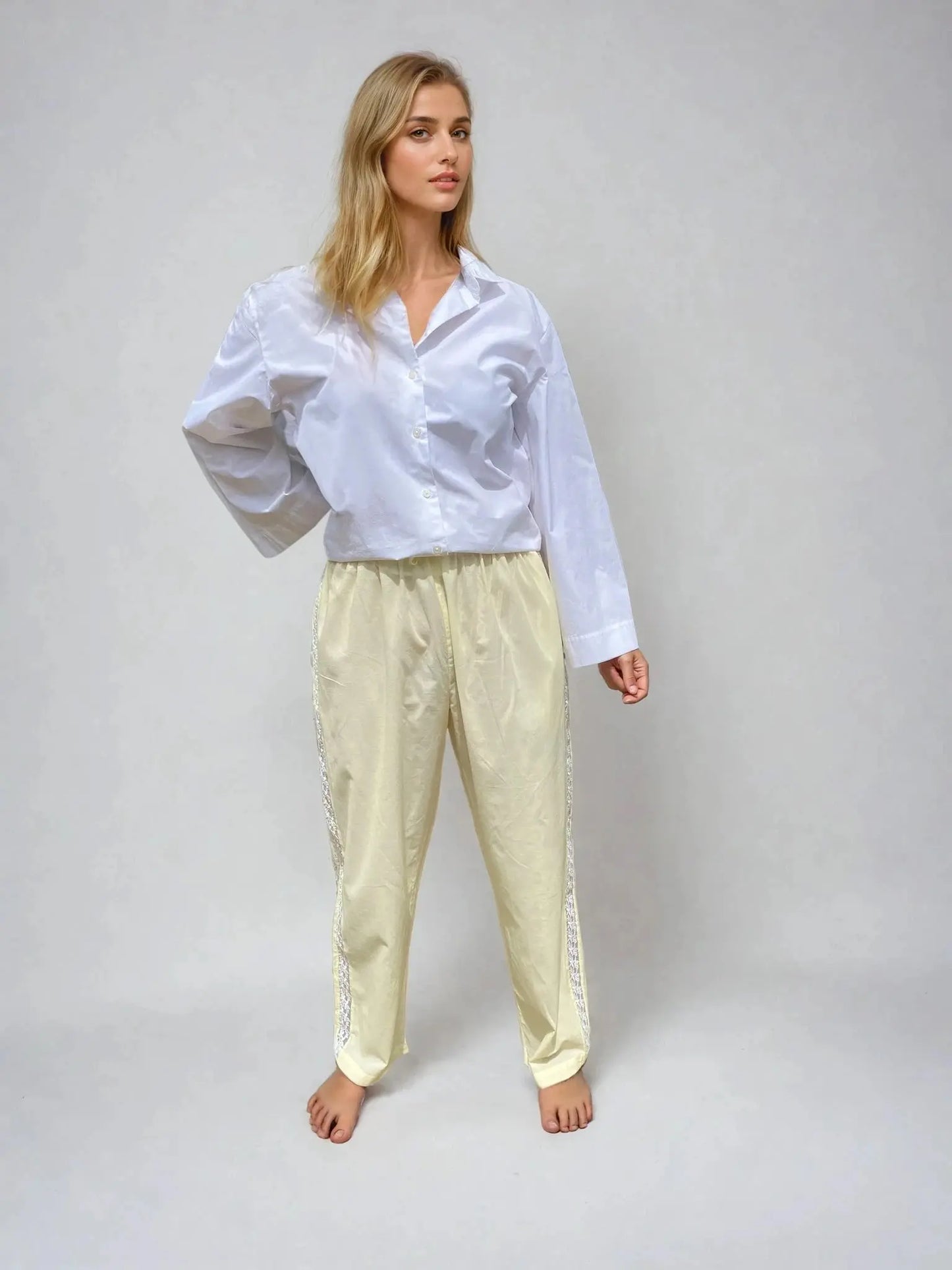 Wrap yourself in soft, breathable elegance with our Lucine pyjama trousers, crafted from 100% lightweight organic cotton. Dyed in a romantic buttermilk yellow and finished with a delicate floral side trim, these trousers blend vintage charm with modern, relaxed comfort.